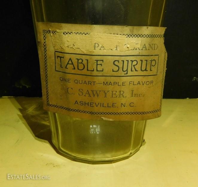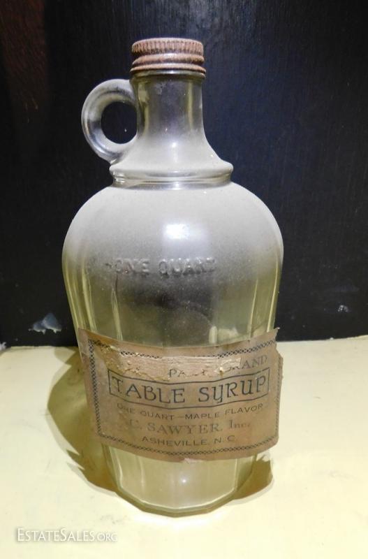 C. Sawyer, Inc. Asheville, NC Table Syrup Bottle. Label is loose. One quart bottle with metal lid.