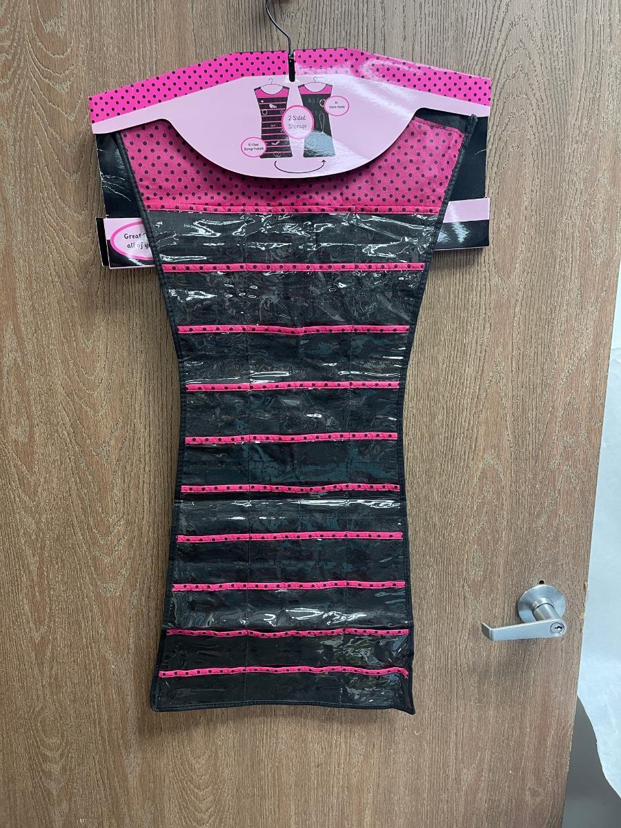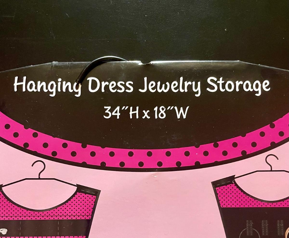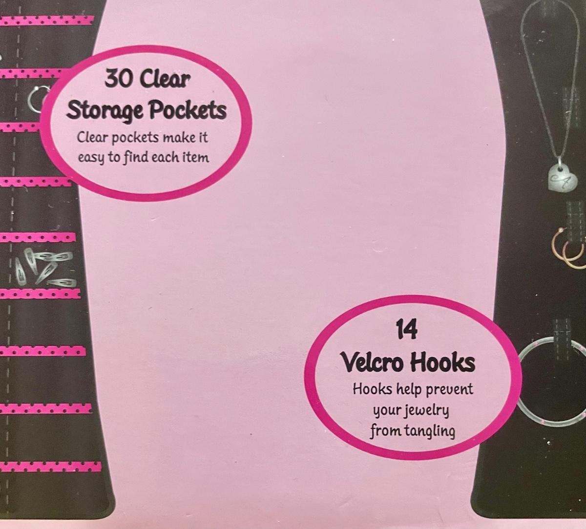 Lots of pockets and Velcro straps for holding earrings, pins and necklaces. 34” x 18”. Like new condition.