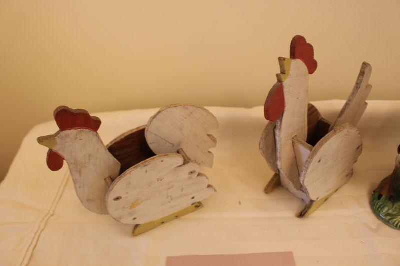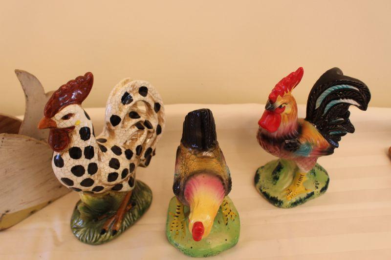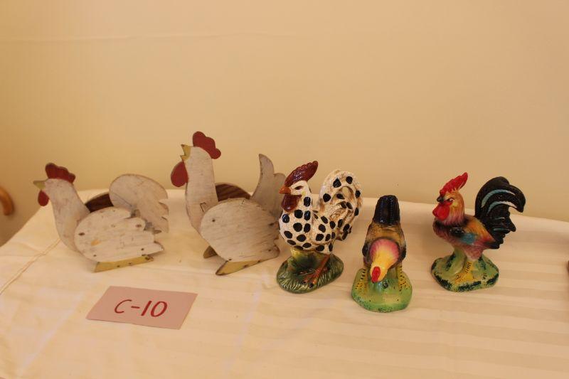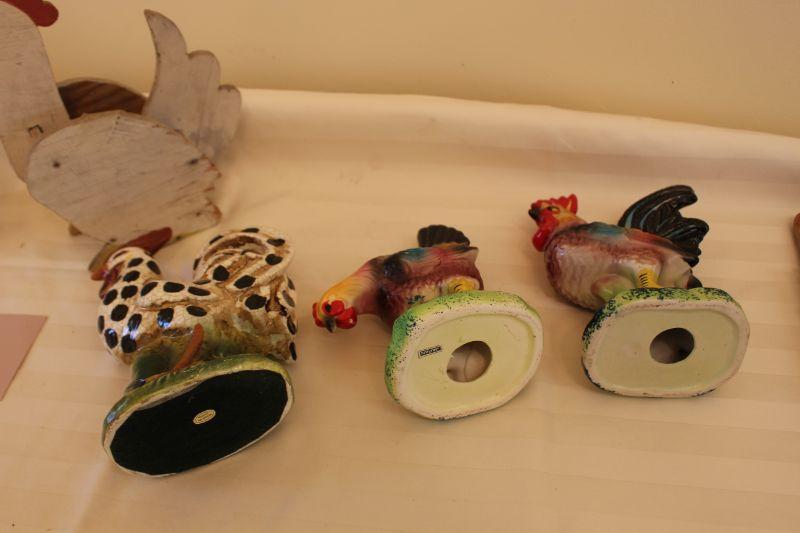 C-10 Lot Farmhouse Rooster and Chickens-2 Wood-2 Ceramics Japan-1 China Ceramics
