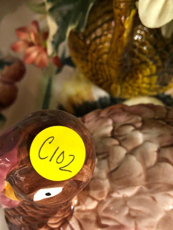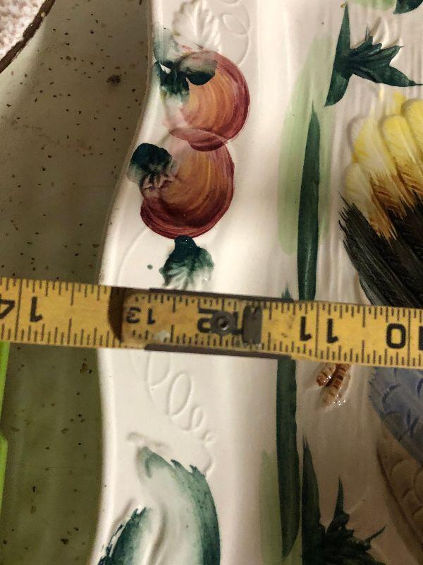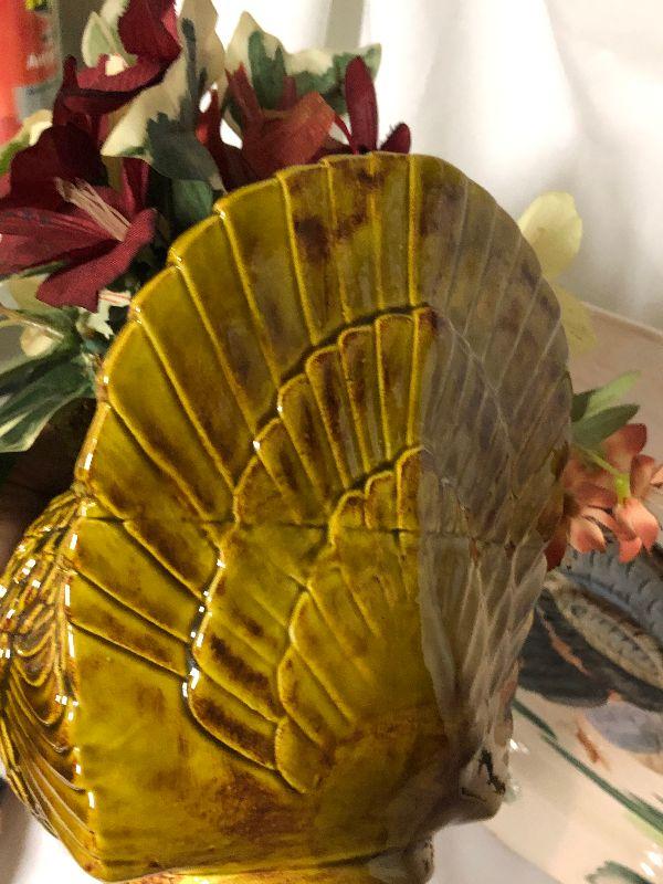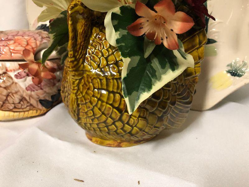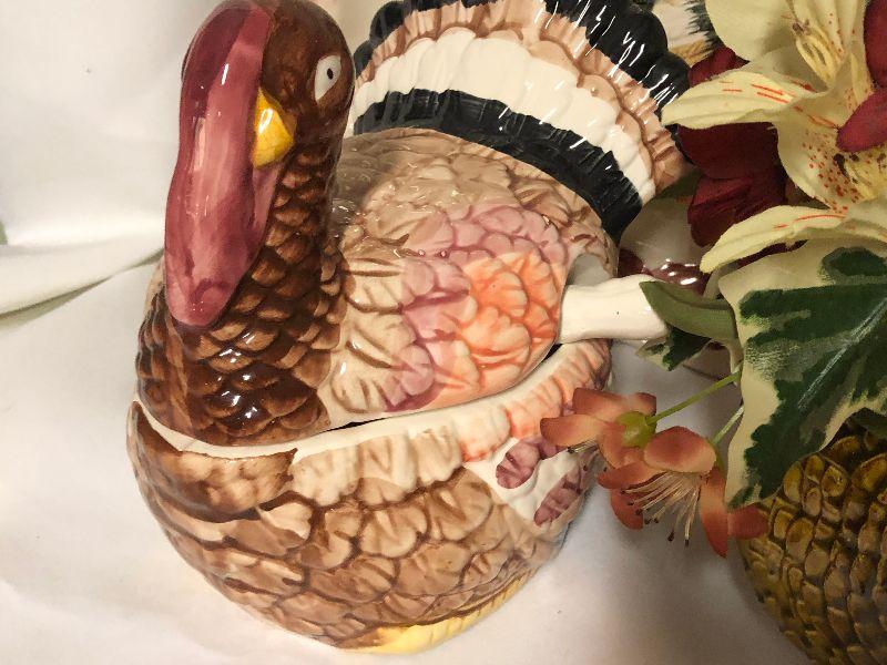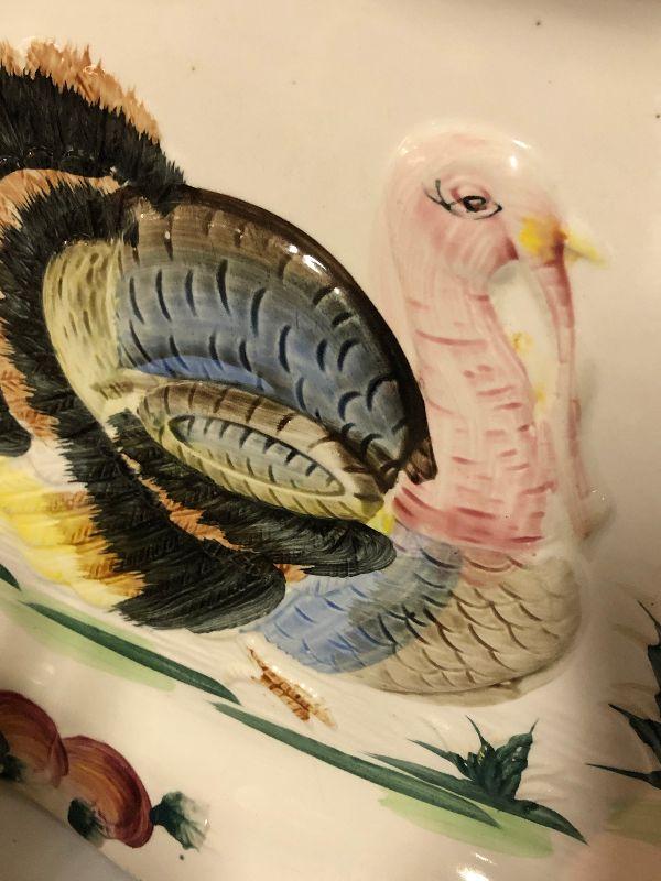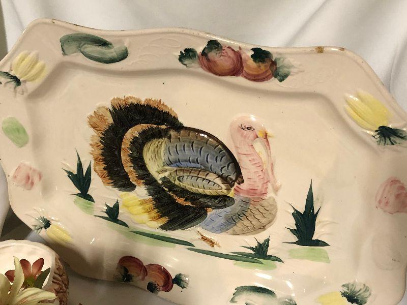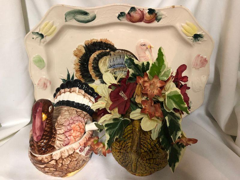 Platter with turkey painted in center, and vegetables painted around rim, chips noted, a turkey soup server with a ladle, and a ceramic turkey with flowers.