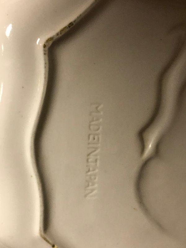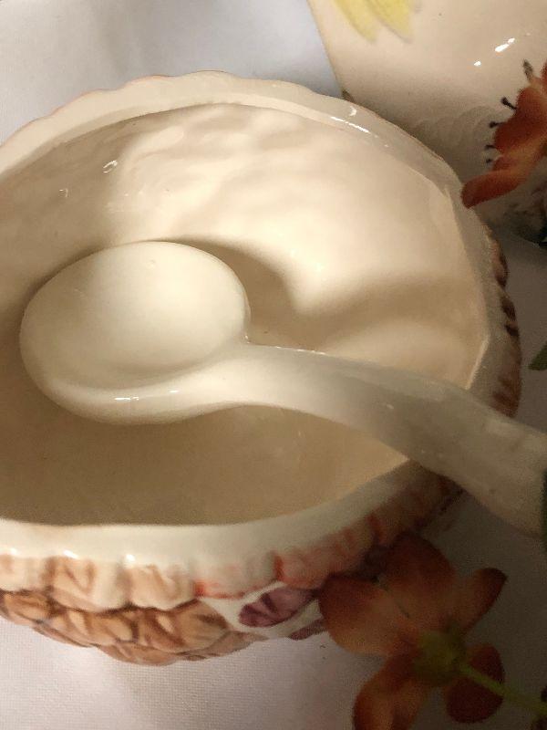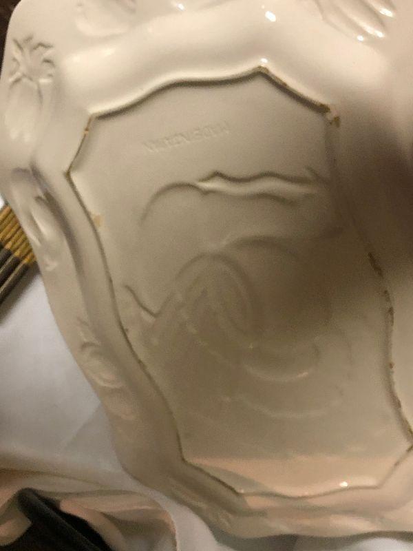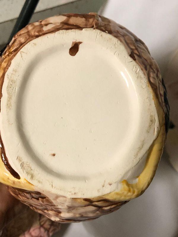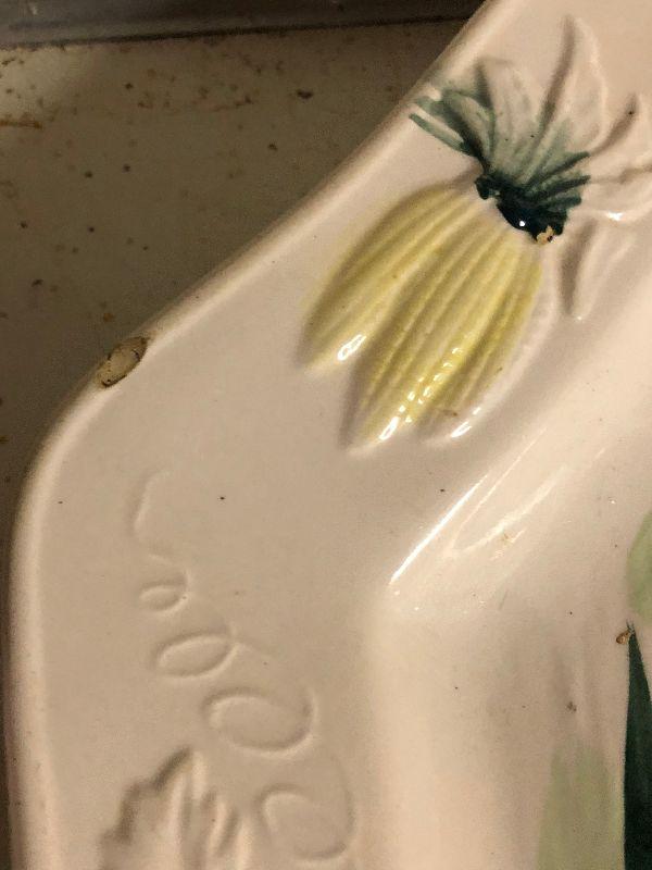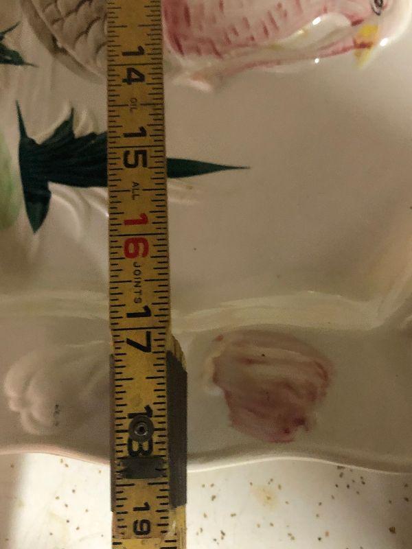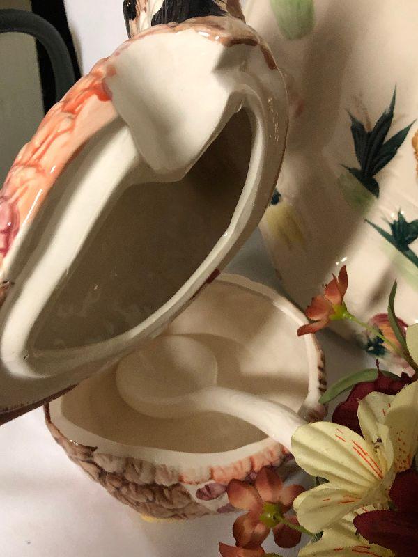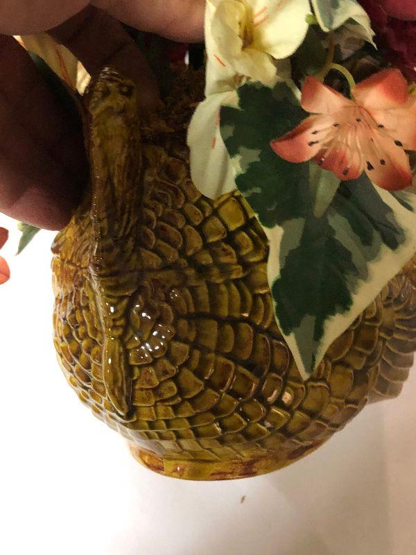 Platter with turkey painted in center, and vegetables painted around rim, chips noted, a turkey soup server with a ladle, and a ceramic turkey with flowers.