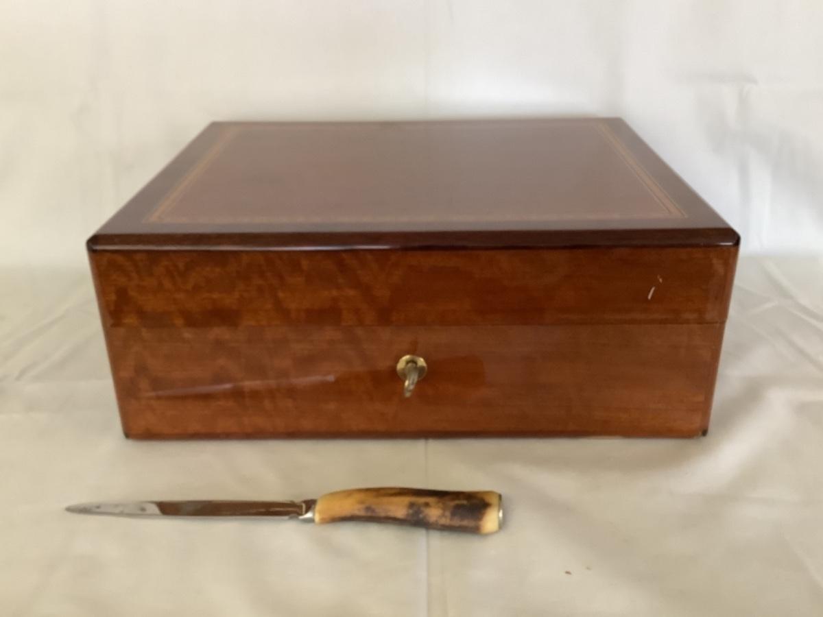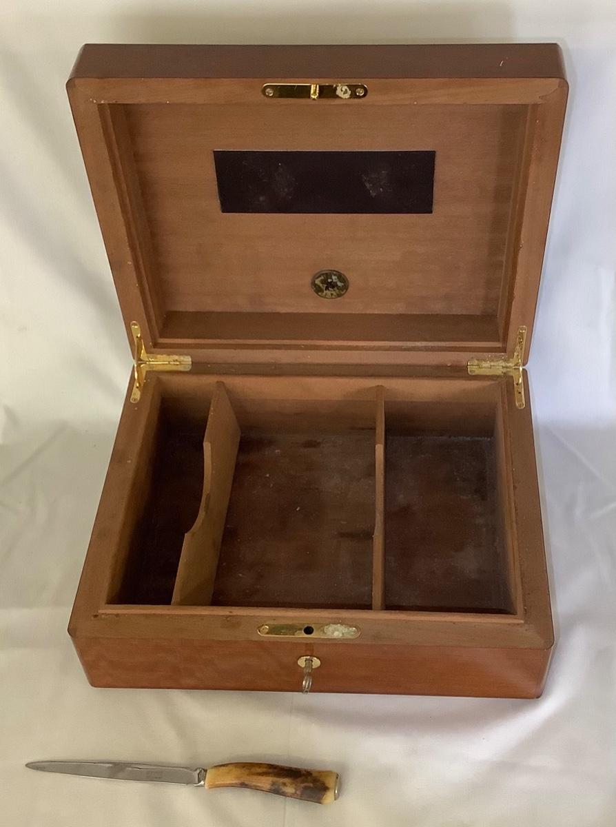 Varnished humidor with lock and key and Hoffritz letter opener with antler style handle