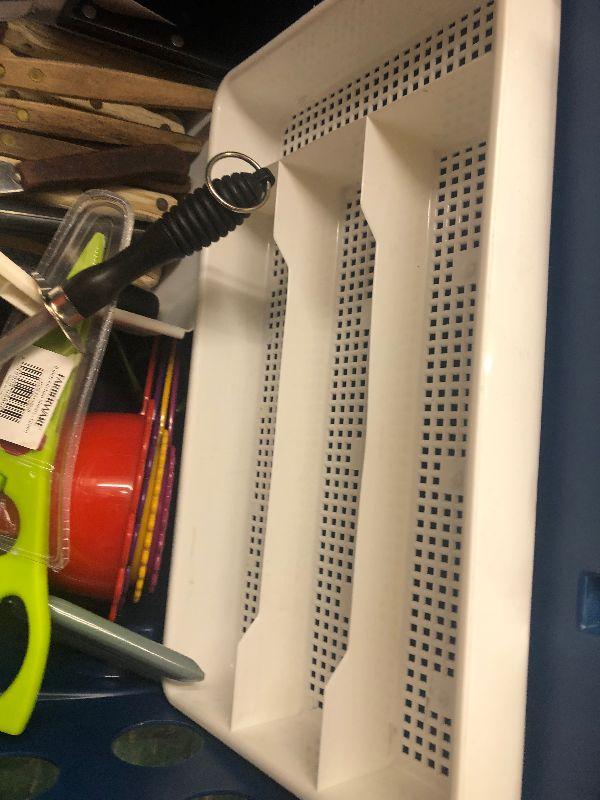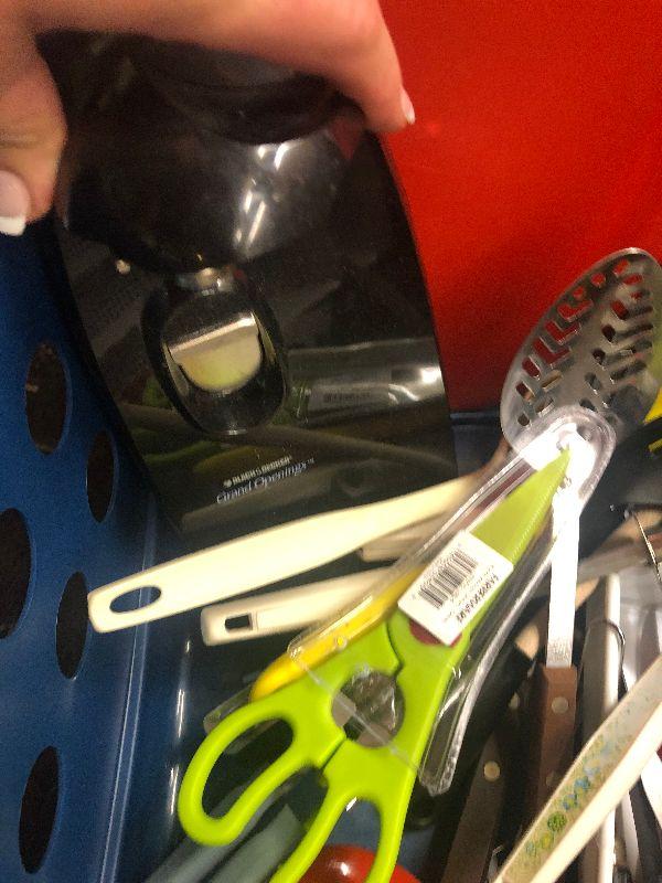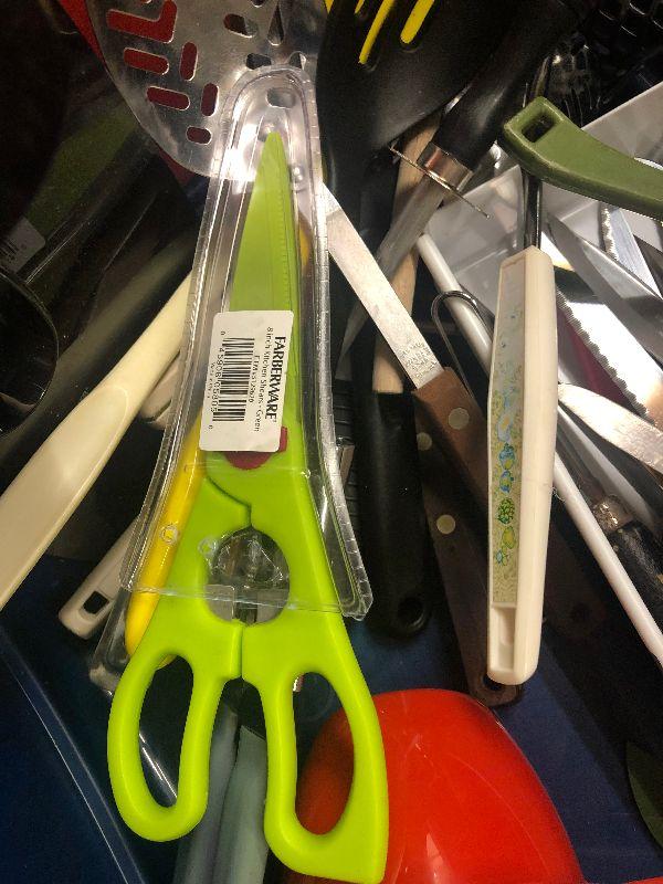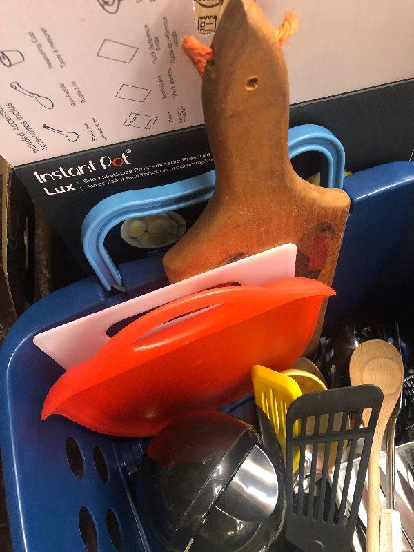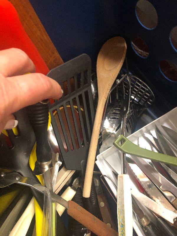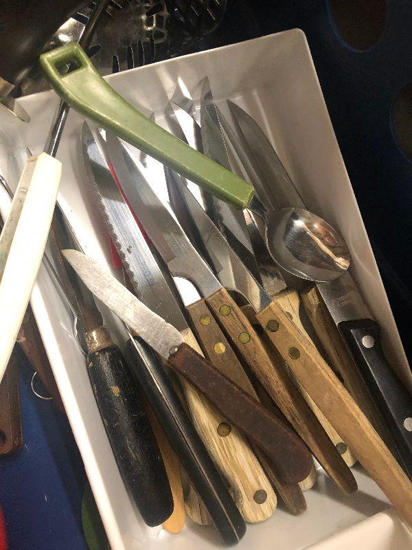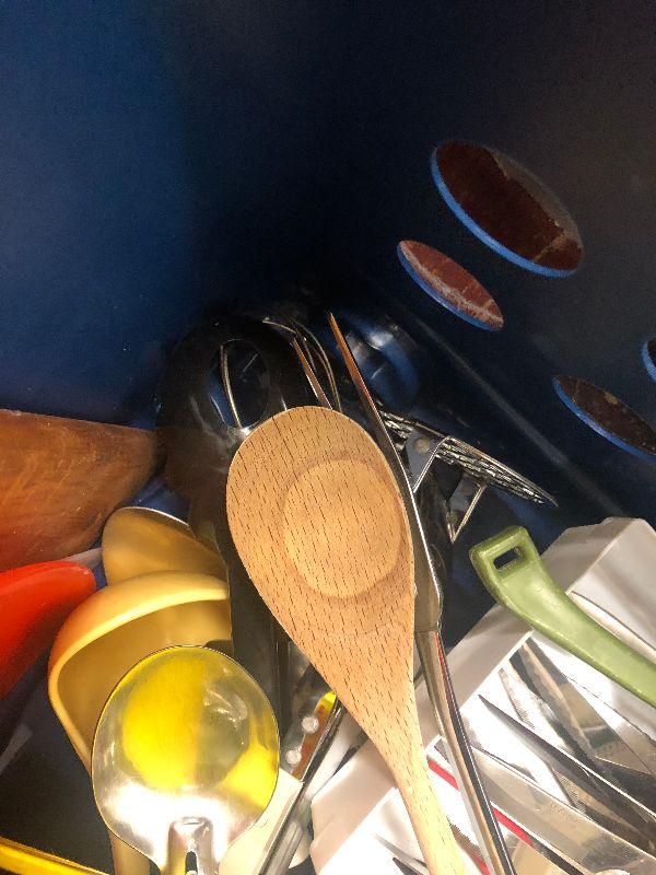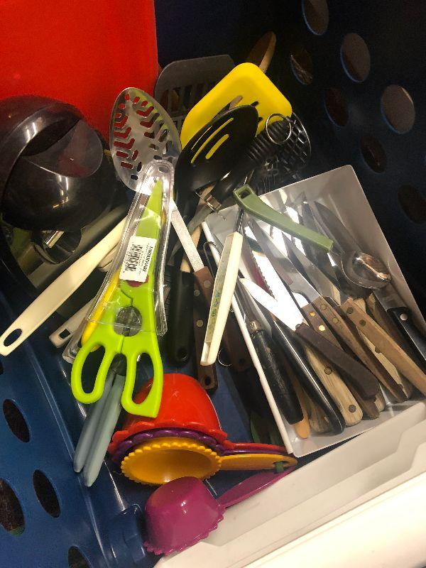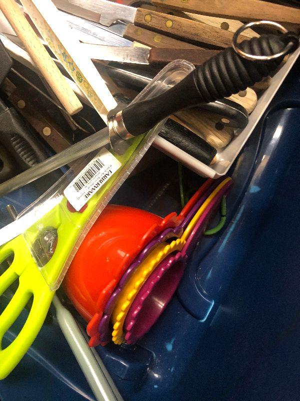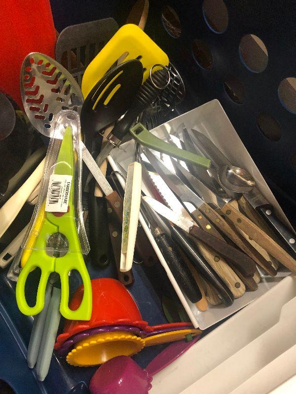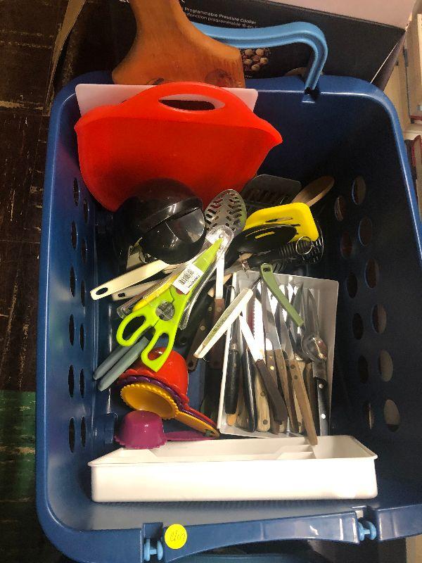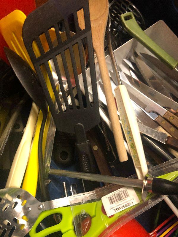 Spatulas, scissors, knives, cutting board, slotted spoons, and more. Bring box to move.