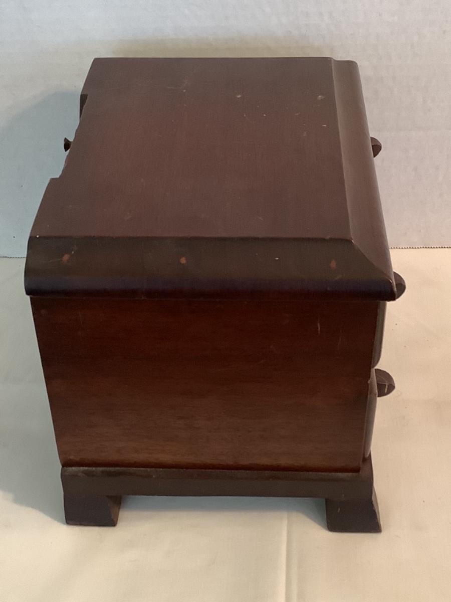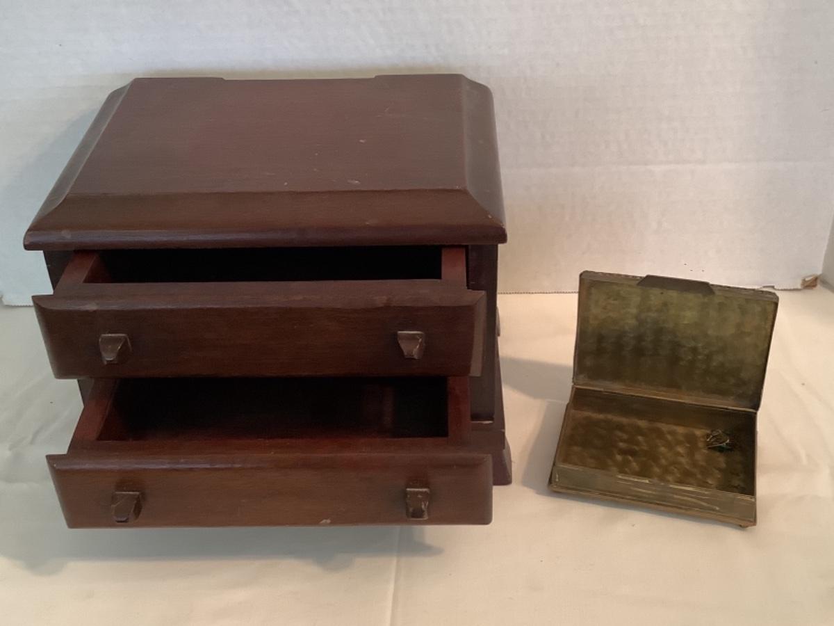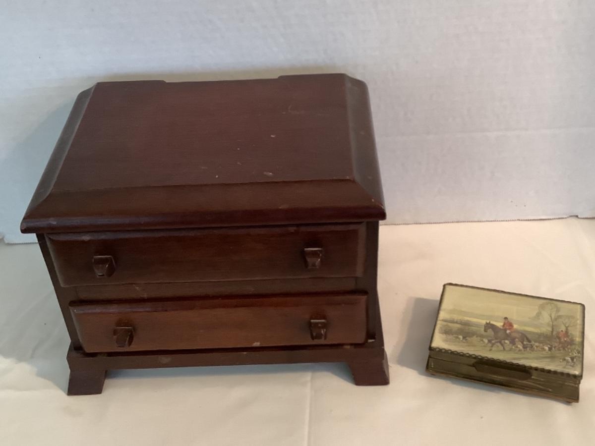 Miniature two drawer chest measures 10” x 7” x 7-1/2” tall, Brass box with hunt scene measures 4-1/2” x 3” x 1-1/4” tall