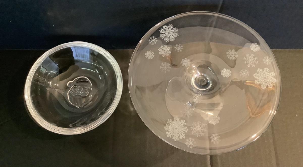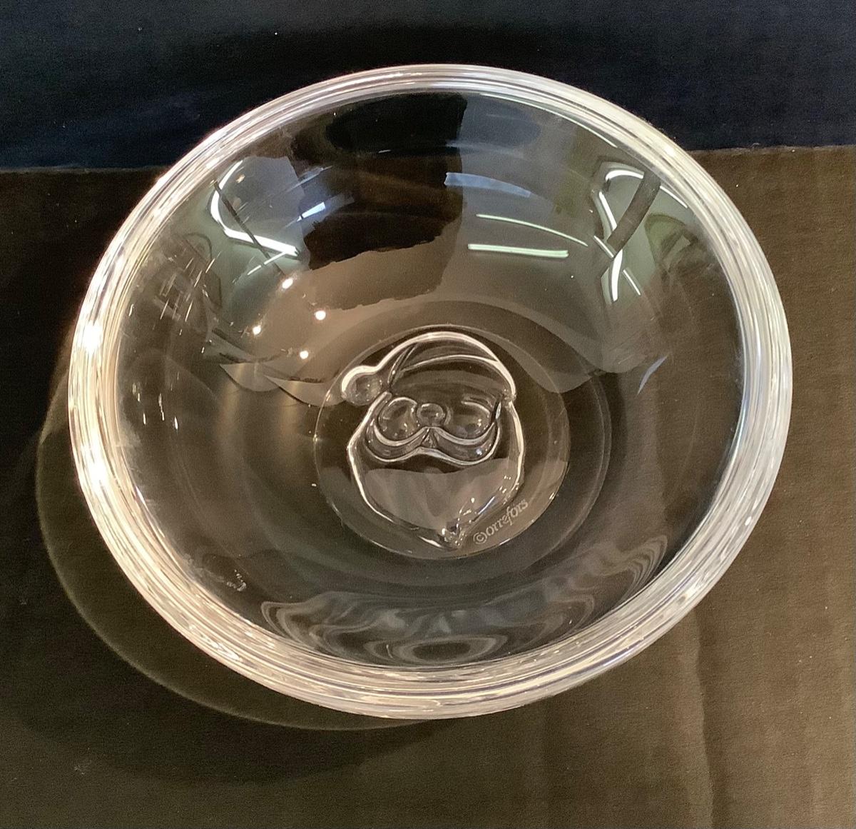 Orrefors crystal Marlin Lindahl Pedestal Cake Plate measuring 4-3/4” round and 7-1/4” tall comes with original box, Orrefors crystal Santa bowl measuring 5-1/2” round and 2” deep