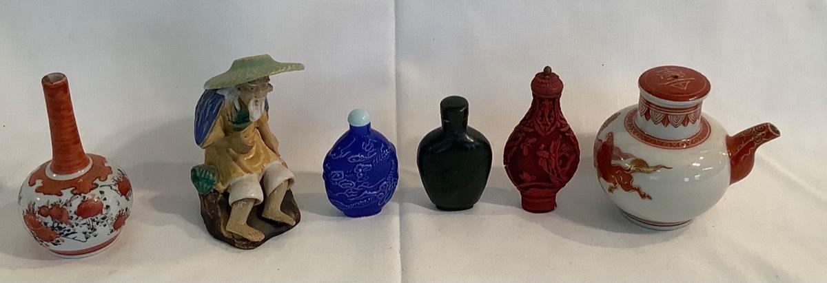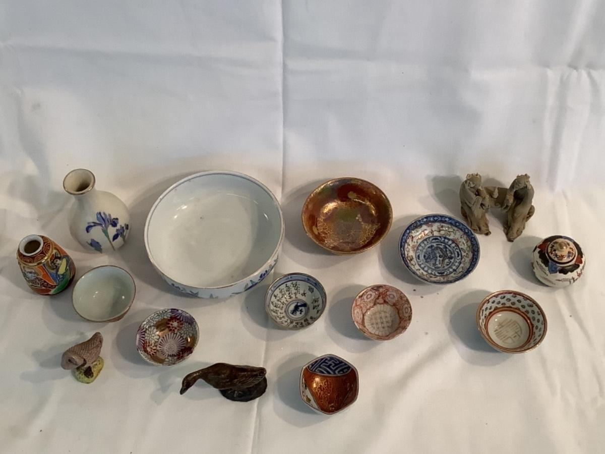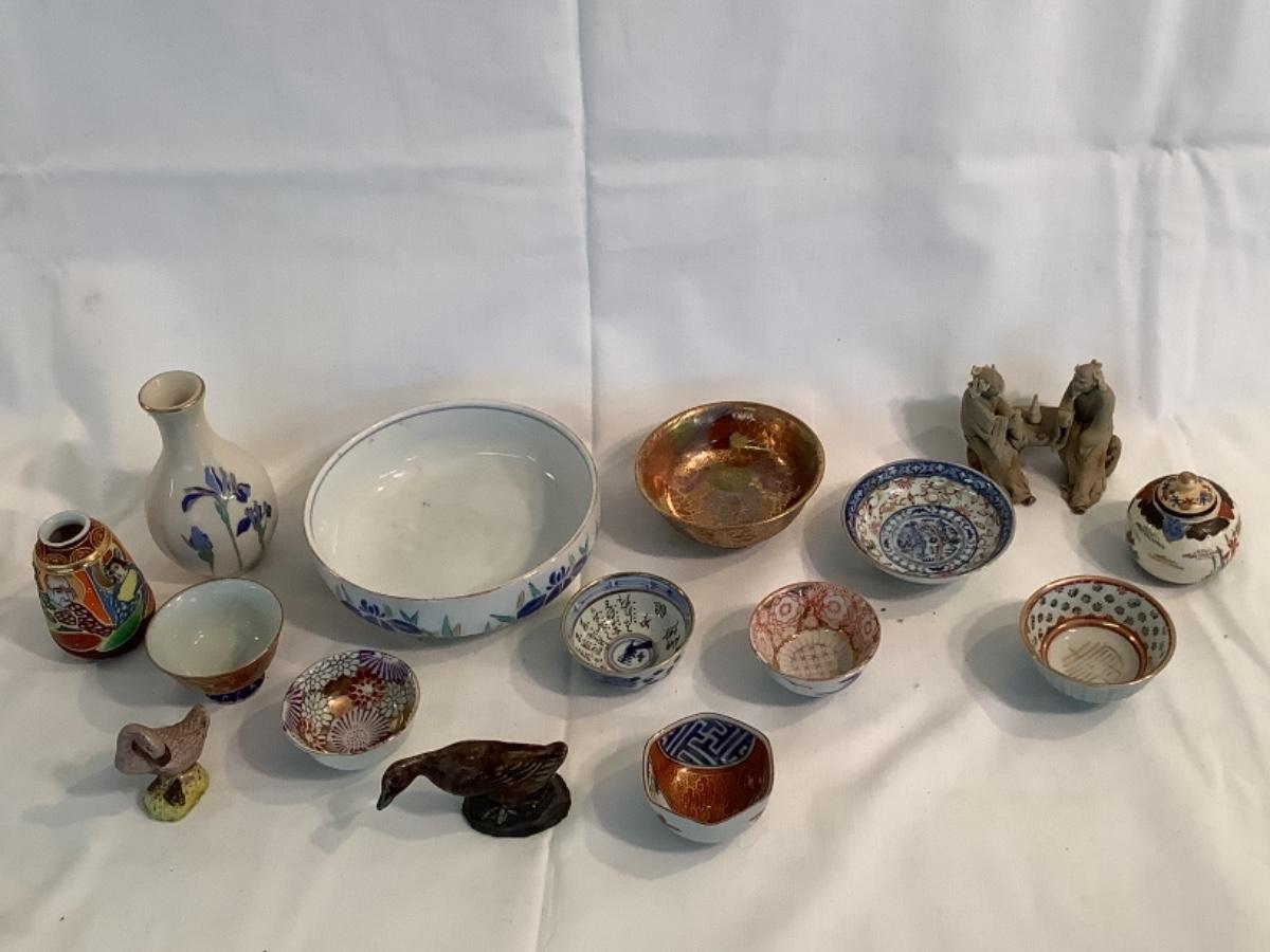 Lot of assorted miniature Asian decor including 2 miniature vases, 9 miniature bowls, 1 miniature Ginger Jar with lid, 2 pottery duck figurines, pottery and 1 mudmen sitting on bench figure