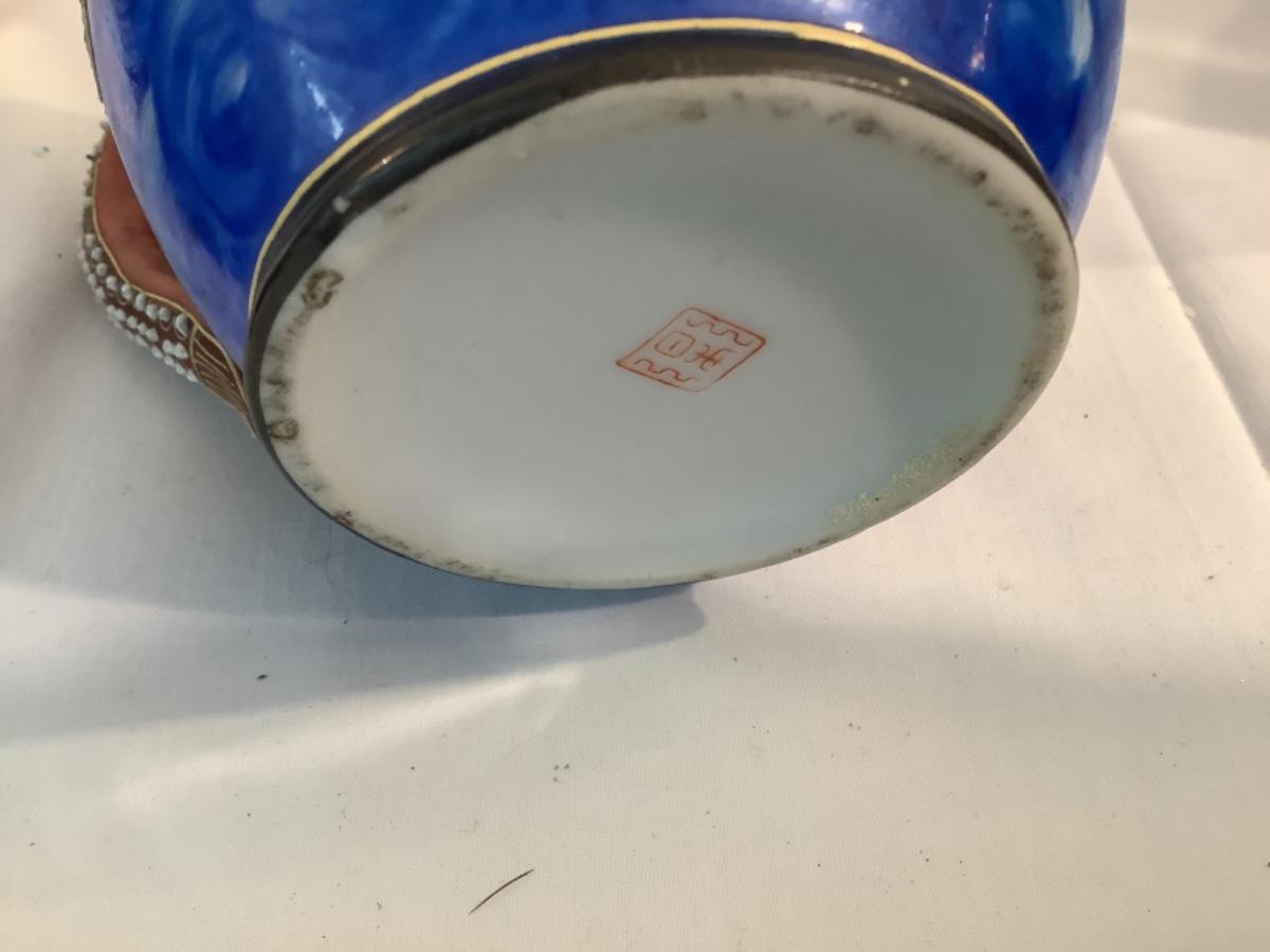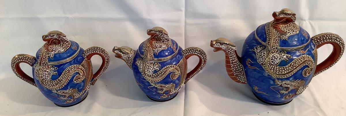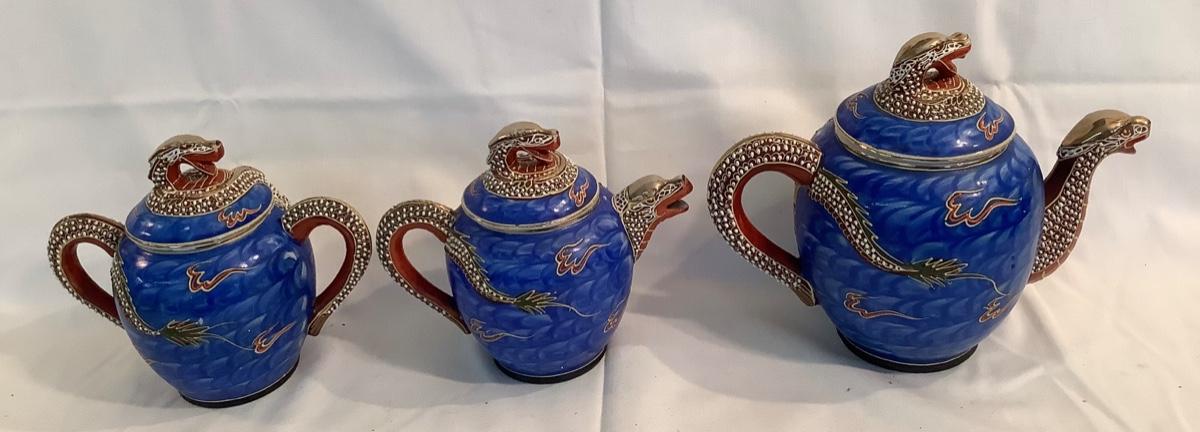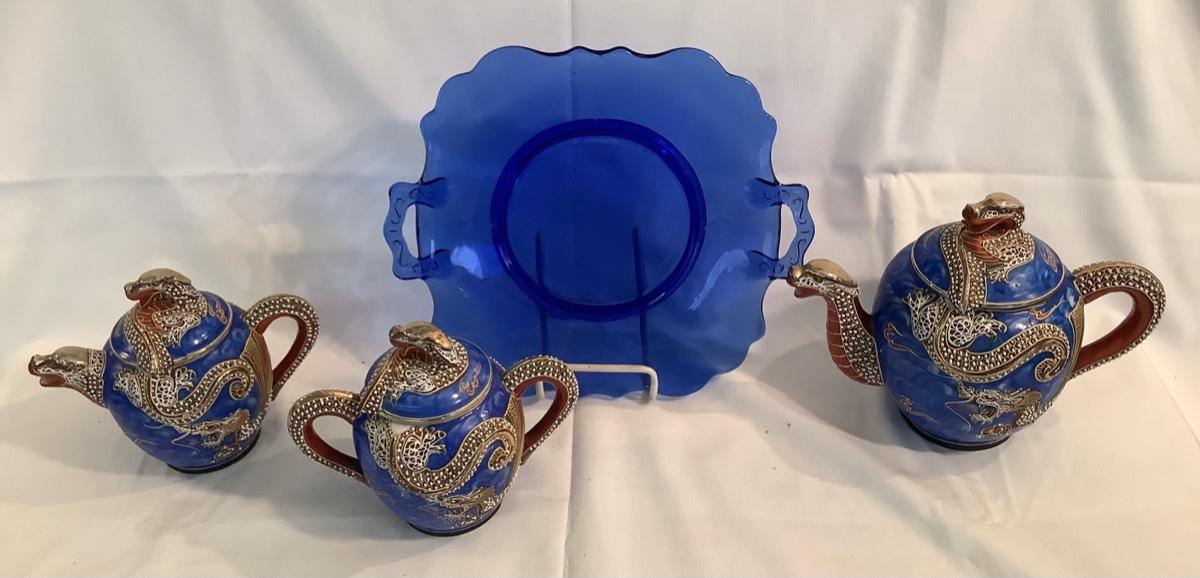 C1100 Japanese Moriage Three Piece Dragon Tea Set and Blue Glass Square Serving Plate with Handles