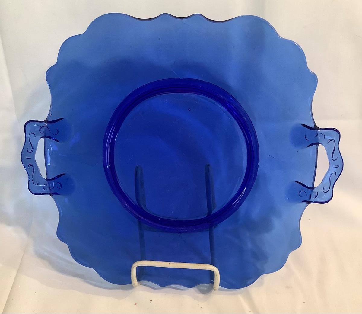 Japanese Moriage three piece Dragon tea set includes- Tea pot with lid, cream pourer with lid and two handled sugar bowl with lid. Blue glass serving plate with two handles, has some scratches on bottom, measures 10” x 10” square not including handles
