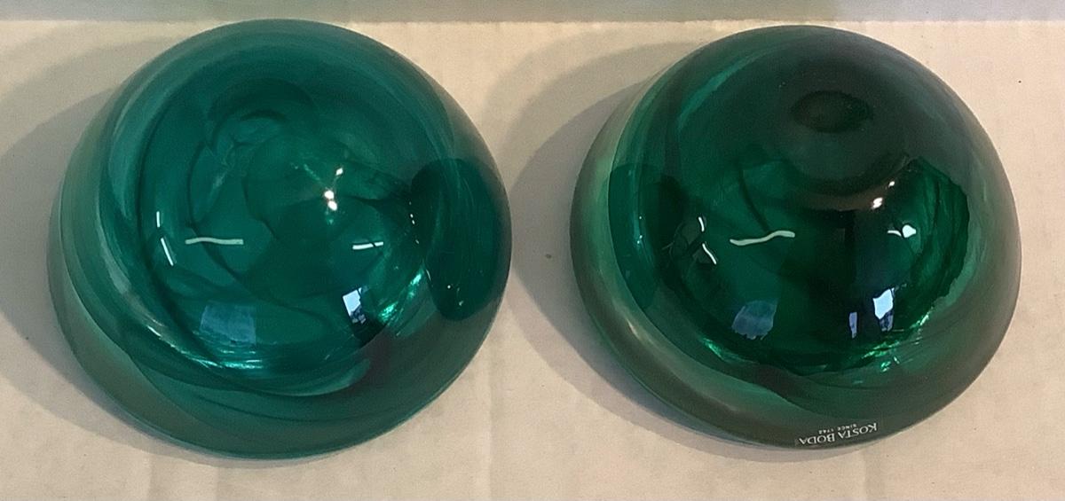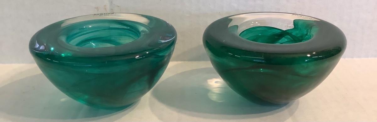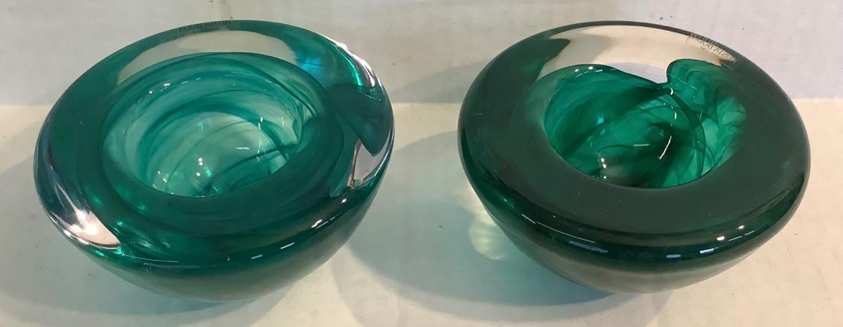 C1102 Pair of Green Swirl Kosta Boda Art Glass Votive Candle Holders