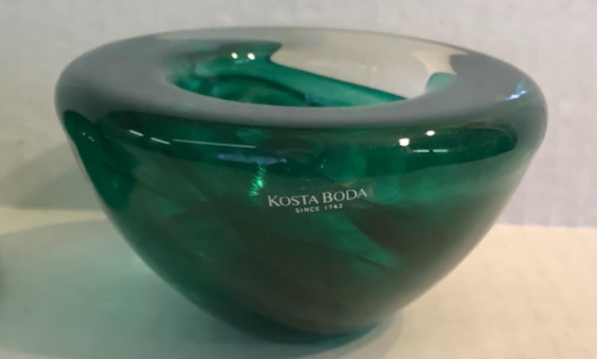 Pair of green swirl Kosta Boda art glass votive candle holders designed by Anna Ehrner measuring 7-1/2” round and 3” deep