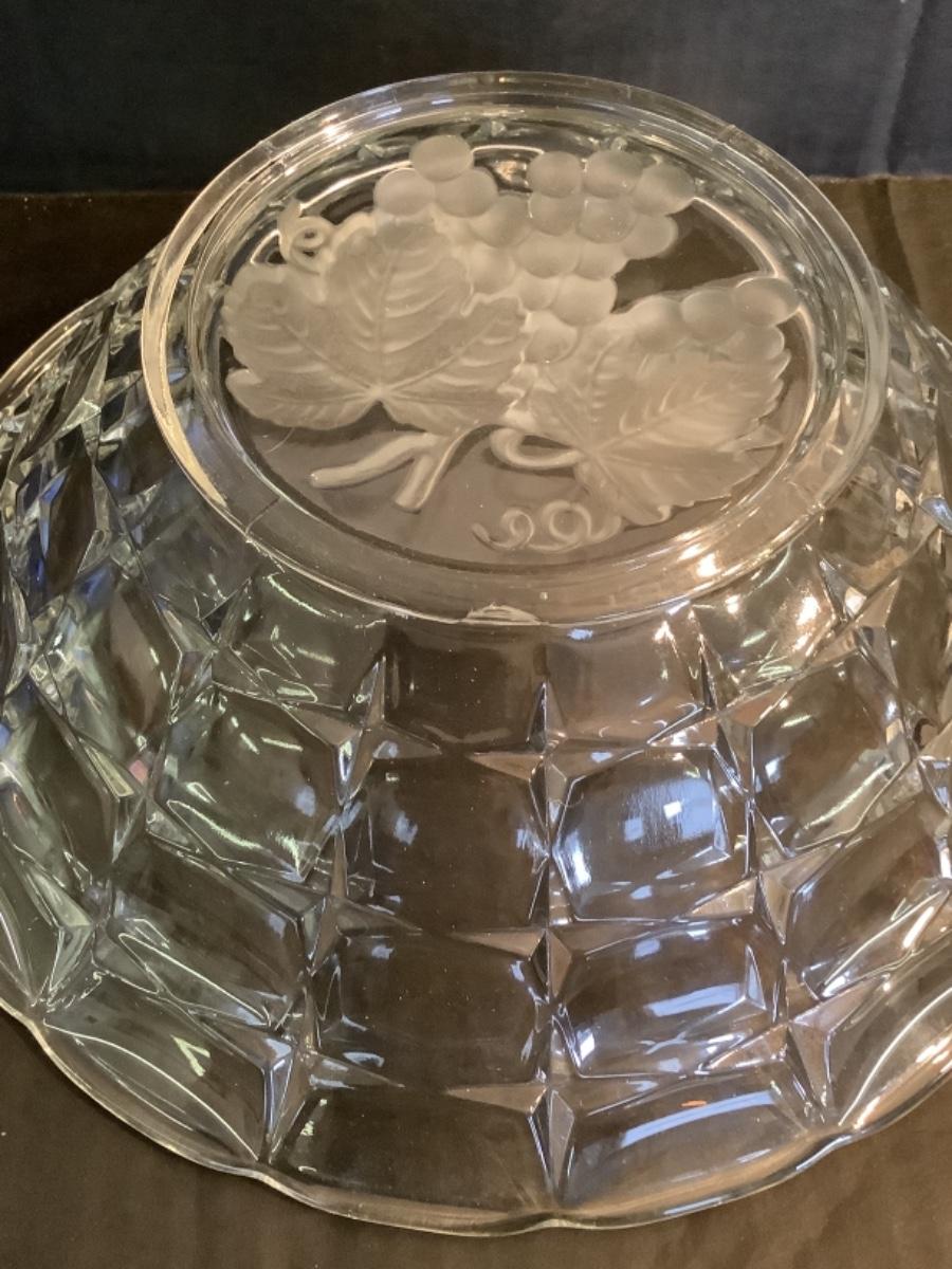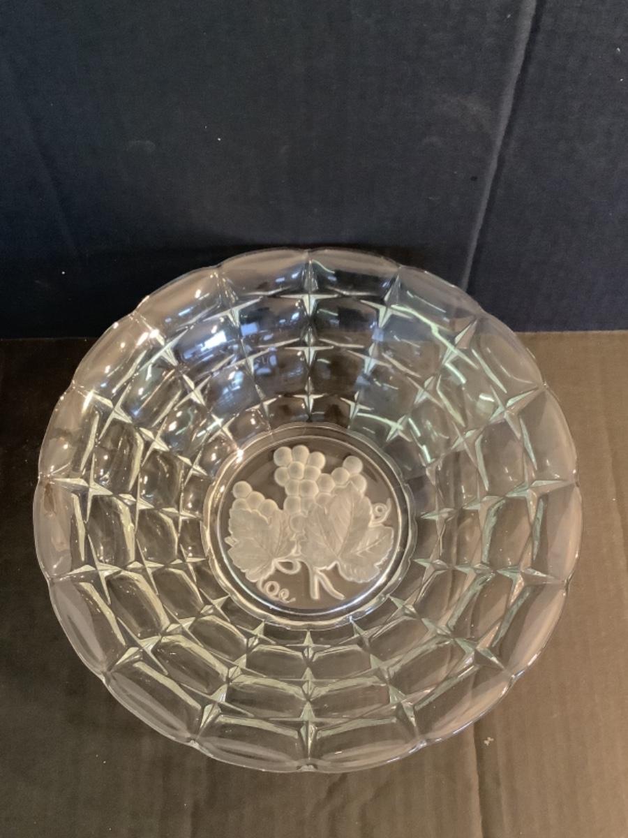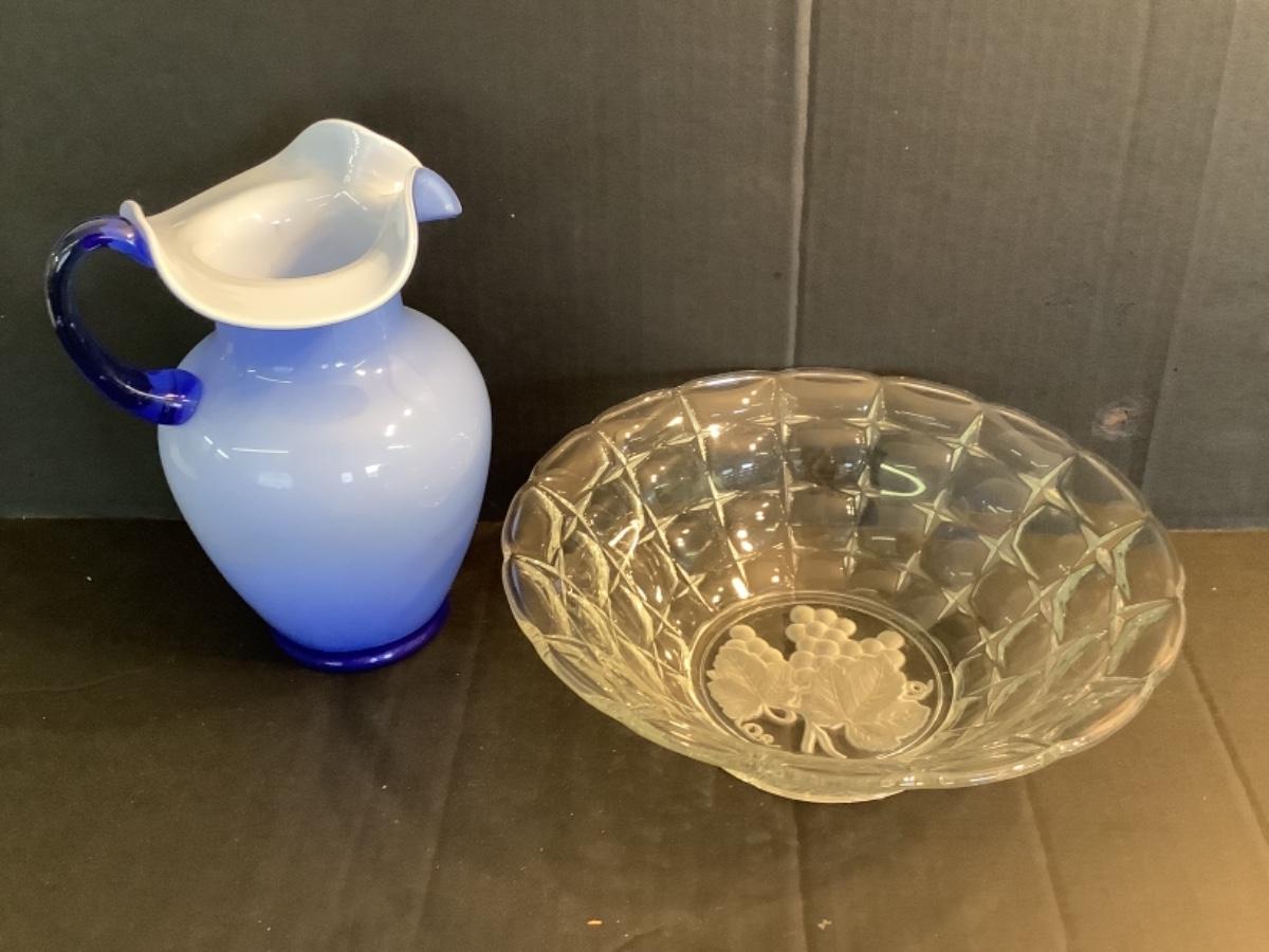 Hand blown cased glass pitcher measures 9” tall, Vintage etched glass serving bowl measures 11” round and 4” deep, has a small chip on bottom