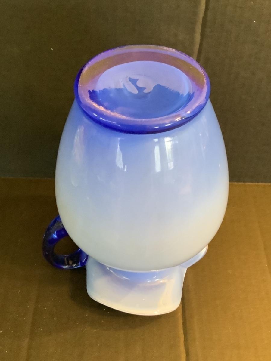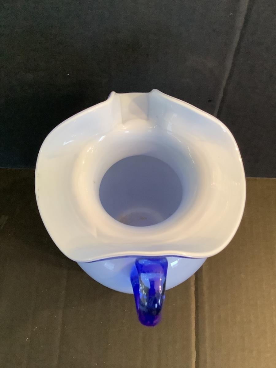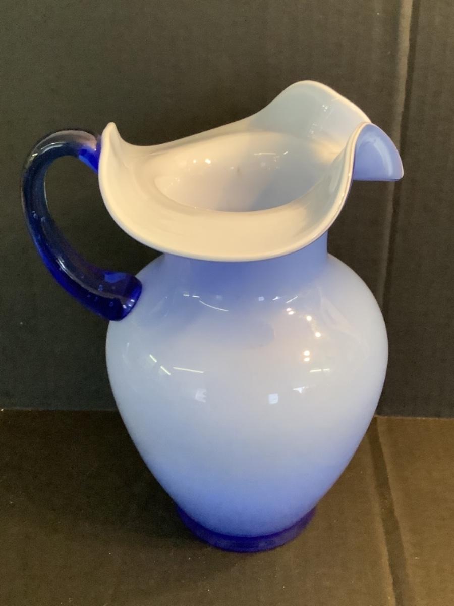 Hand blown cased glass pitcher measures 9” tall, Vintage etched glass serving bowl measures 11” round and 4” deep, has a small chip on bottom