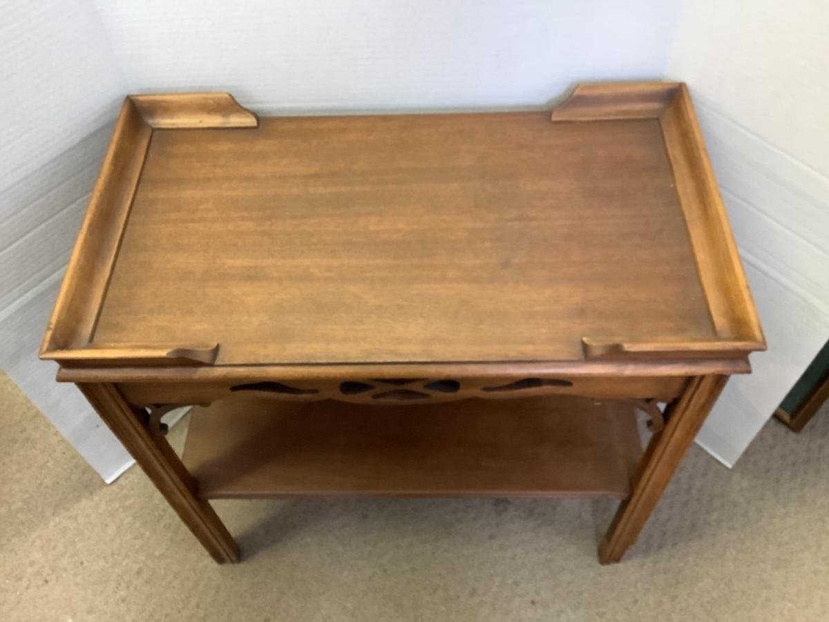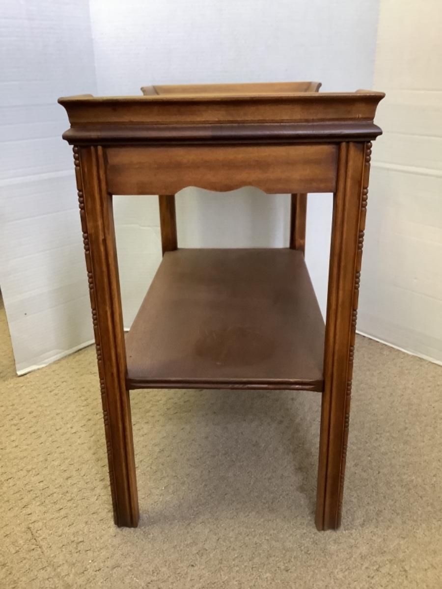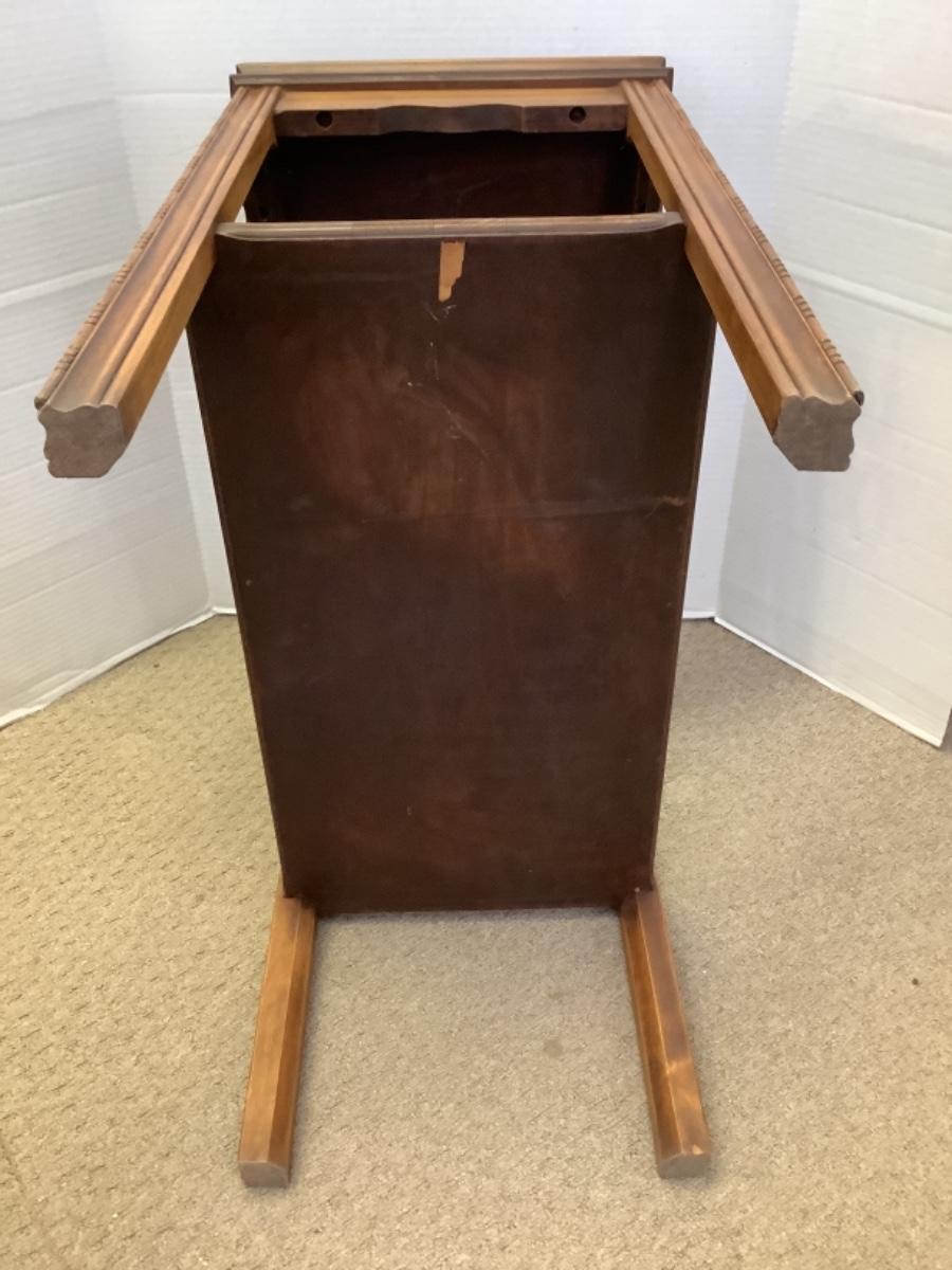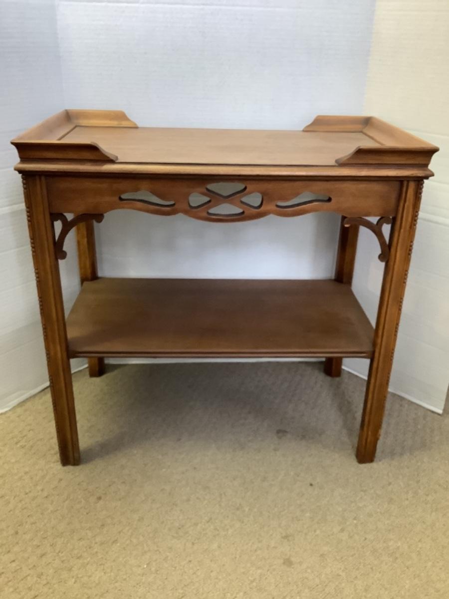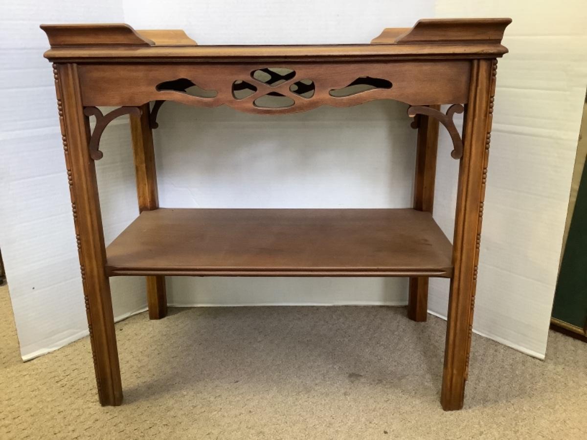Mahogany side table with shelf measures 24-1/2” high 25” wide and 14” deep, see photos for any damage or flaws