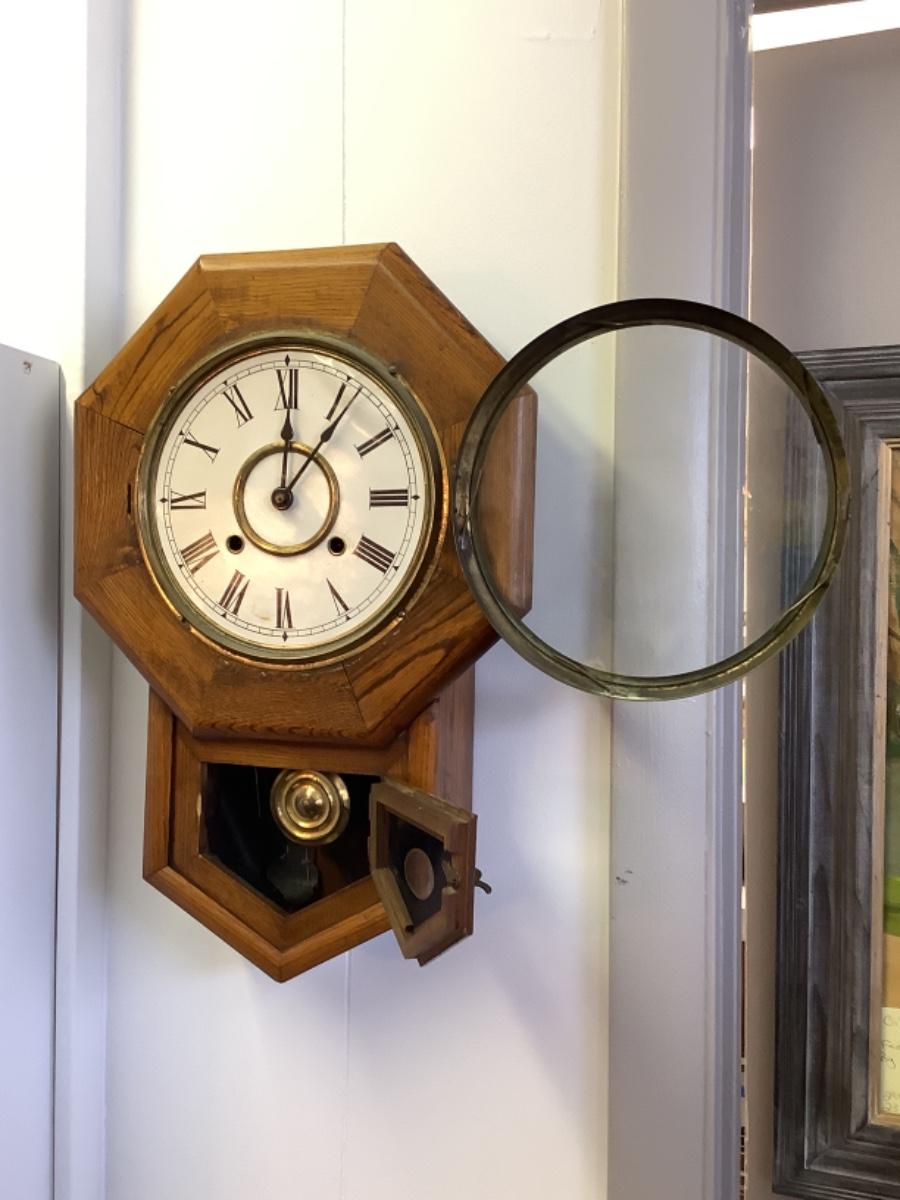 Oak Wall Clock measuring 18” tall 13” wide and 4” deep, no makers mark