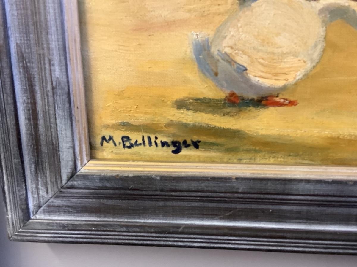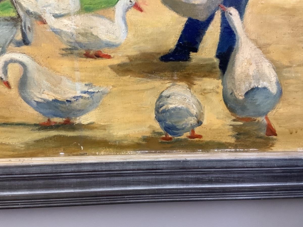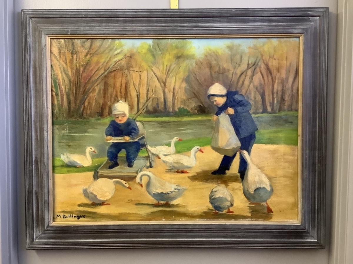 Signed framed oil painting on canvas by M. Bellinger of “Children Feeding Geese”, frame measures 29-1/2” wide 23-1/2” high, has some very minor damage on bottom of painting (see photos)