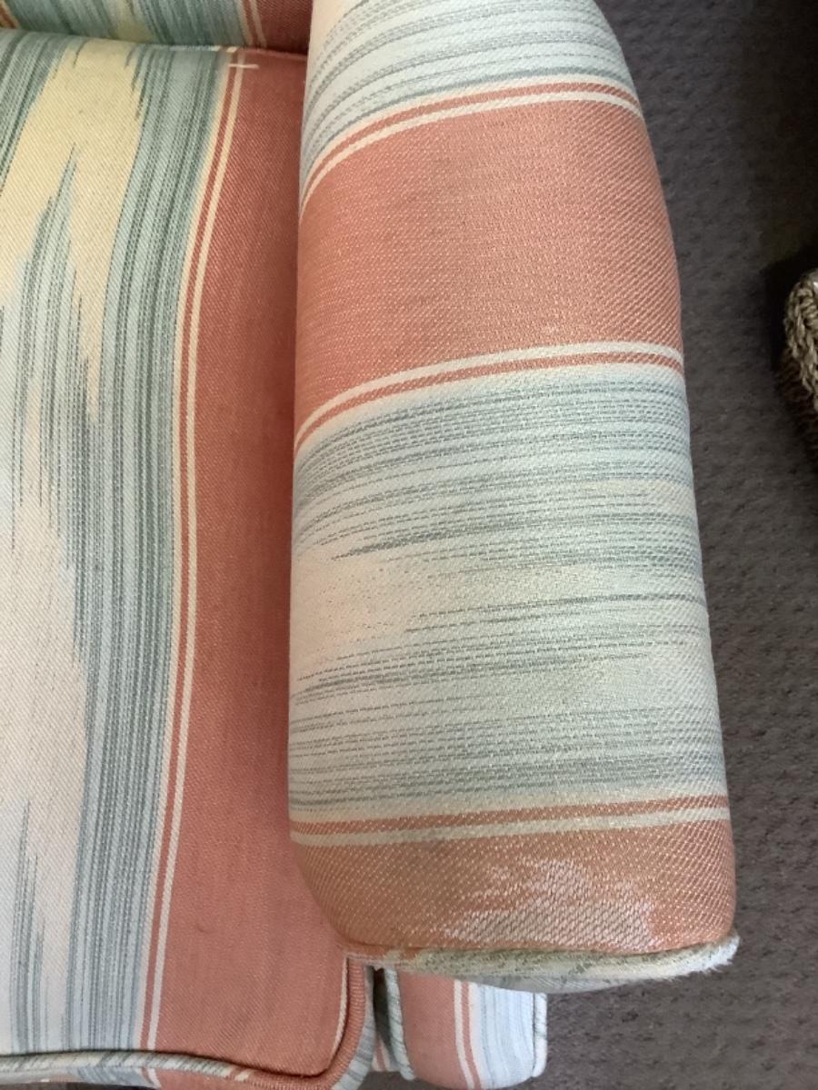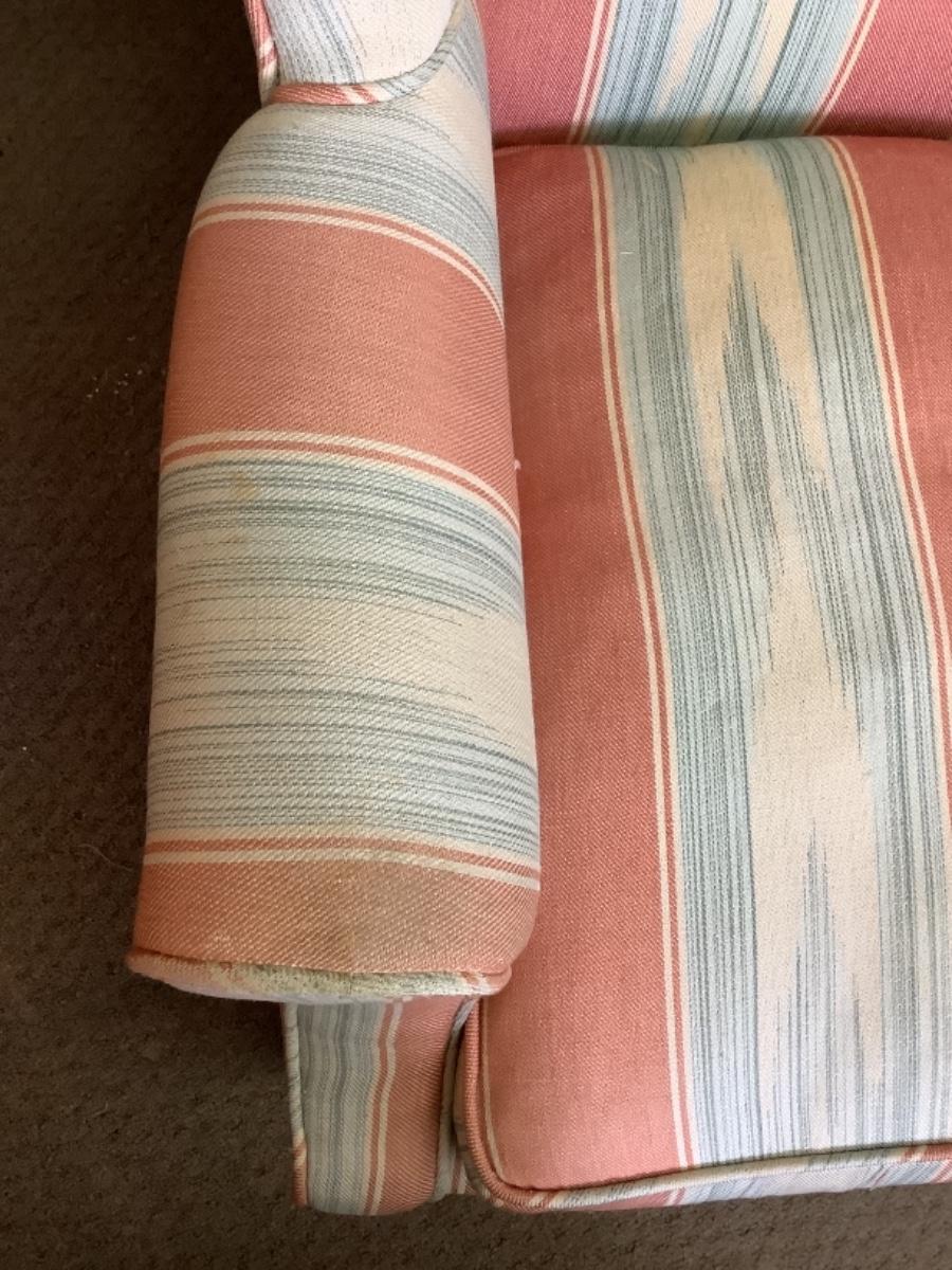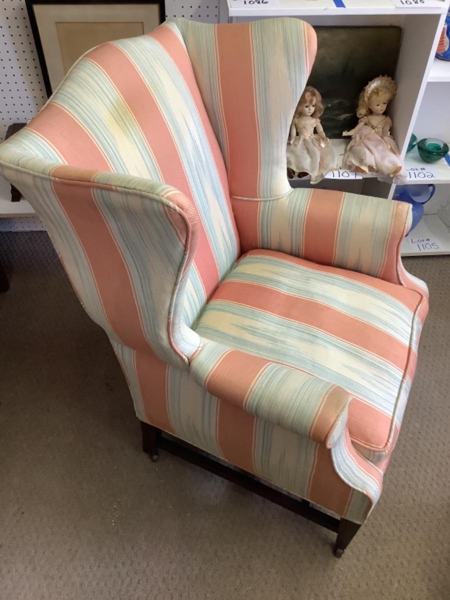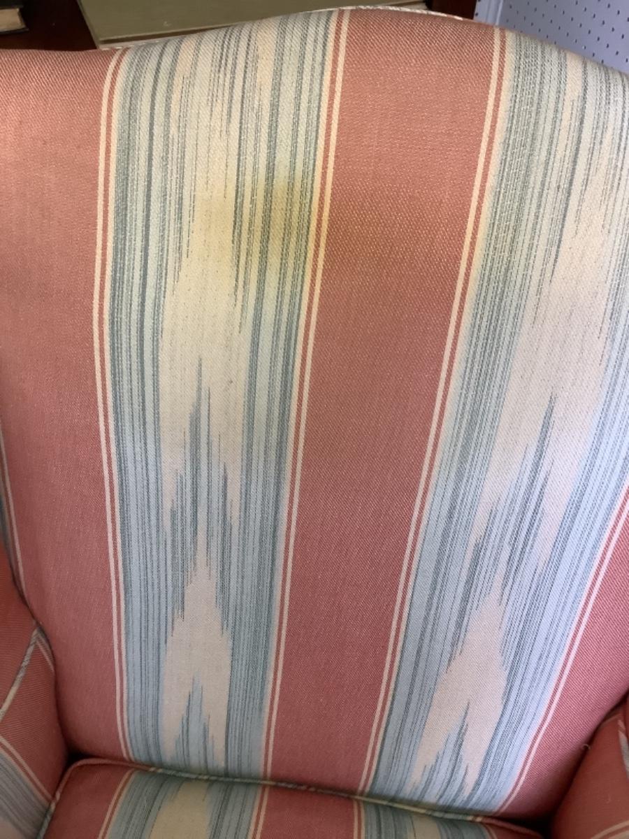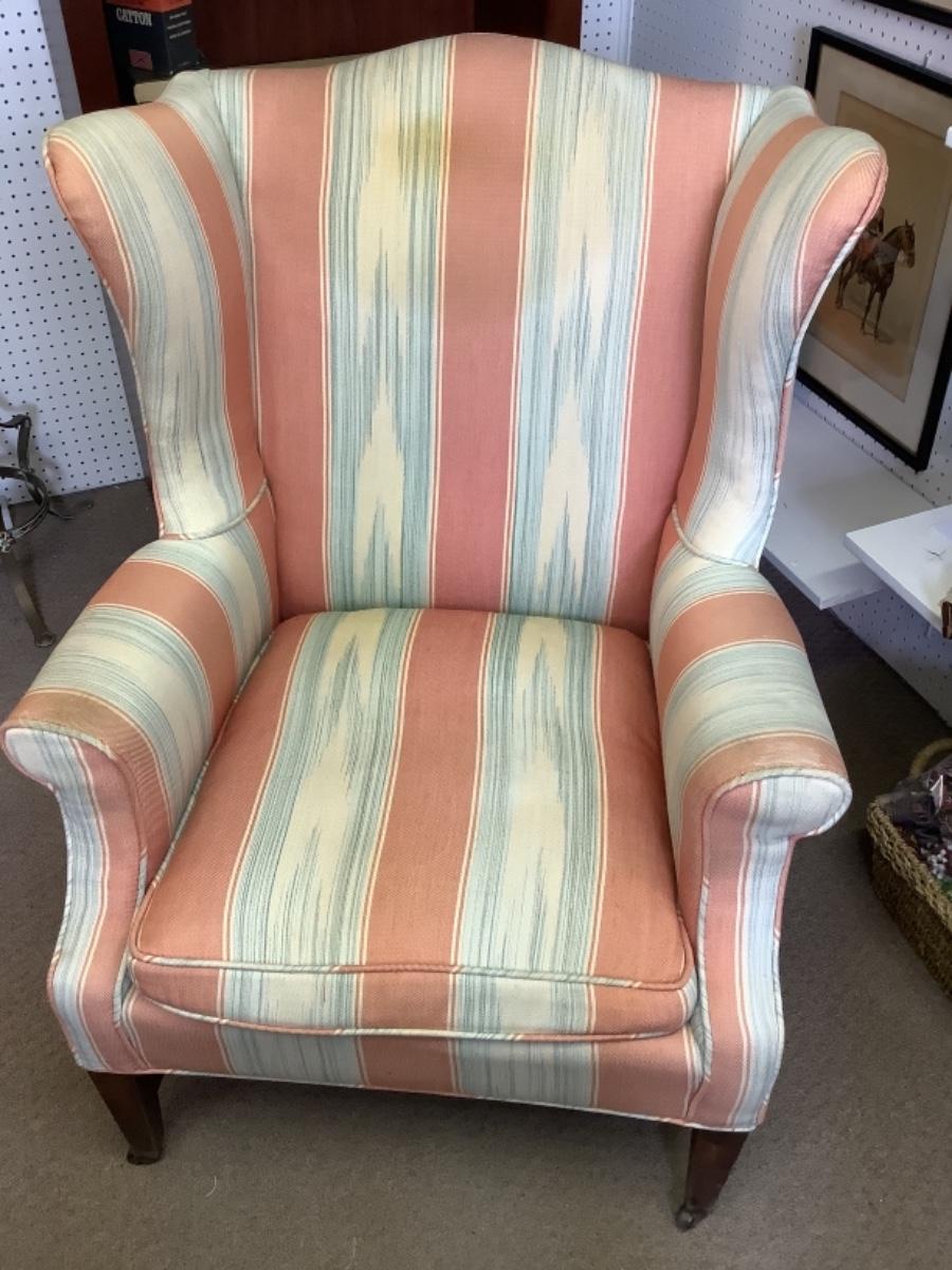 Upholstered wing back chair with down filled cushion measures 30” wide 25” deep 38” tall and has an 18” seat height, does have some spots please see photos