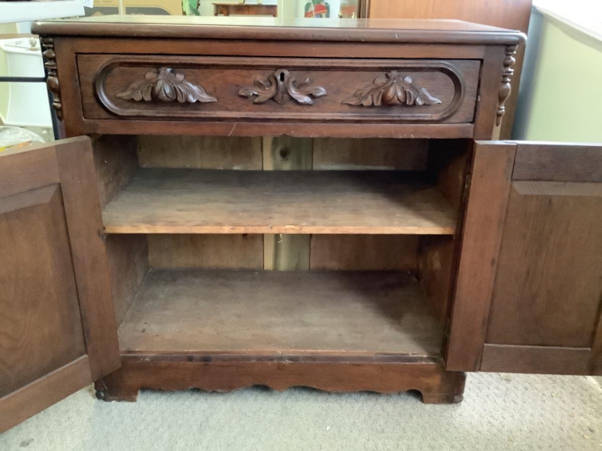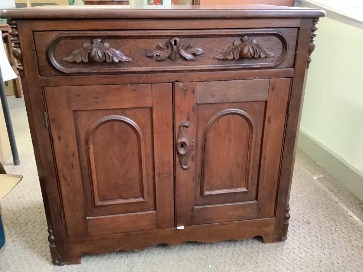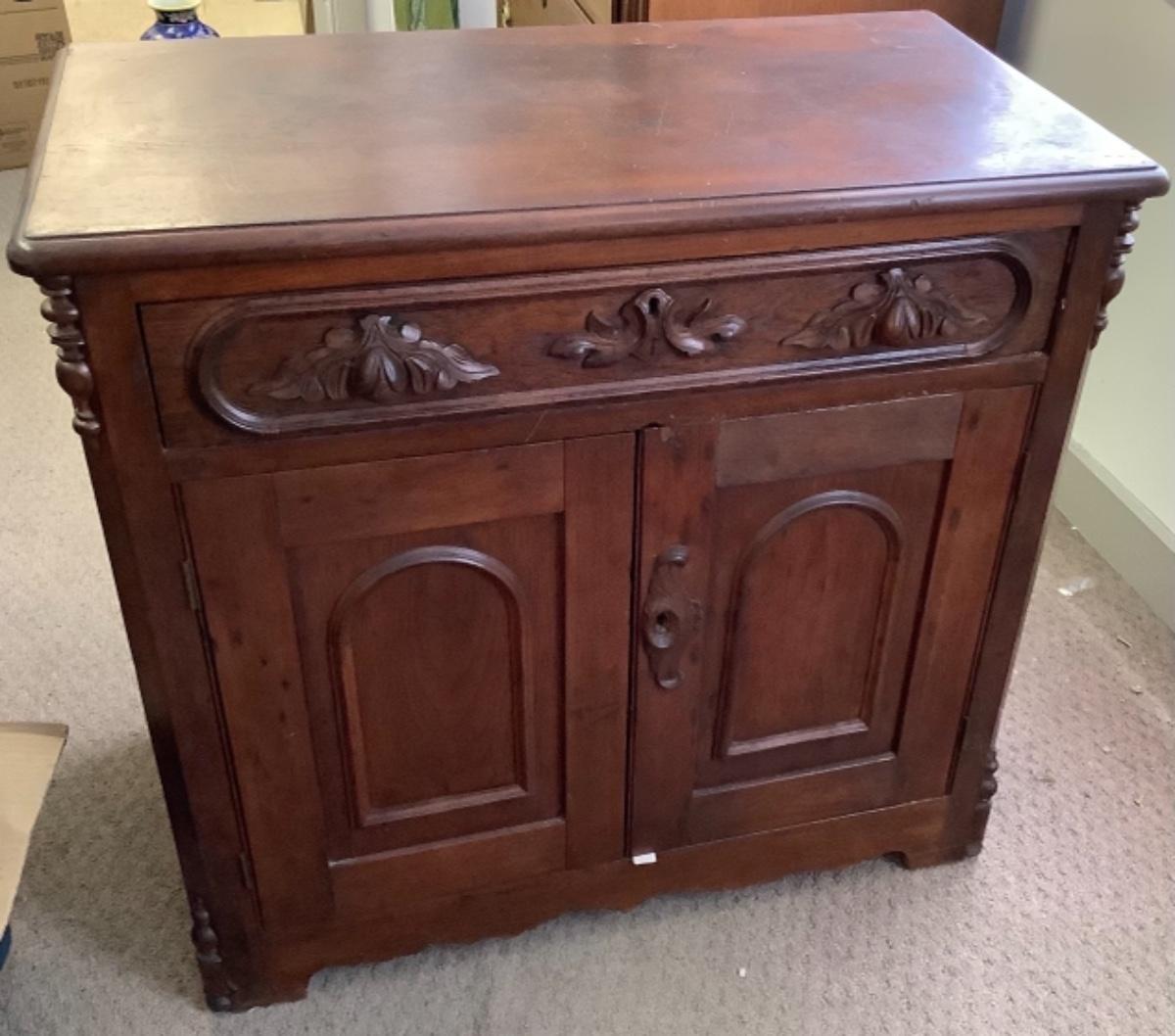 Victorian hand carved walnut wash stand, Drawer has a lock (no key), doors are missing their latch and lock, measures 16” long 30” wide and 28-1/2” high