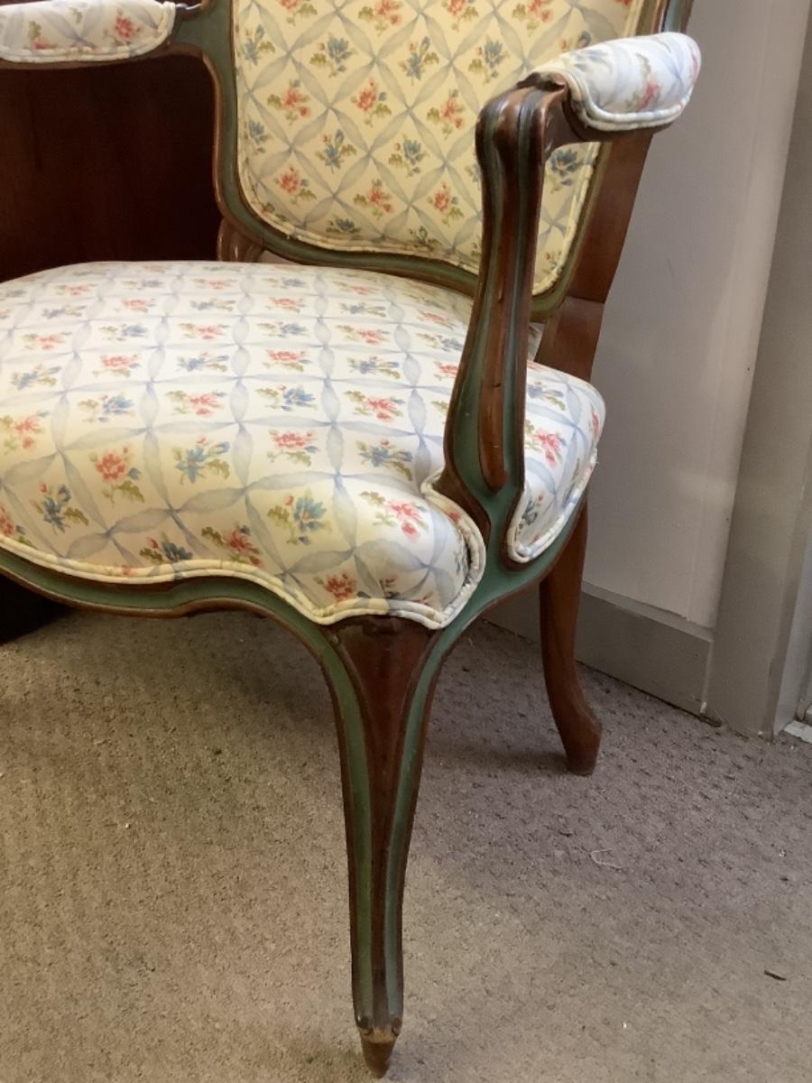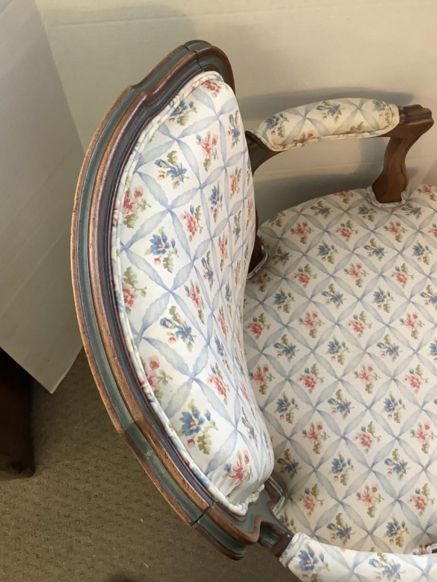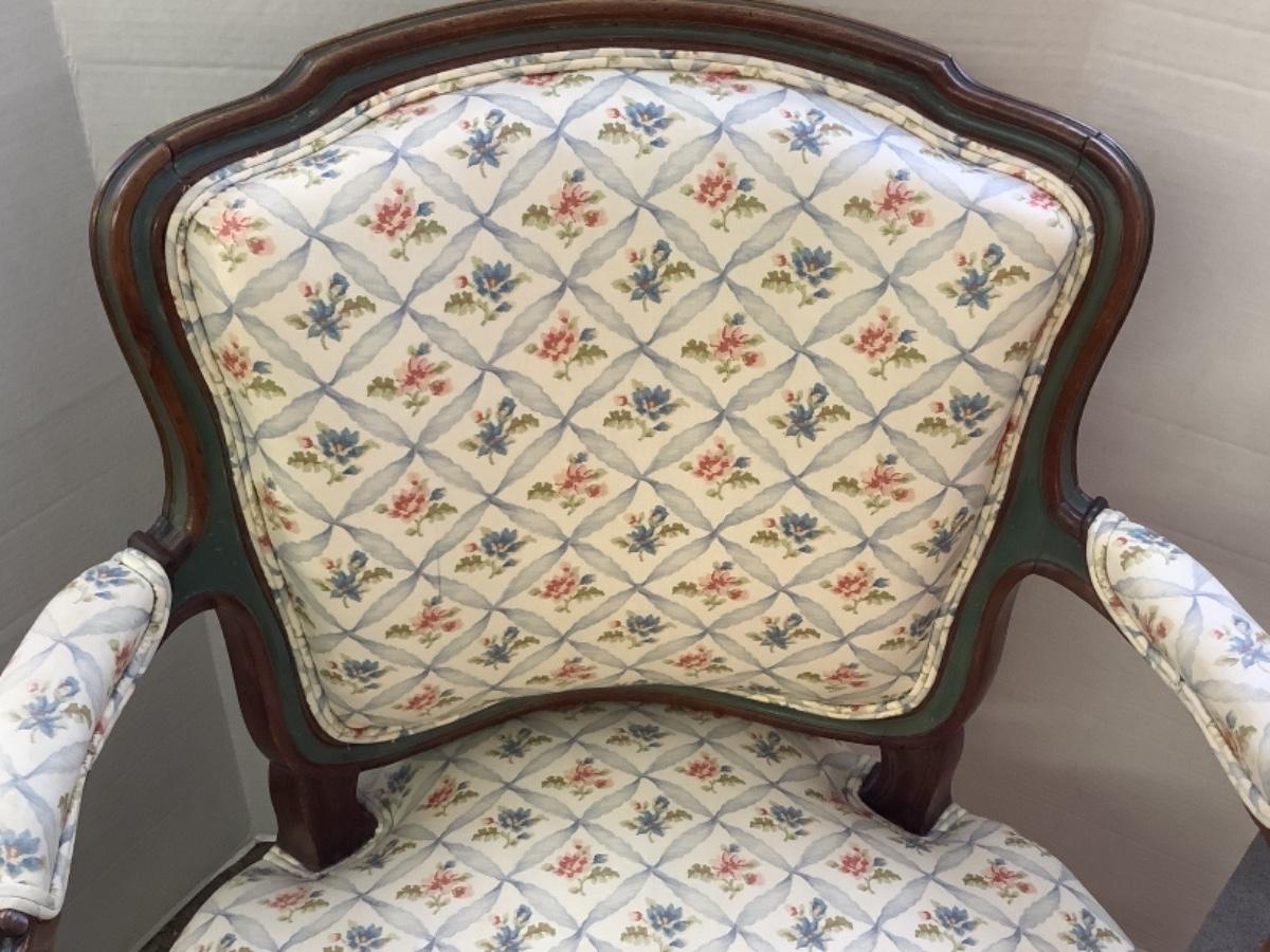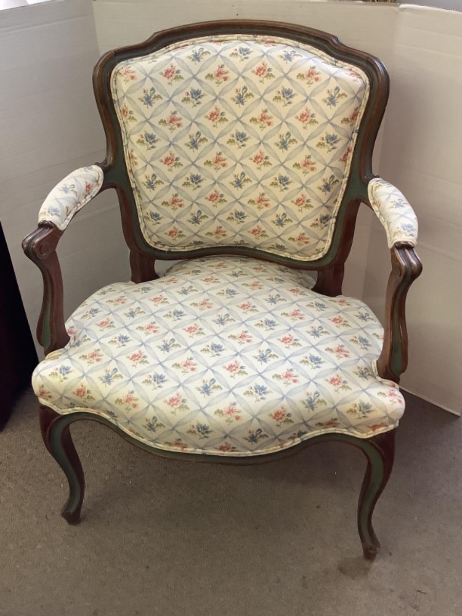 French upholstered Arm Chair measures 26” wide 35” tall 20” seat depth and 18” seat height