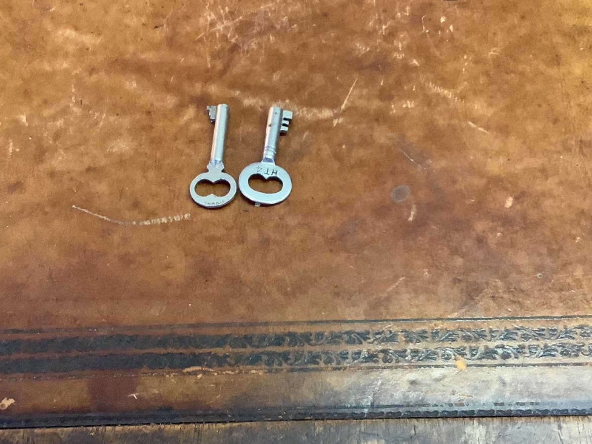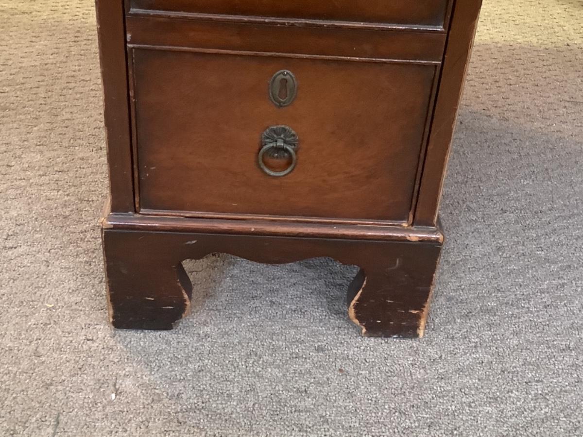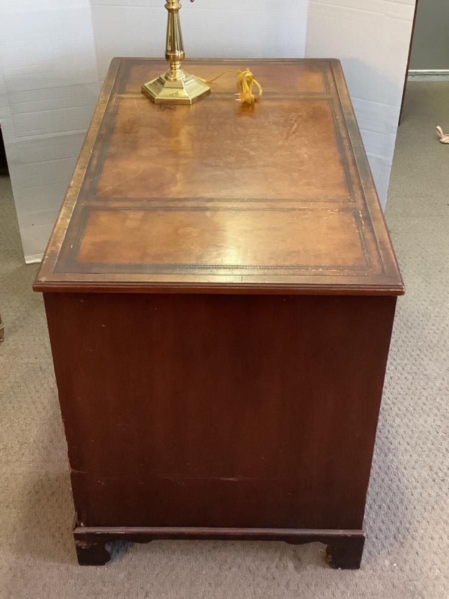Vintage mahogany veneer leather top knee hole desk with bracket feet, has some scratches on wood and leather please see photos, measures 29-1/2” high, 42” long and 24” deep