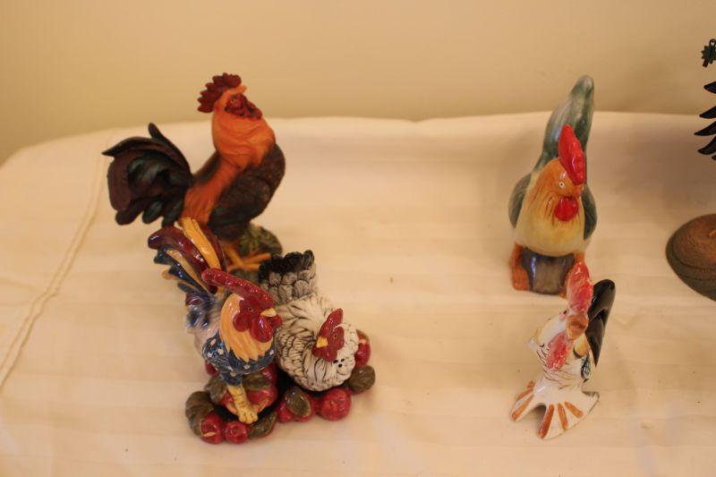 Lot 8 Farmhouse Rooster and Chickens- Ceramics and Resin 10"-5" tall.