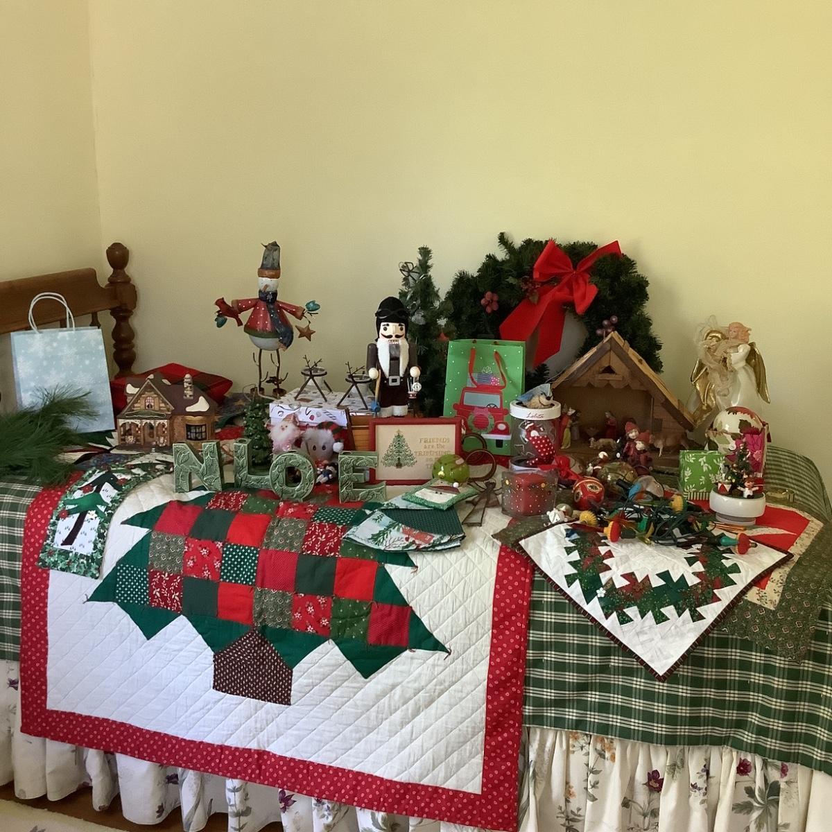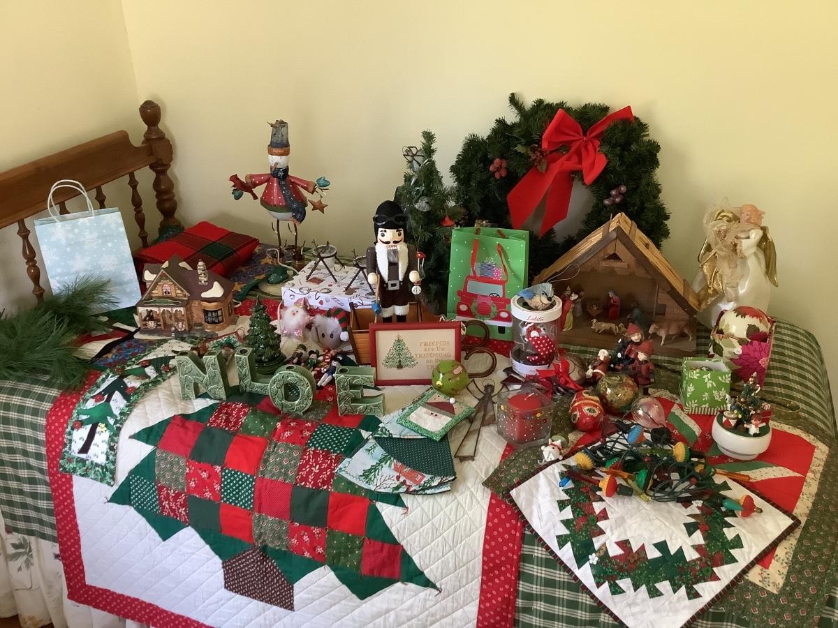 Handmade christmas quilt and wall hanging, wreath, nativity set with creche , antique bubble lights, ornaments , nutcrackers, wrapping paper and more