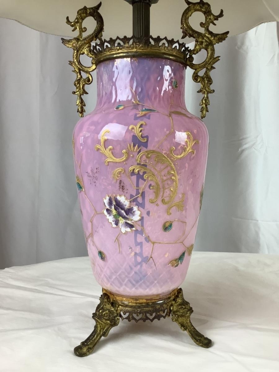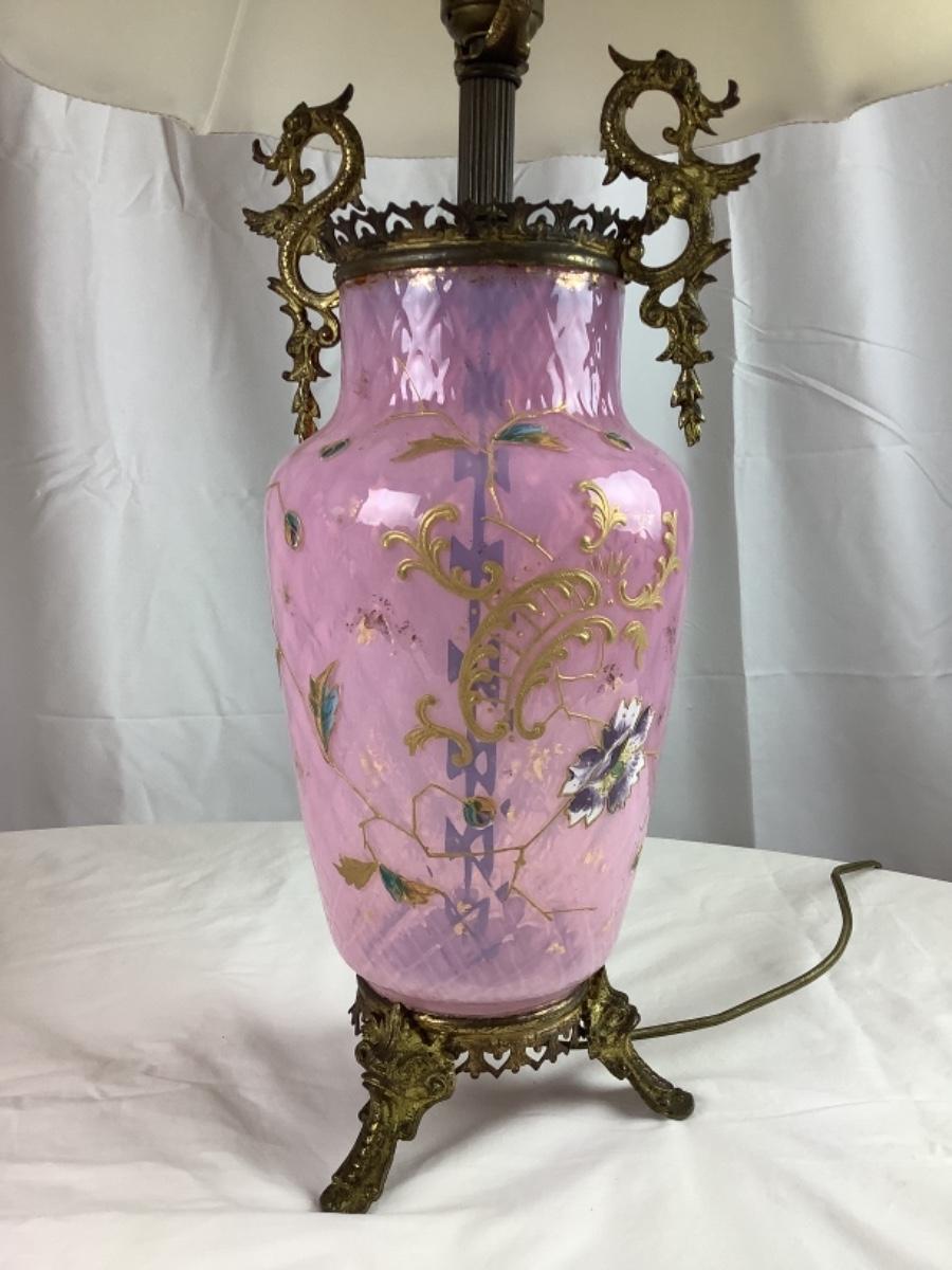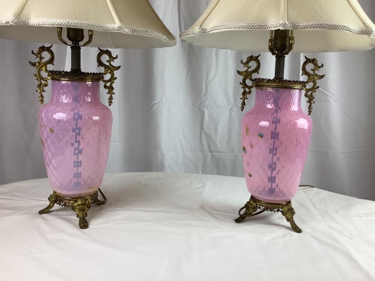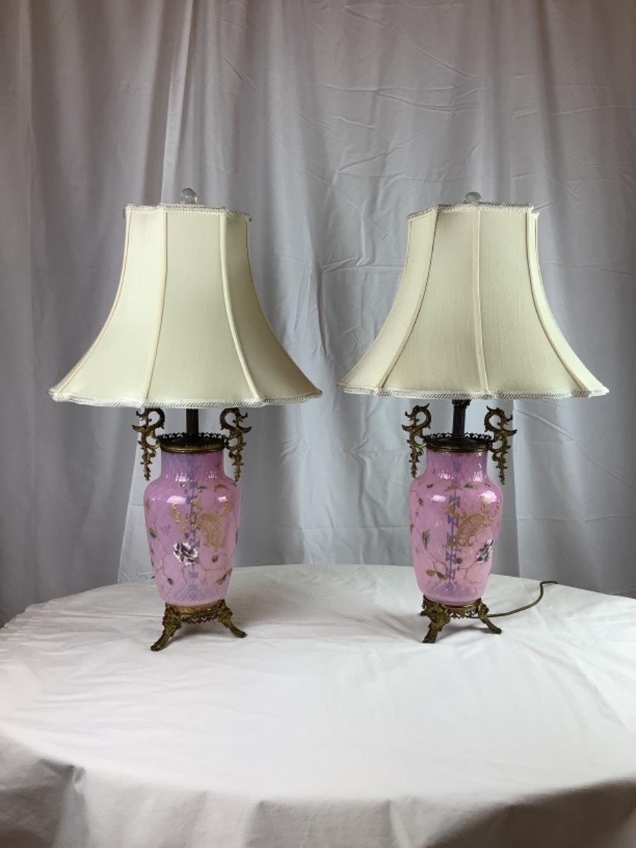 Beautiful Matching Pair of Antique Pink Bohemian Enameled Art Glass lamps