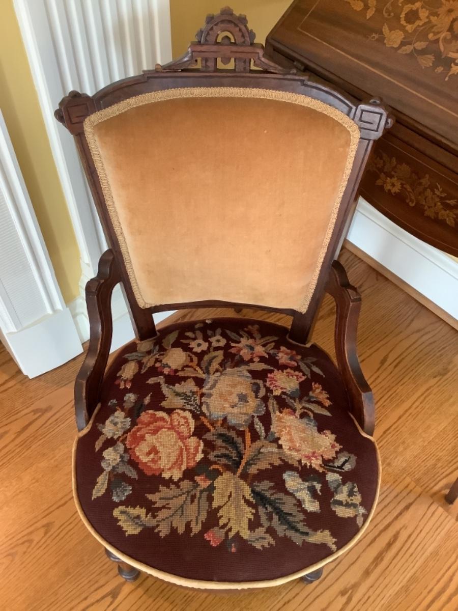 With Eastlake Needlepoint Chair measuring 37” high x 17” wide x 17” seat depth x 16.5” floor to seat depth