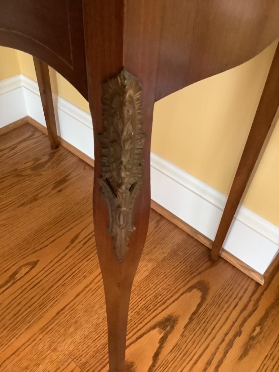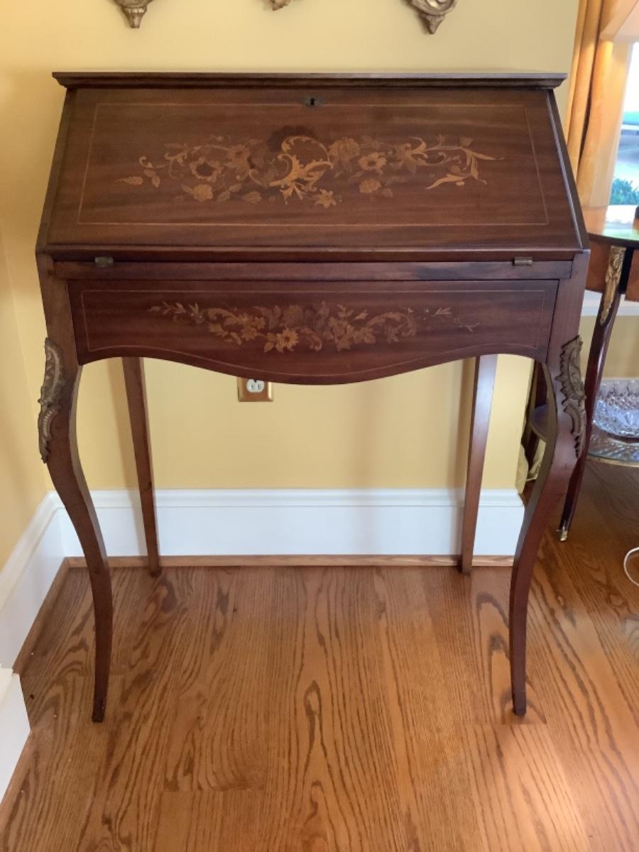 Beautiful Antique Louis XV Style French Inlay Slant Front Desk with ormolu designs measuring 38” high x 28.25” wide x 16” deep
