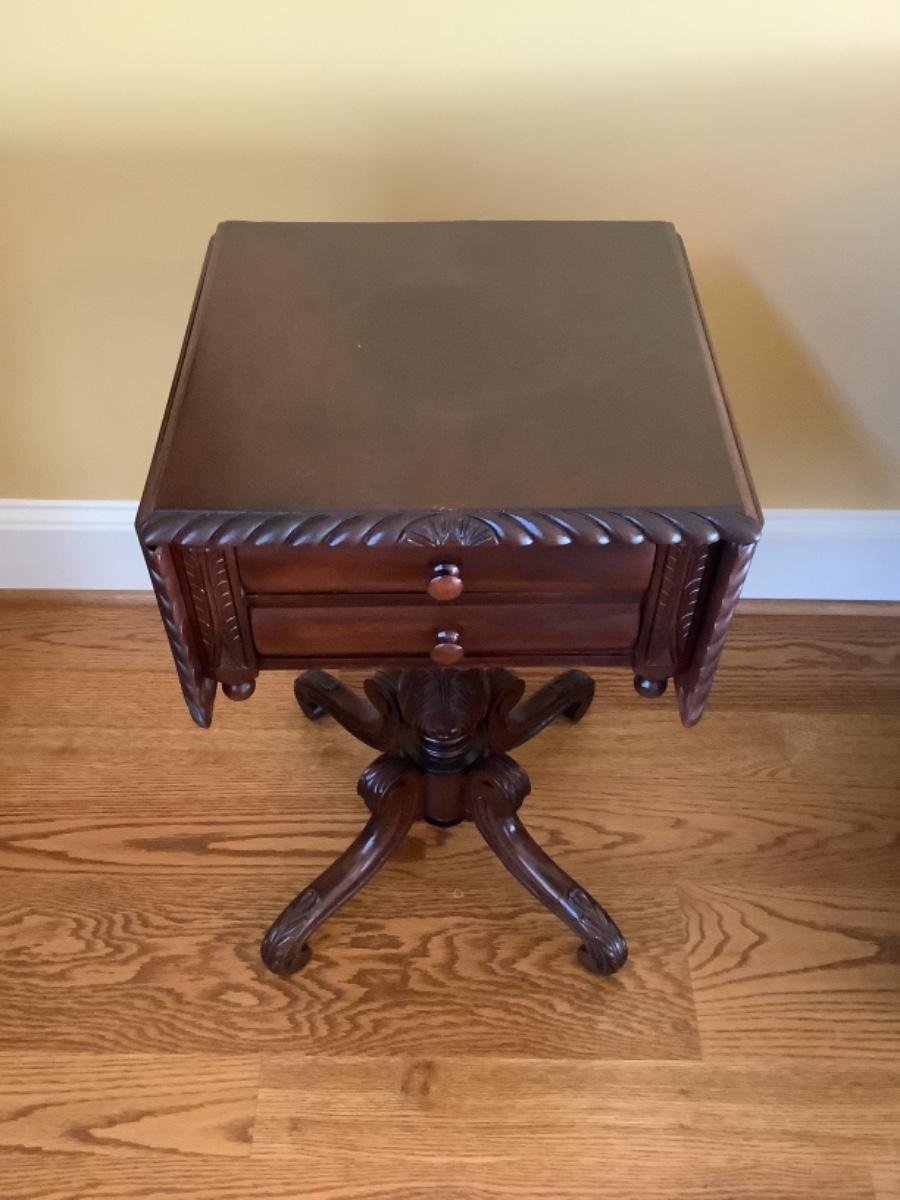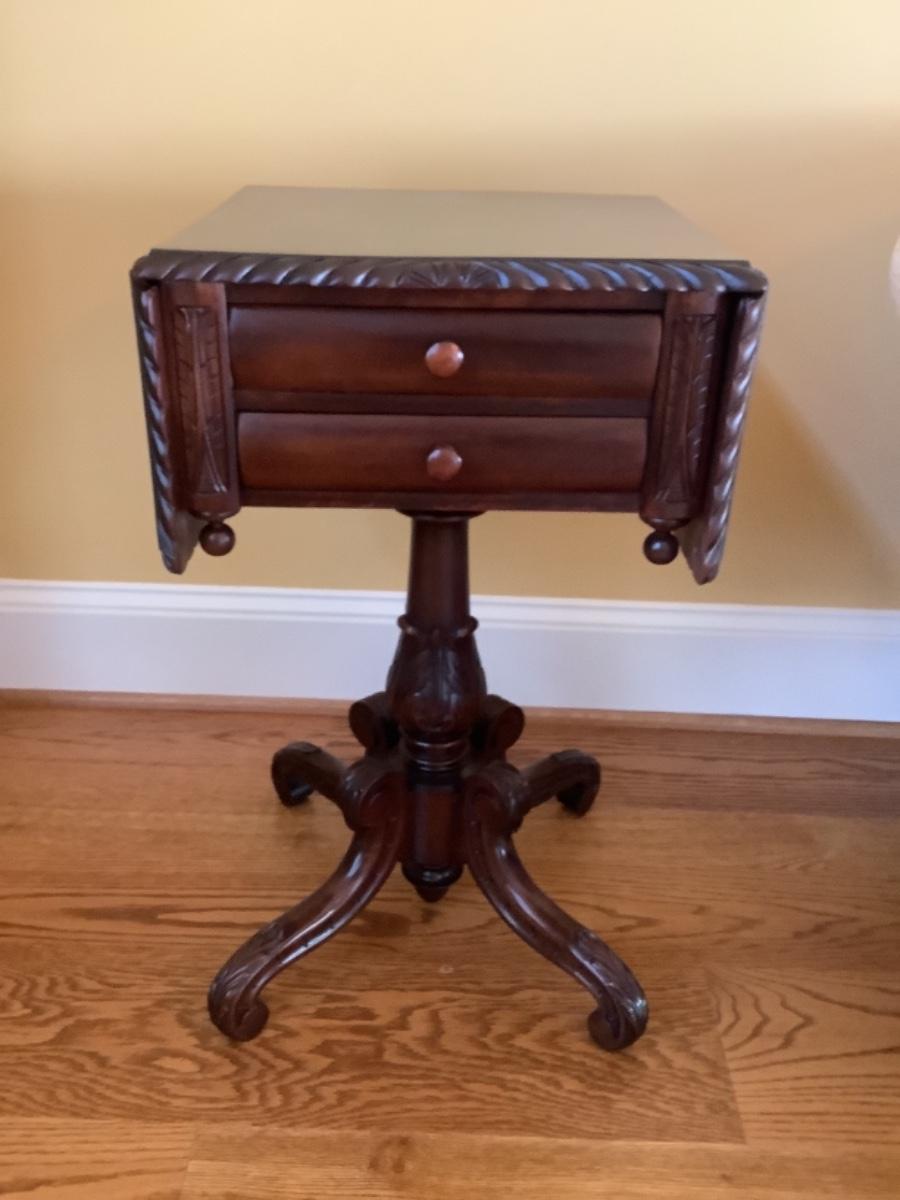 C1286 Antique Mahogany Drop Leaf Sewing Stand with Scalloped Edge