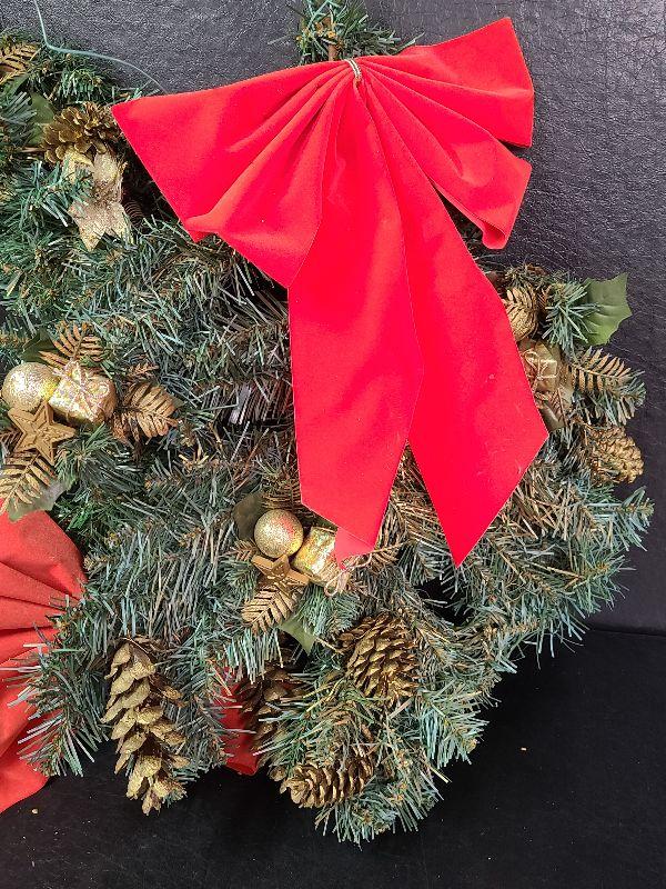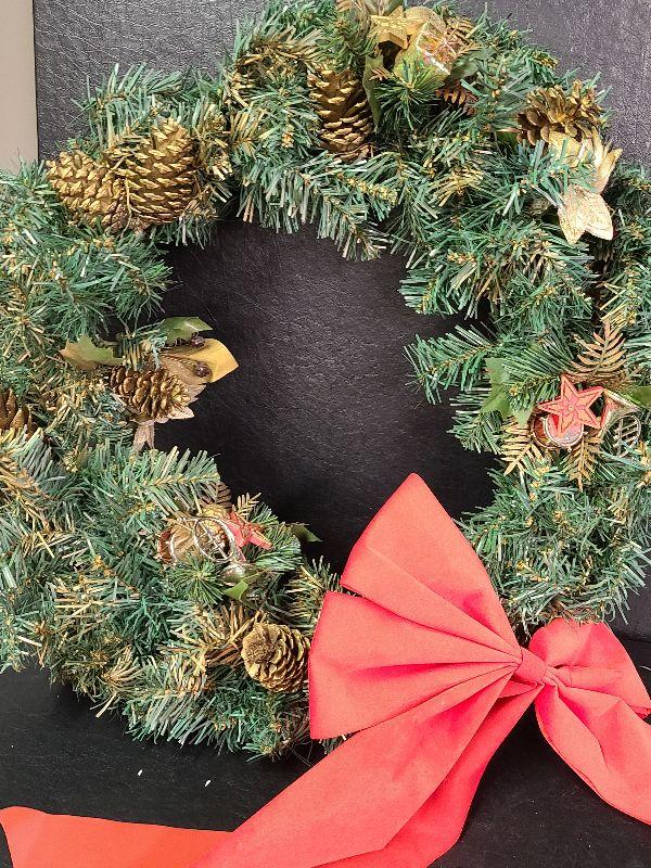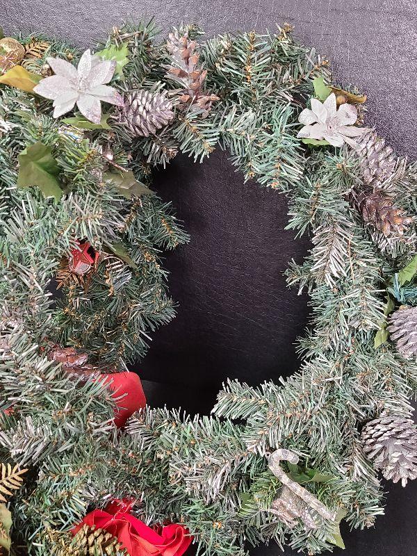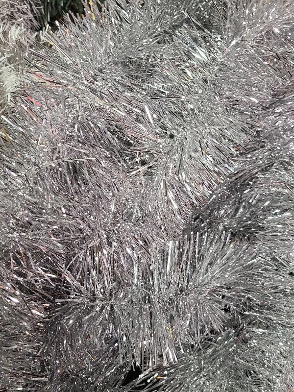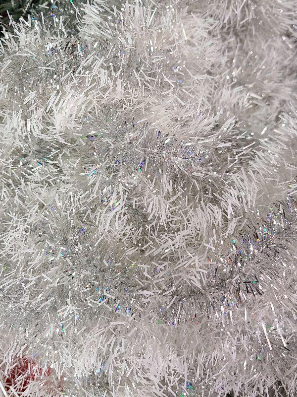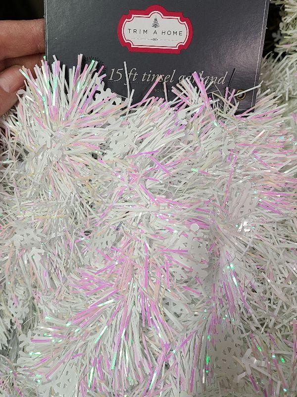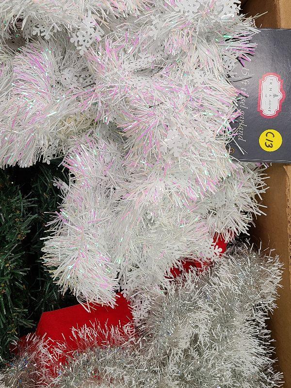 Nice lot for holiday decorating. 3 different pretty tinsel garlands and two evergreen wreaths. Please see all pictures for exact contents of the lot, condition of the items, and if measurements if taken. Thank you for looking and have fun bidding.