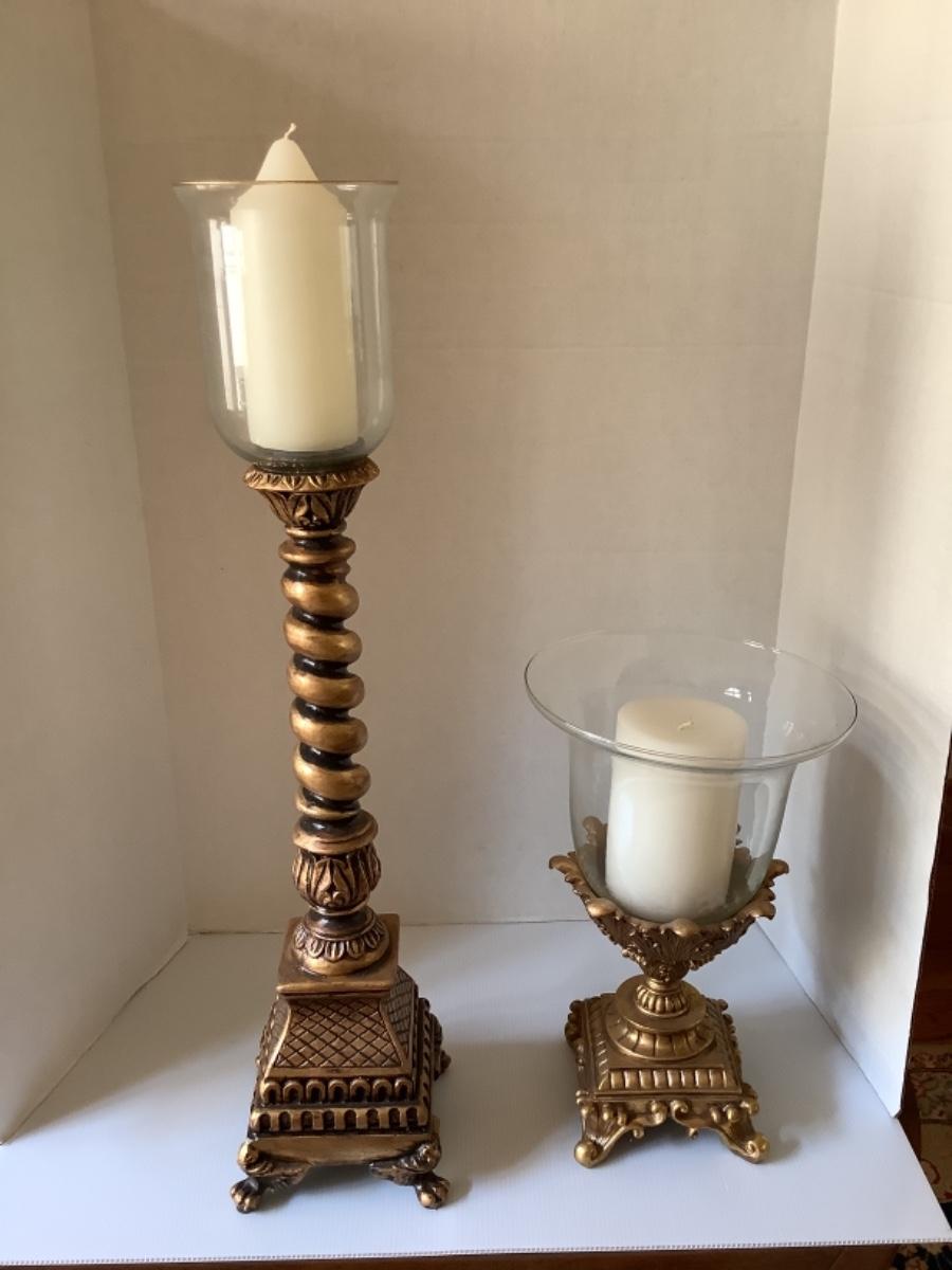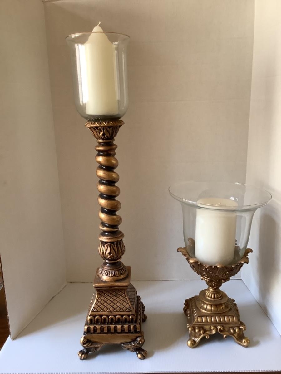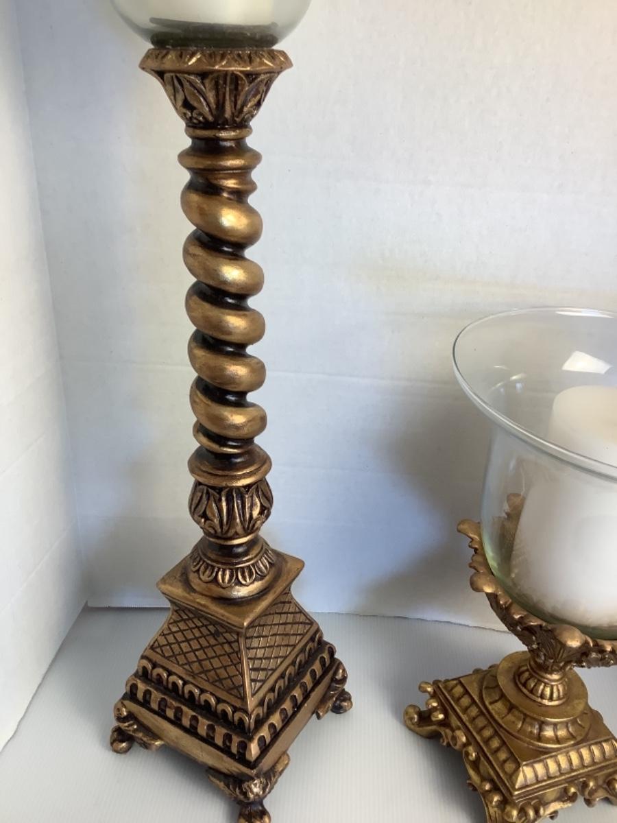 Constructed of Resin , these candleholders measure 30” high with globe and 15.5” high with globe
