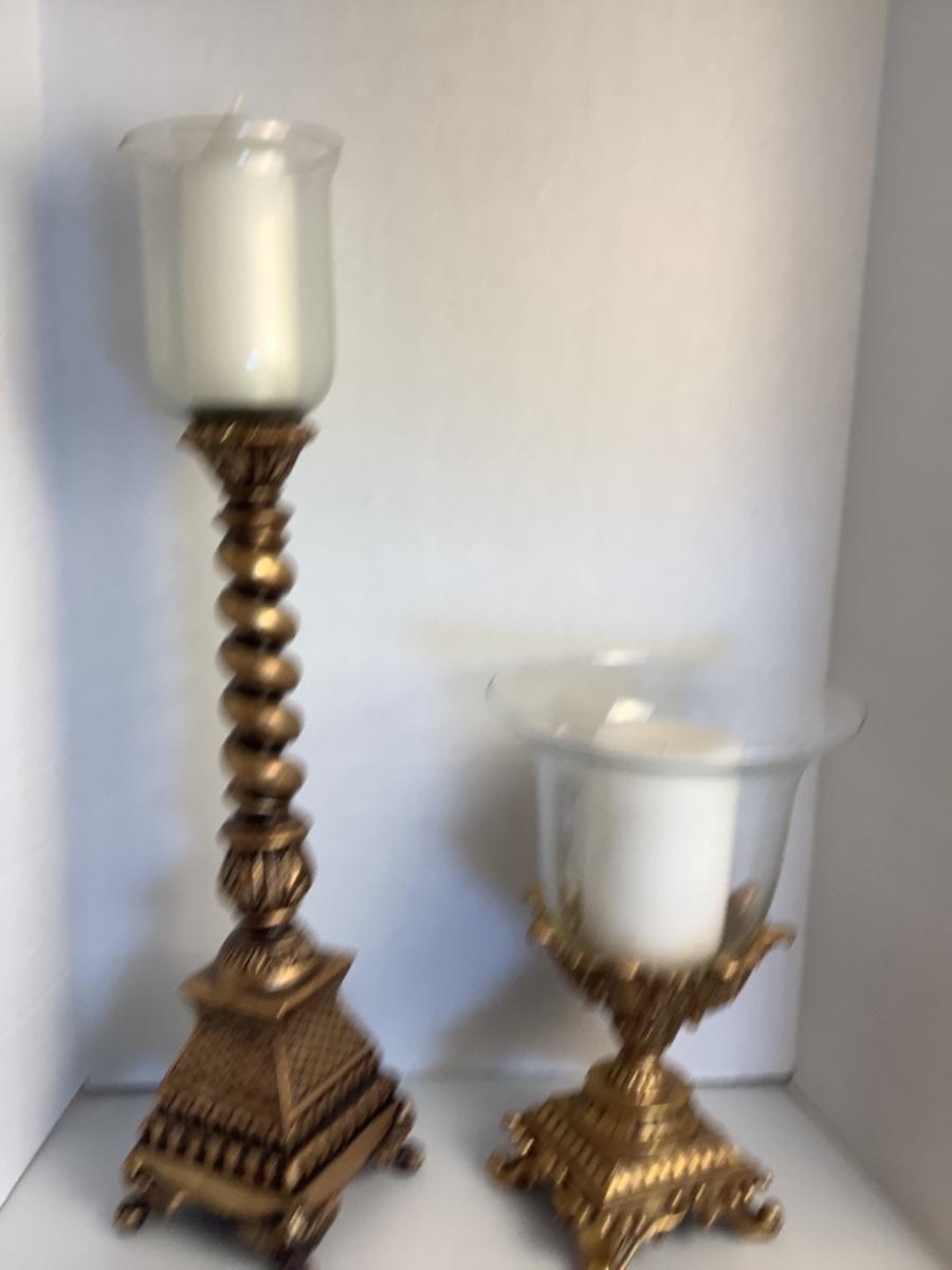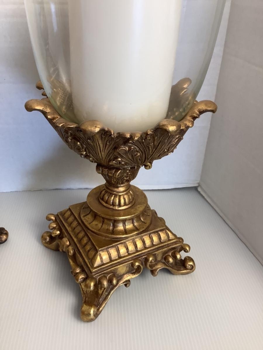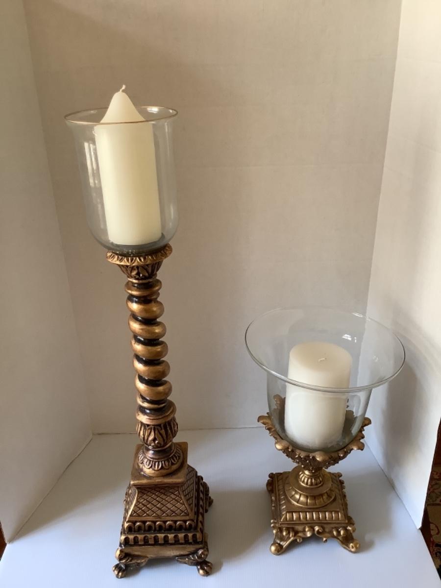 Constructed of Resin , these candleholders measure 30” high with globe and 15.5” high with globe