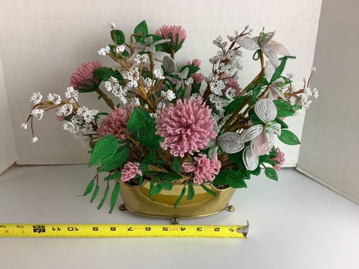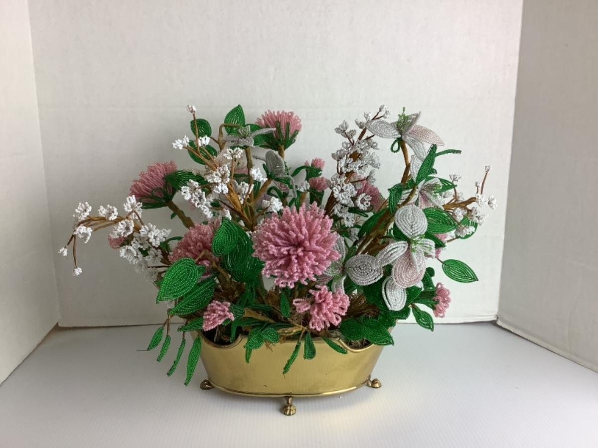 Brass base with Handmade Vintage French Seed Beaded Floral arrangement