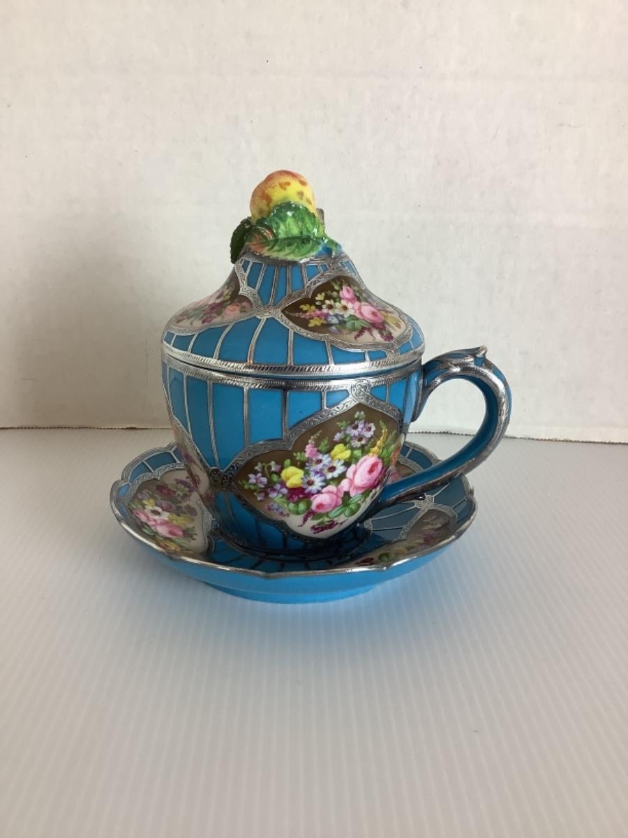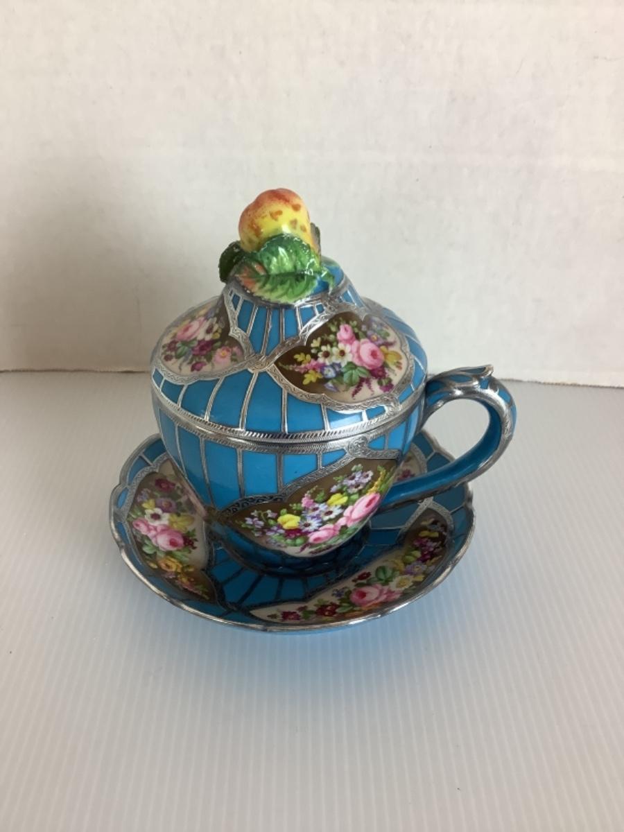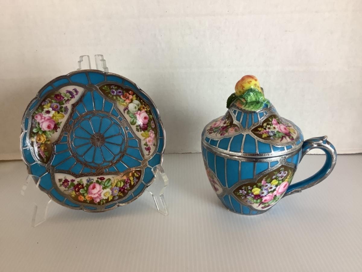 C1317 Antique Silver Mounted Porcelain Sevres Style Lidded Cup and Saucer