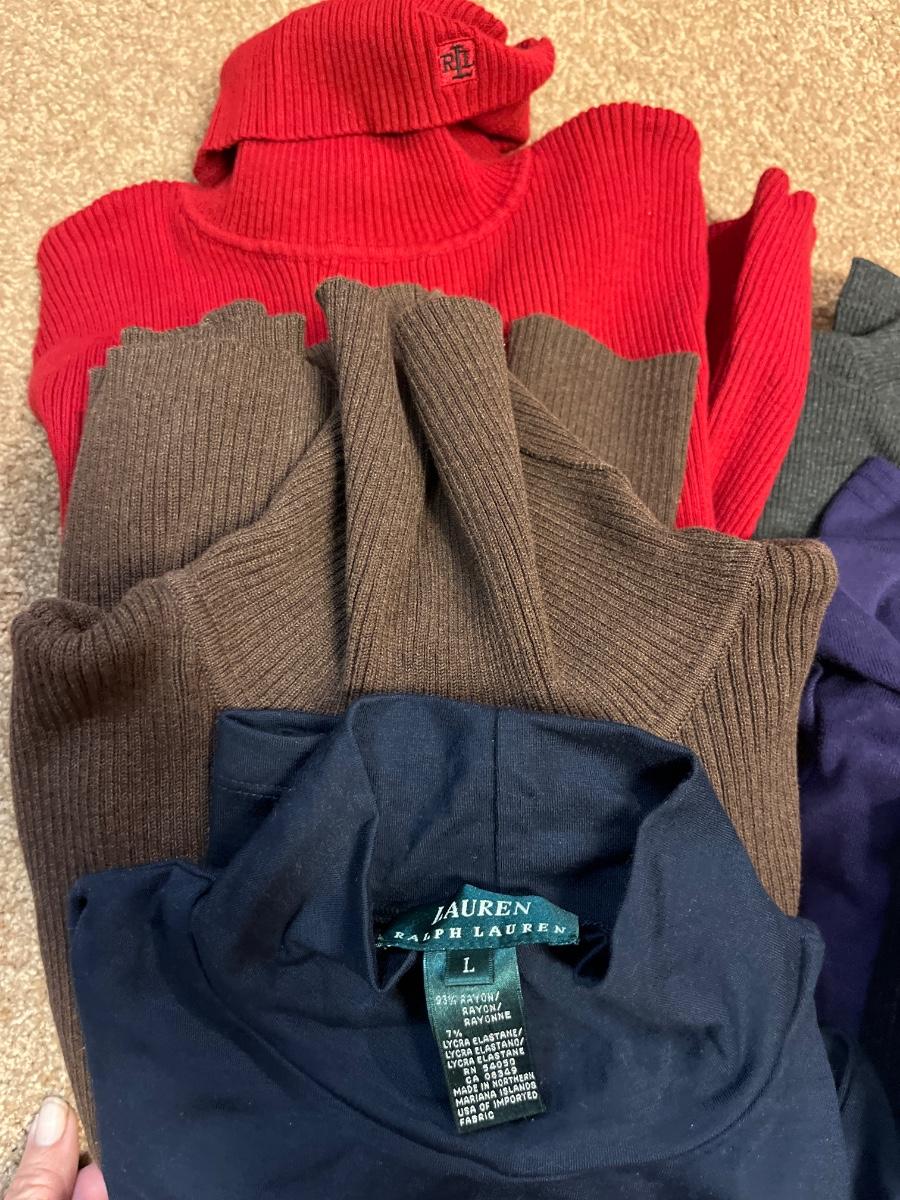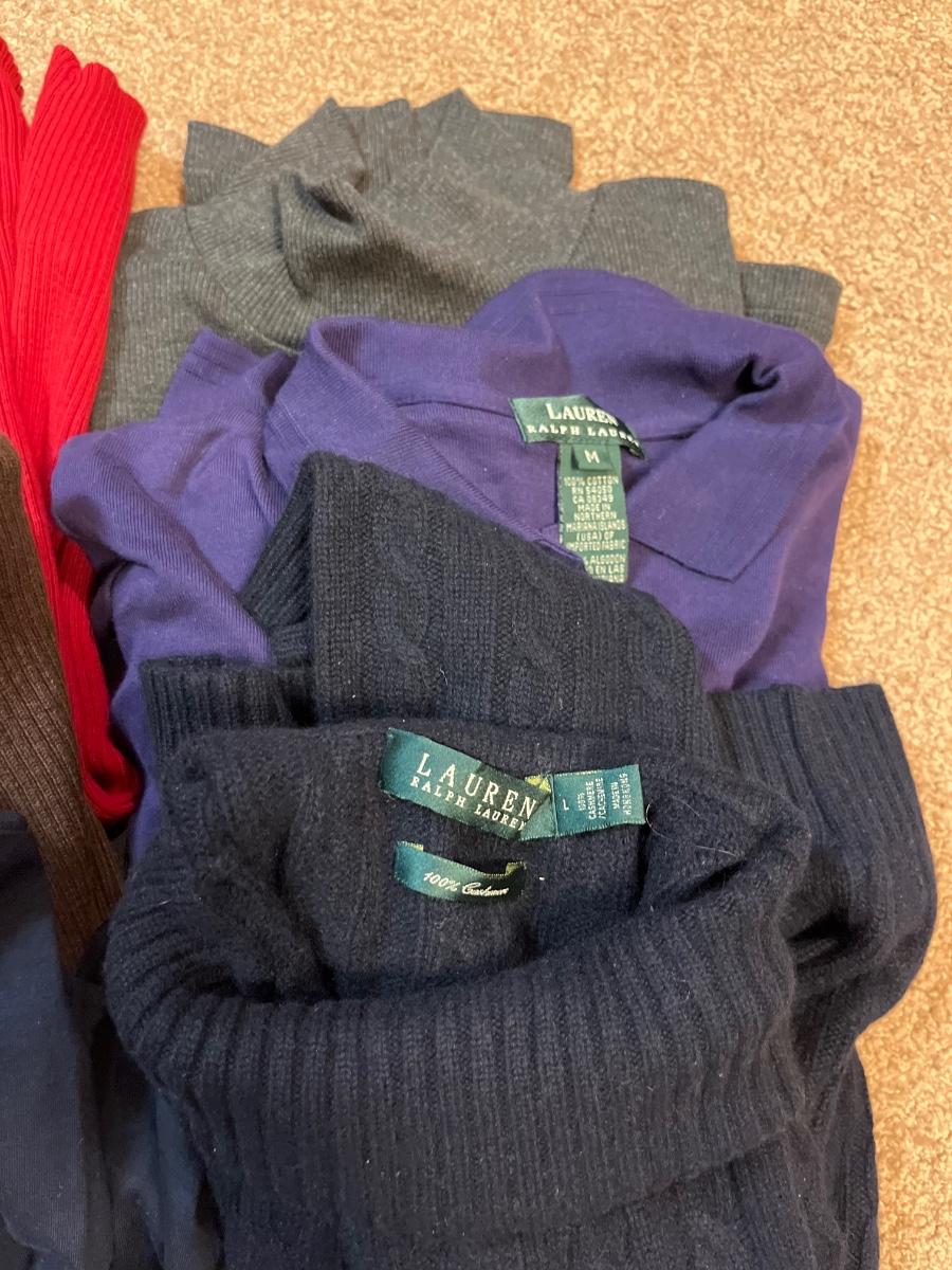 C132- Ralph Lauren, sweaters, turtlenecks, one cashmere, polo shirt sizes a- see pictures