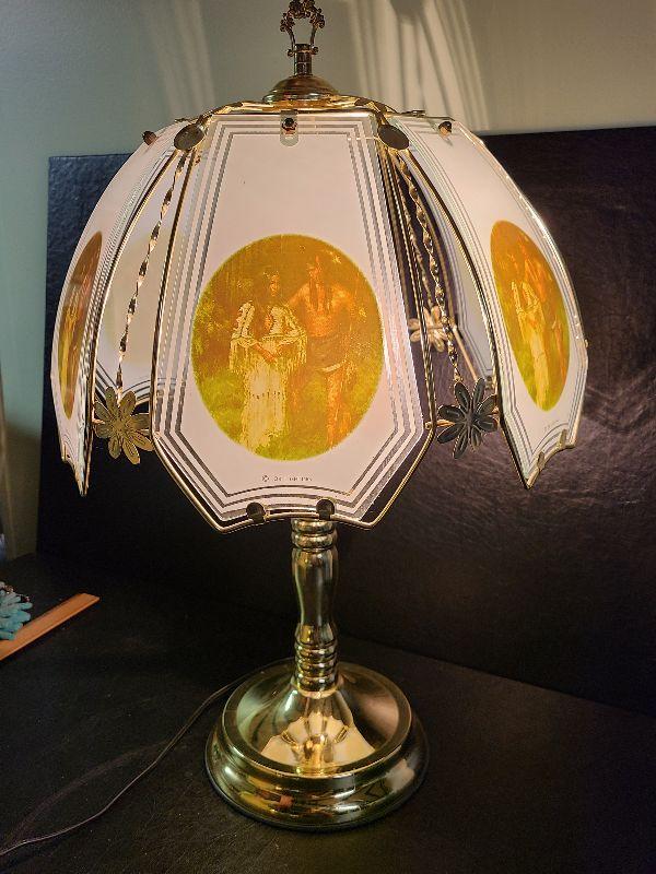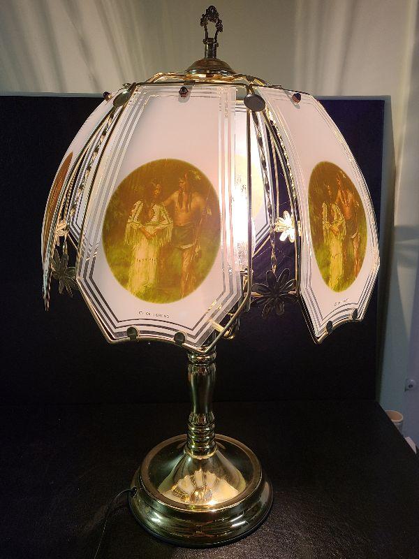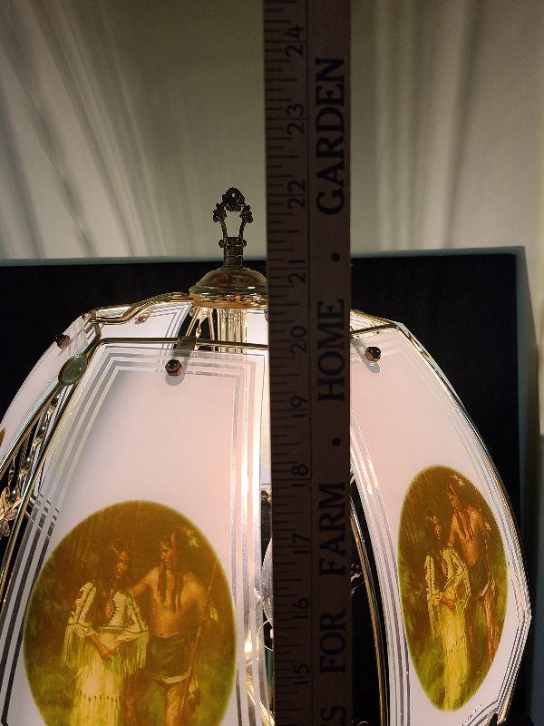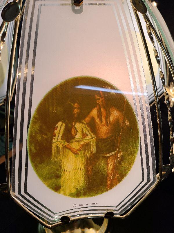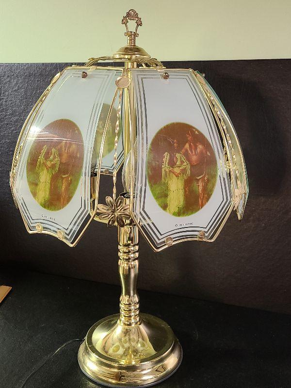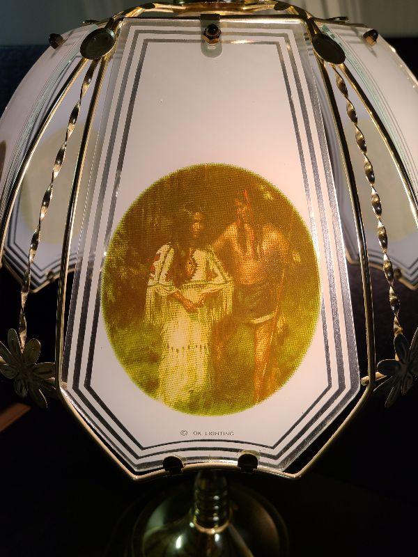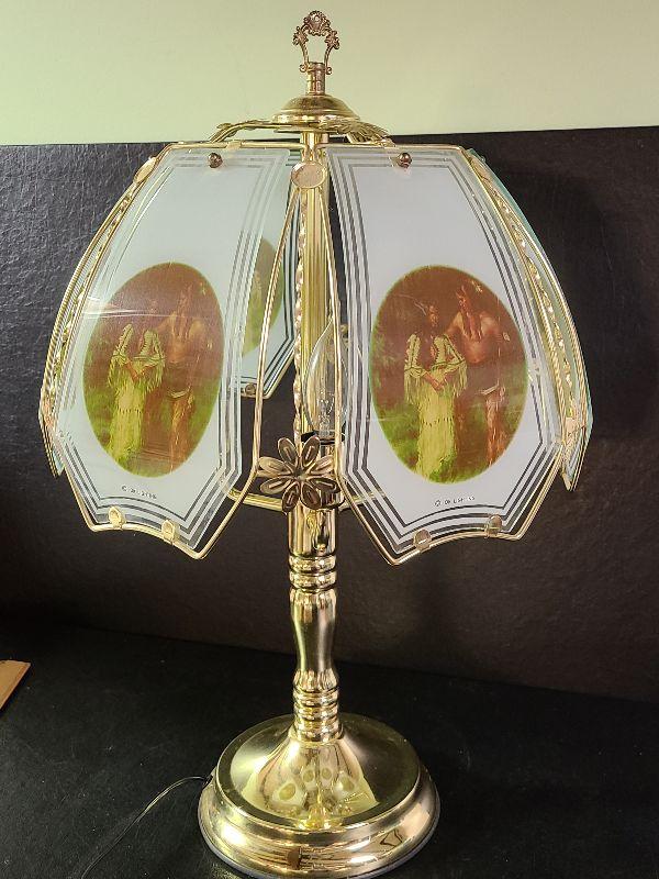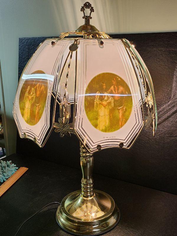 This is a touch lamp by OK lighting company with Native American Scenes. The lamp works, but the touch feature was not working. Please see pics for contain and sizing.