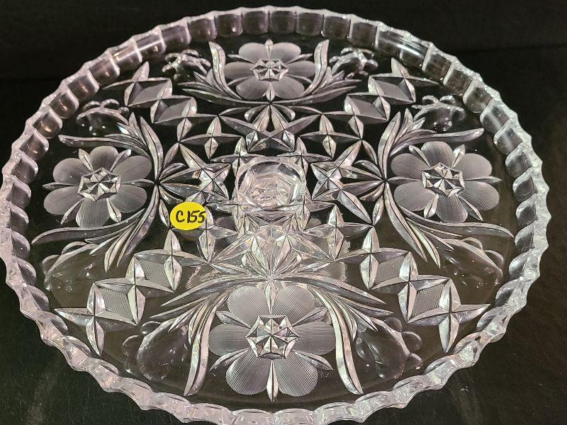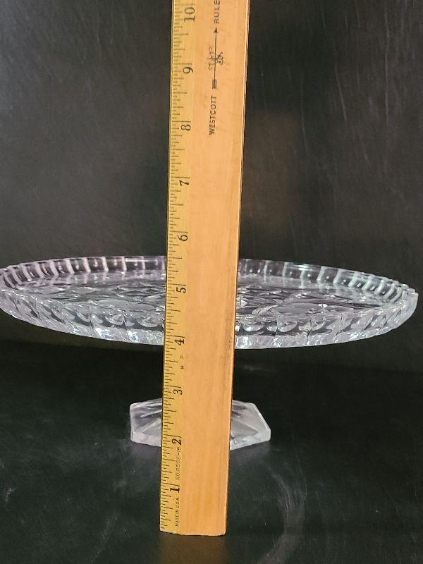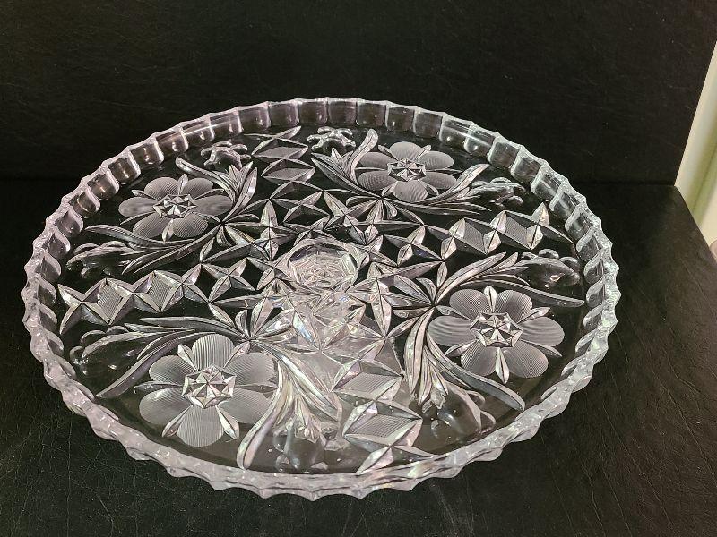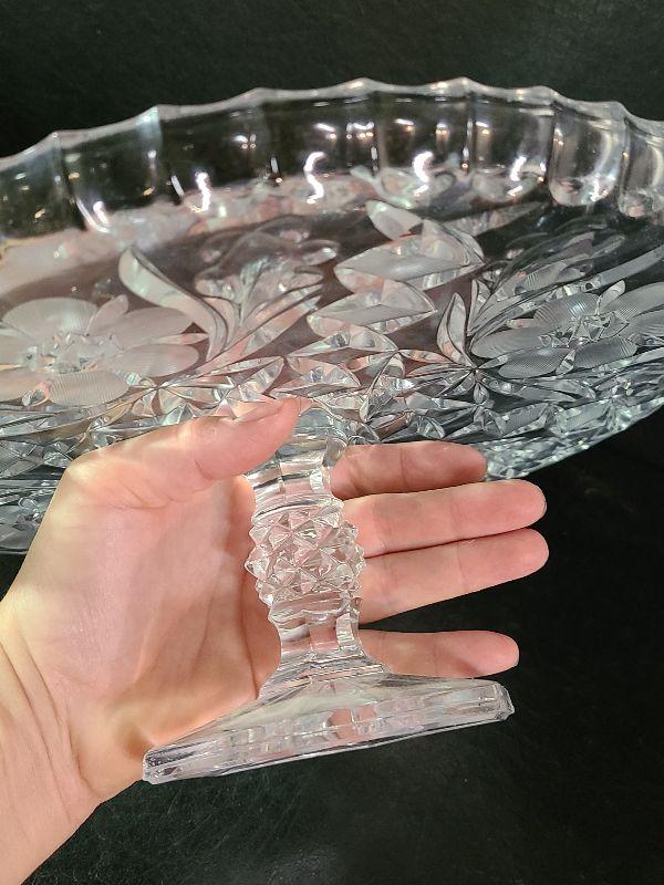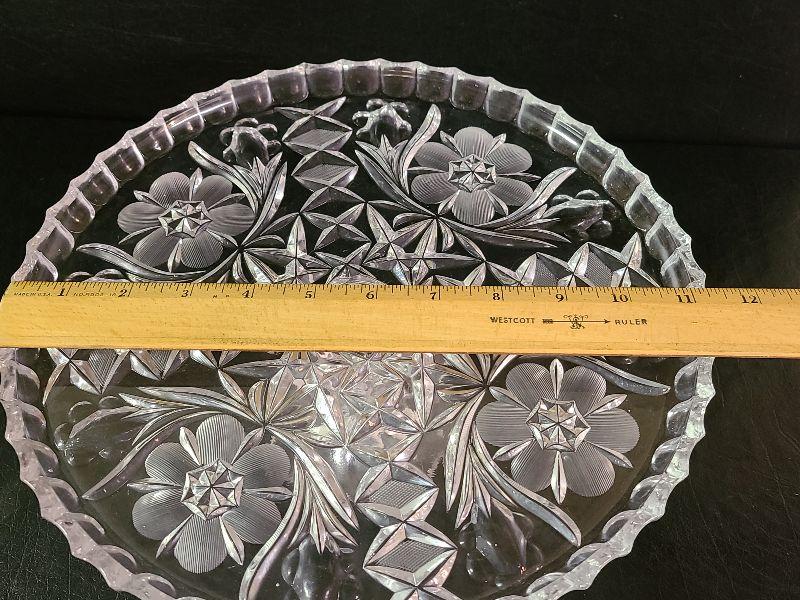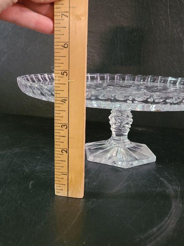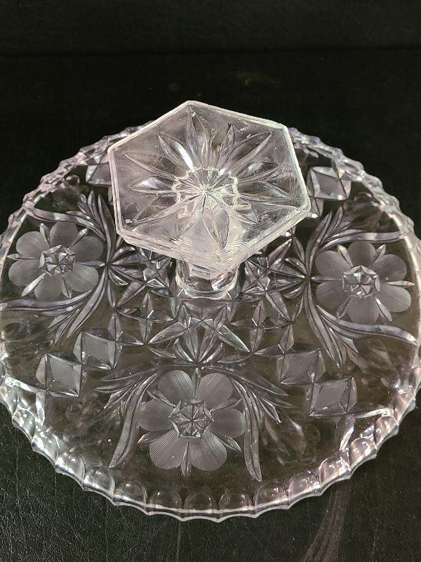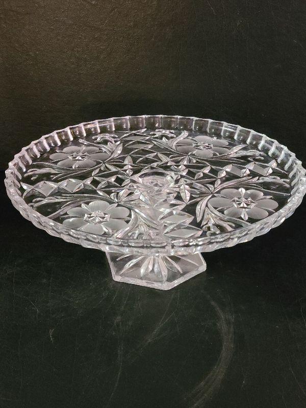 This is a beautiful glass cake stand with floral designs. Please see pics for sizing and condition