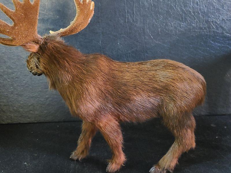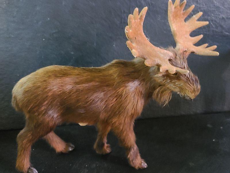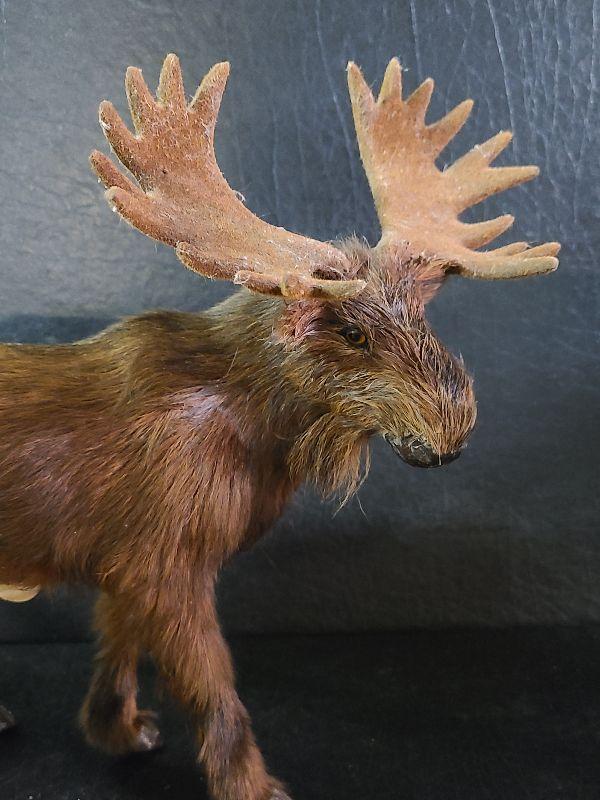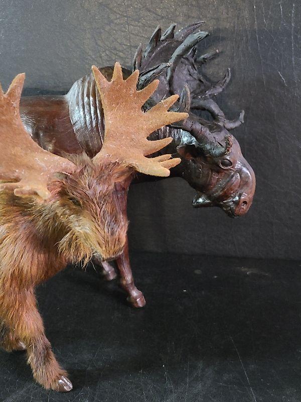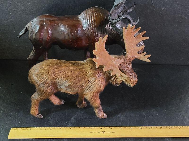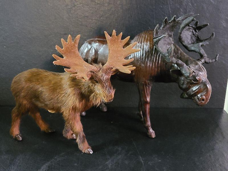 These two are unique. The Larger moose is leather and the smaller moose is goats fur. Please see pics for sizing and condition