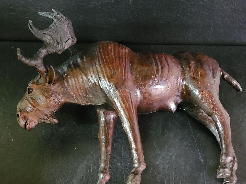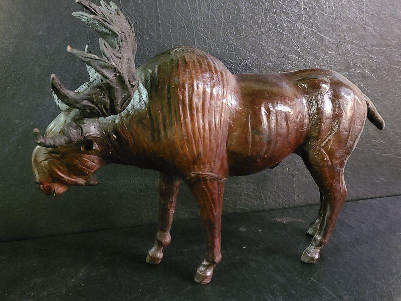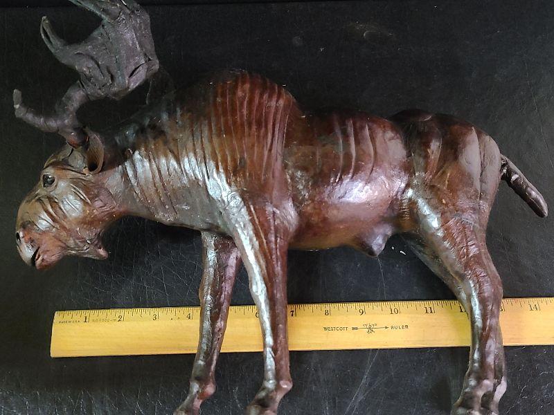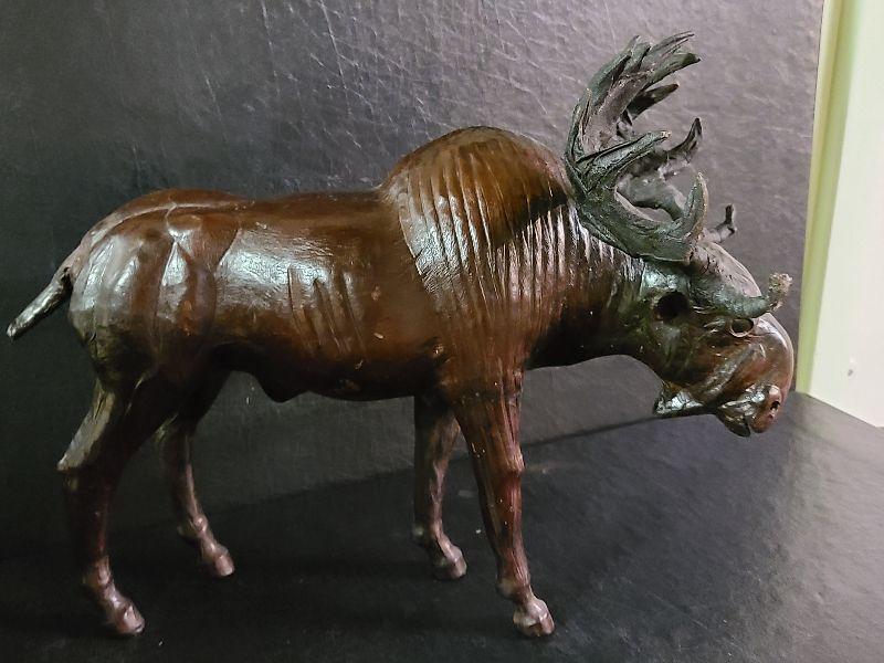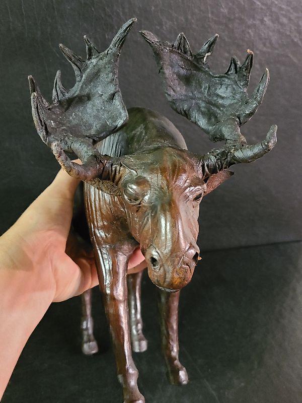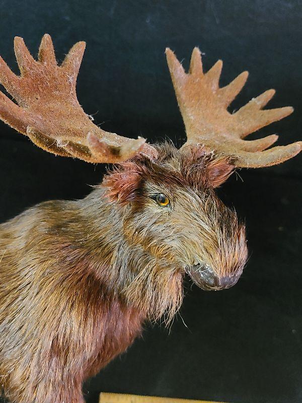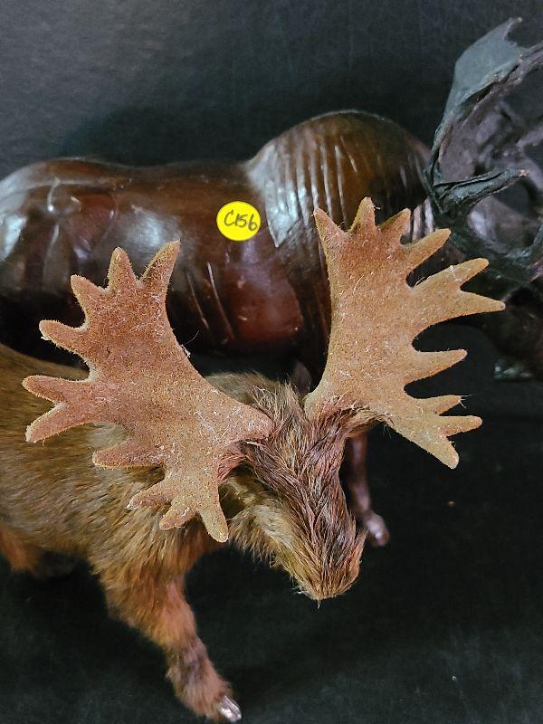 These two are unique. The Larger moose is leather and the smaller moose is goats fur. Please see pics for sizing and condition
