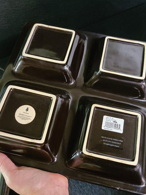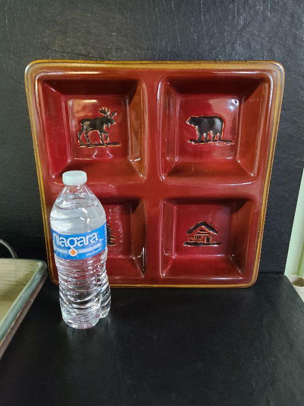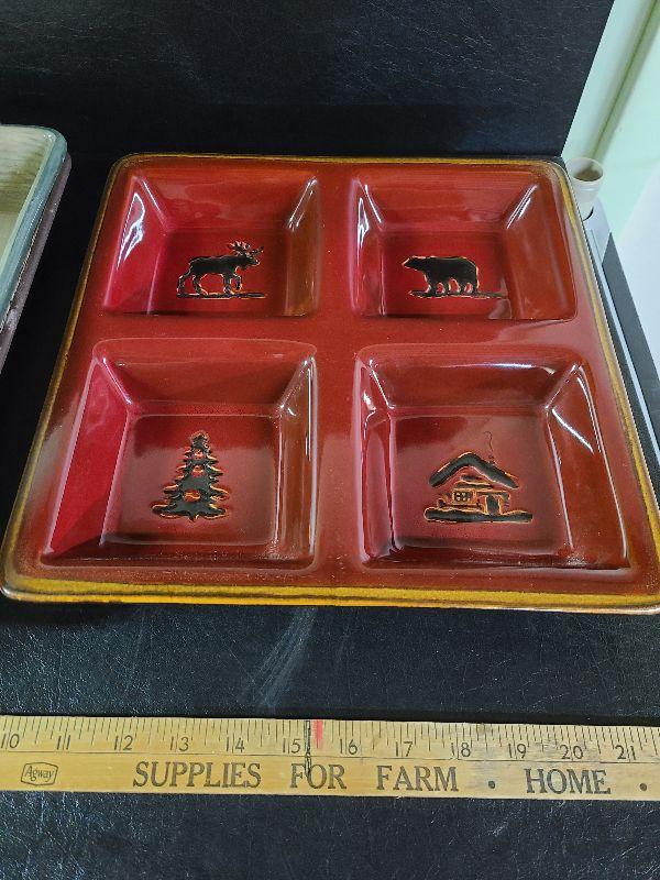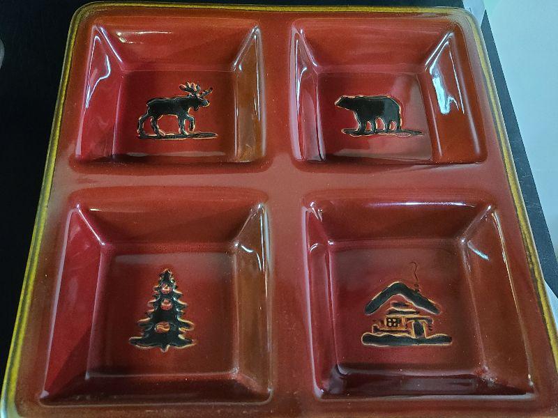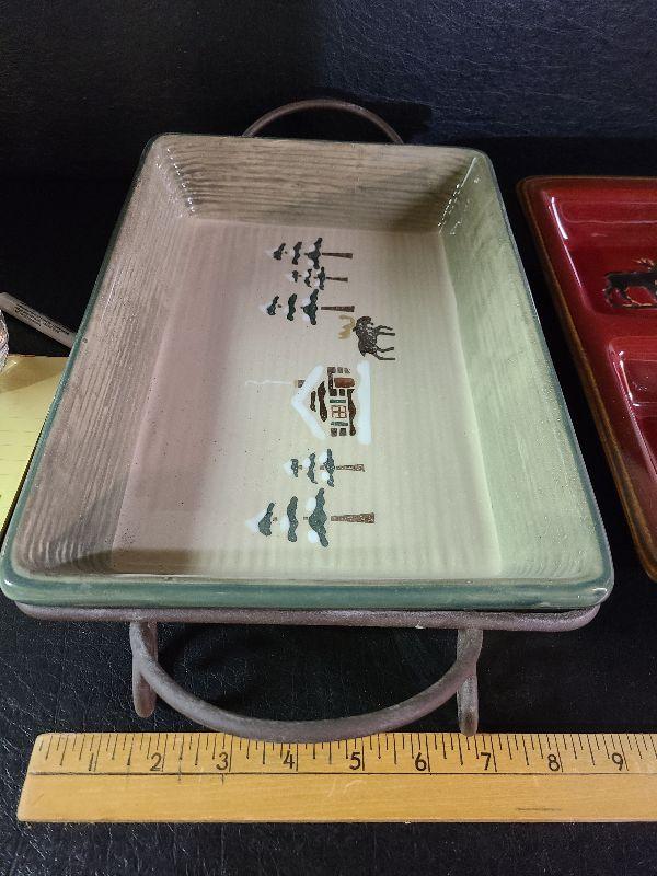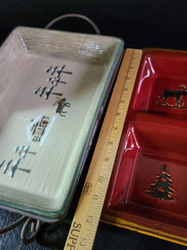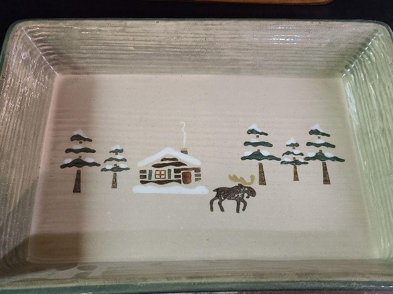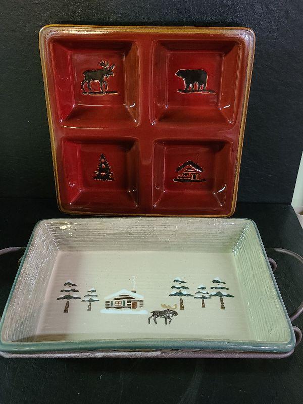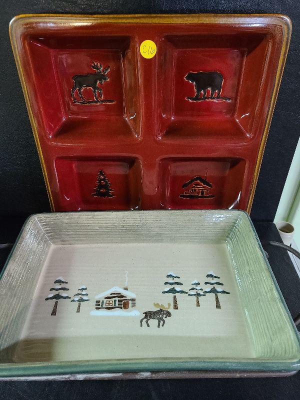 Festive Casserole dish and divided serving platter with winter/moose designs. Please see pics for sizing and condition