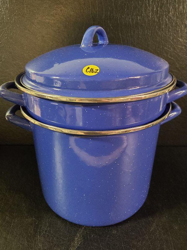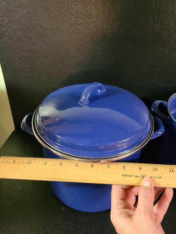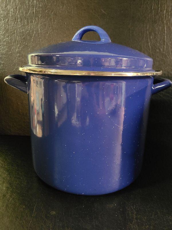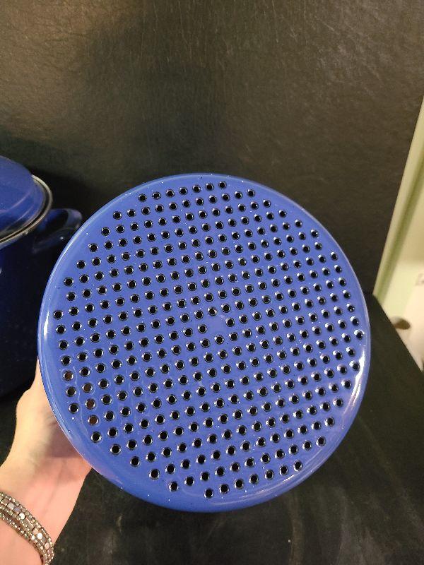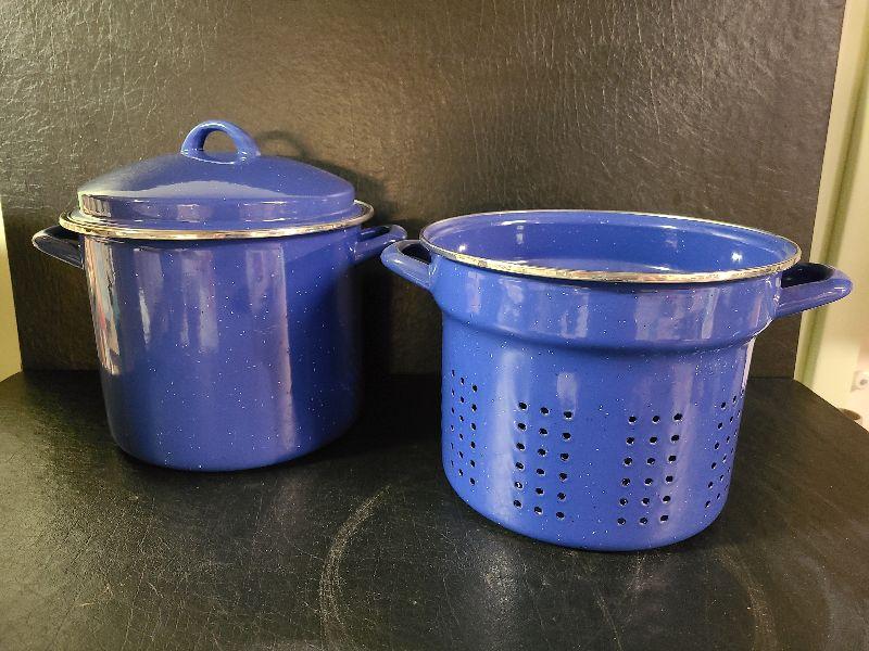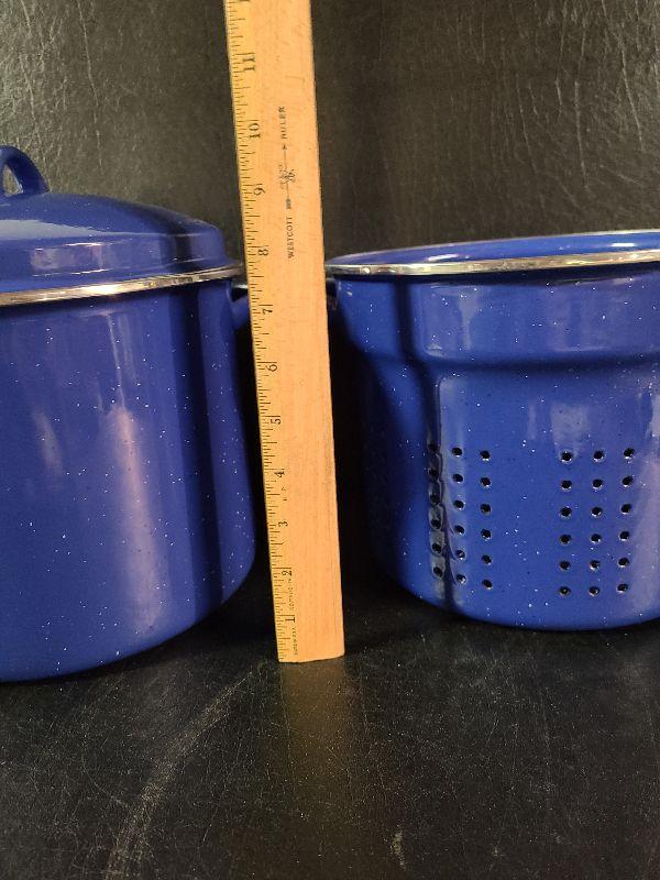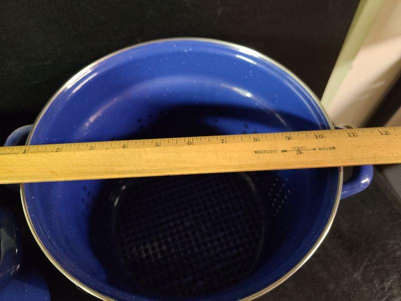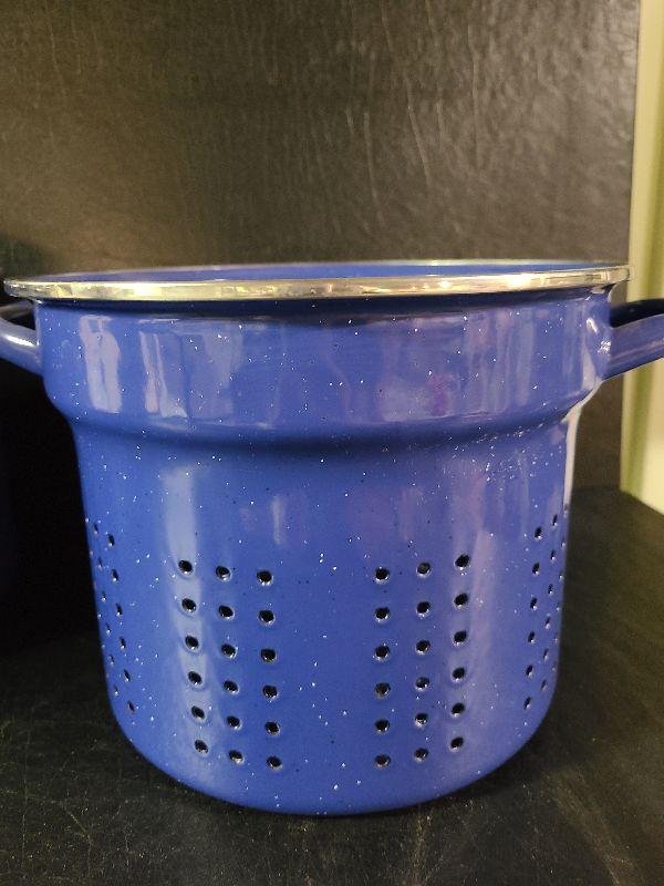 This is a beautiful blue stock pot with strainer. Please see pics for sizing and condition