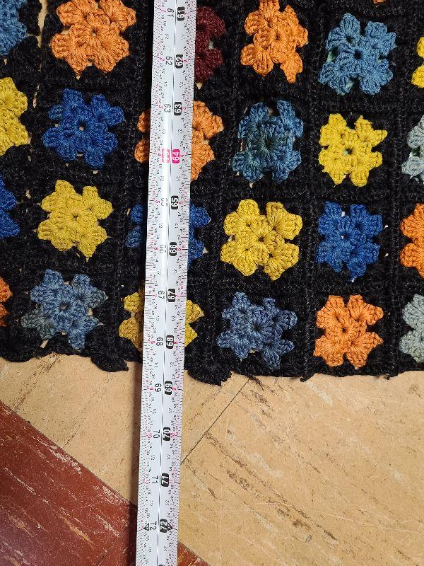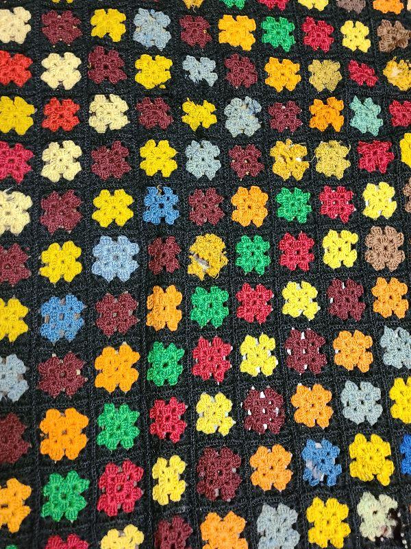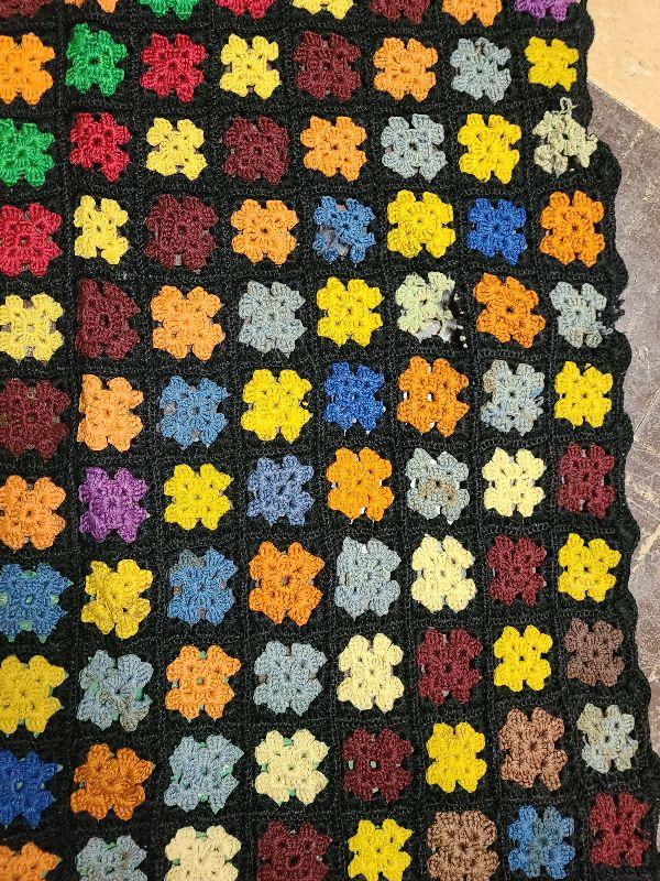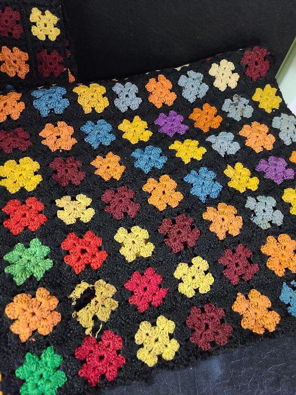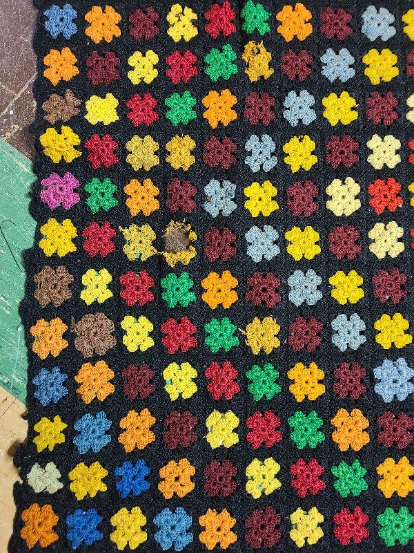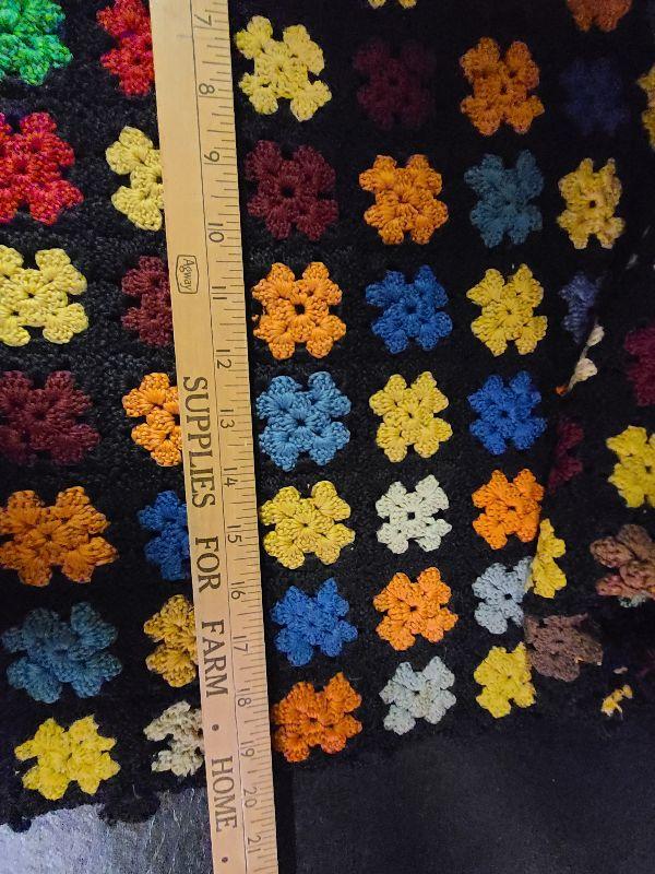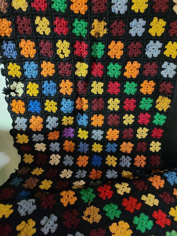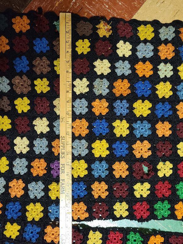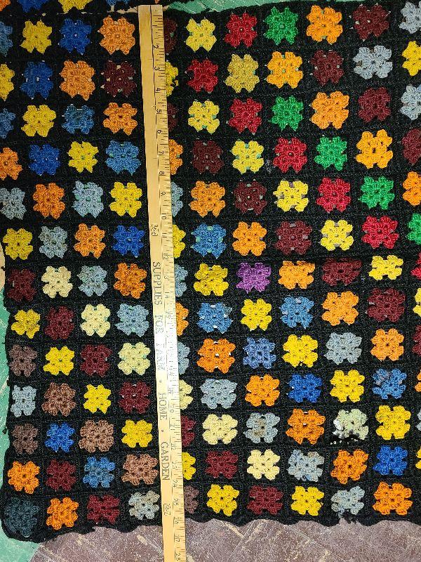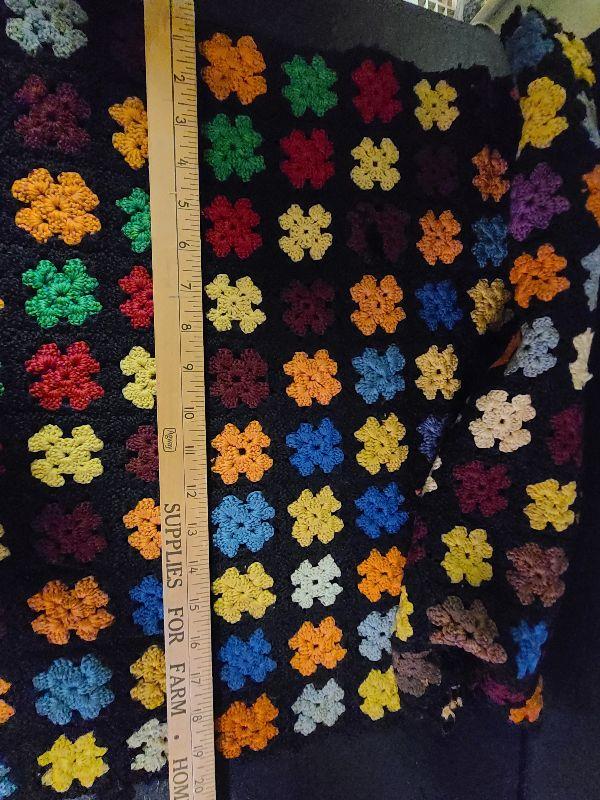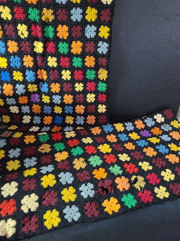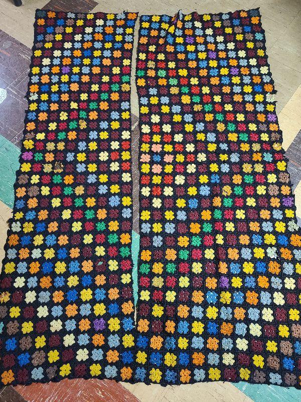 This is an antique handmade crochet blanket that has been cut in half, to use as runner on end of beds for antique look! . It is beautiful, but does show wear. The colors pop! Please see all the pics