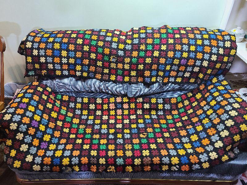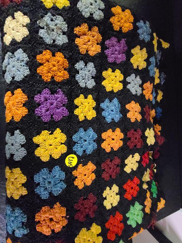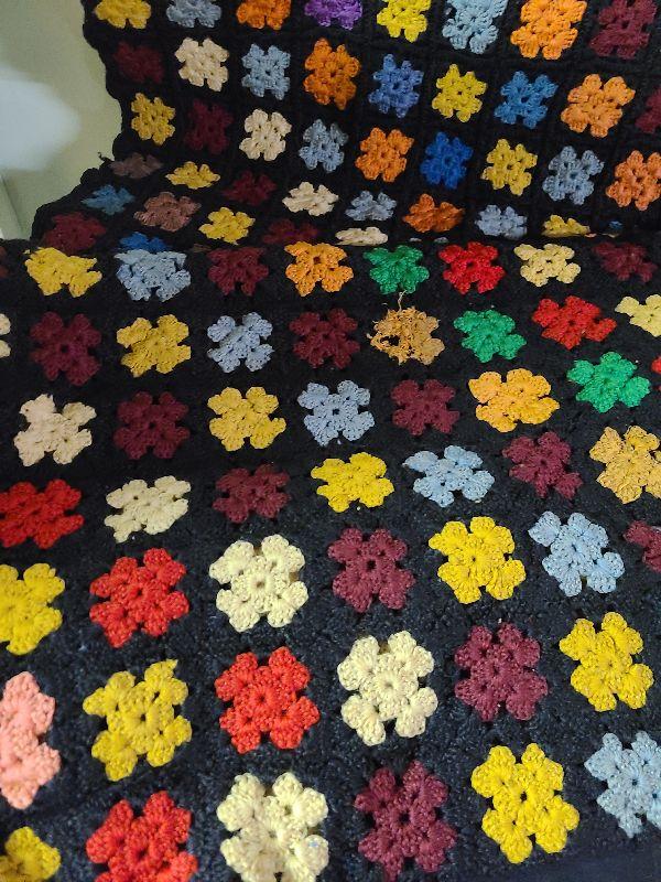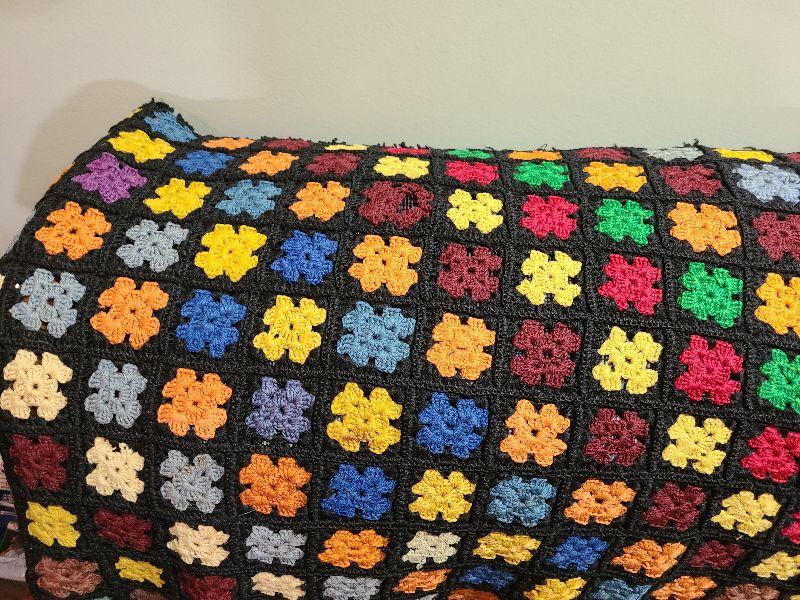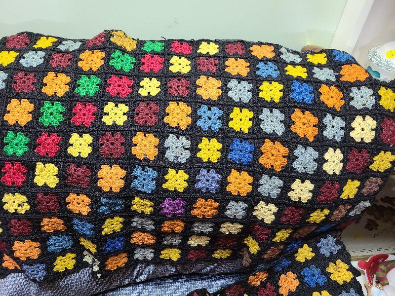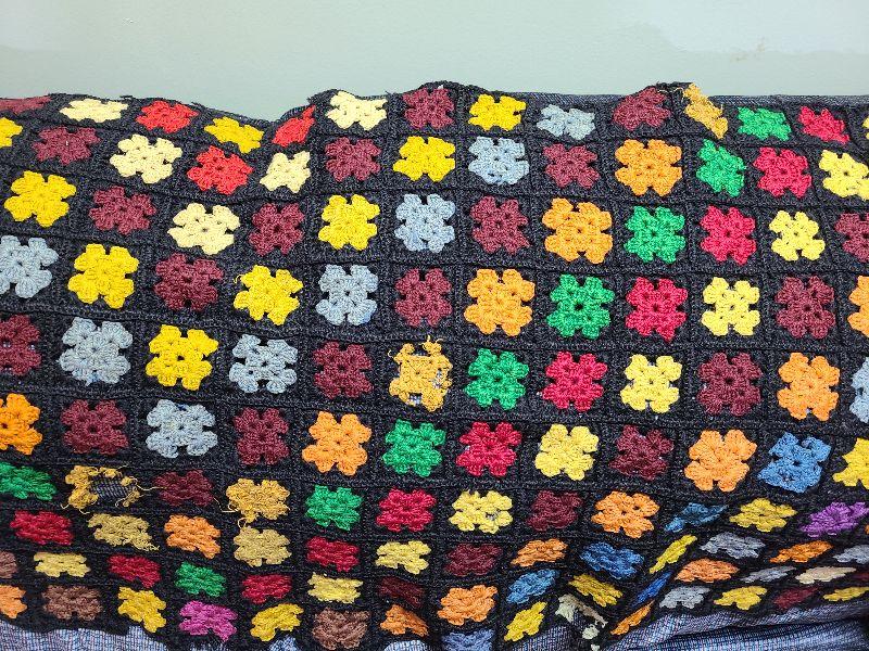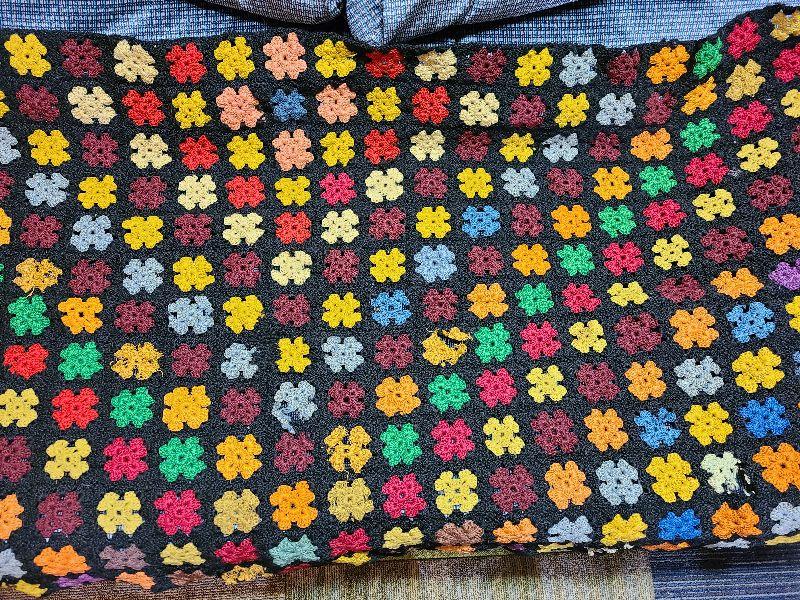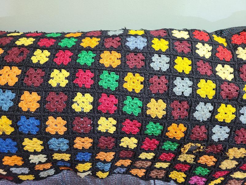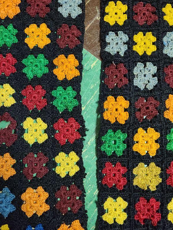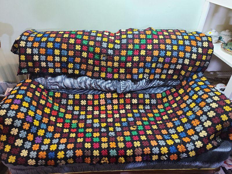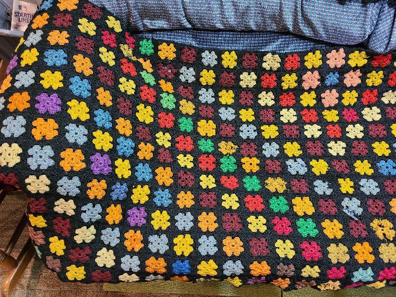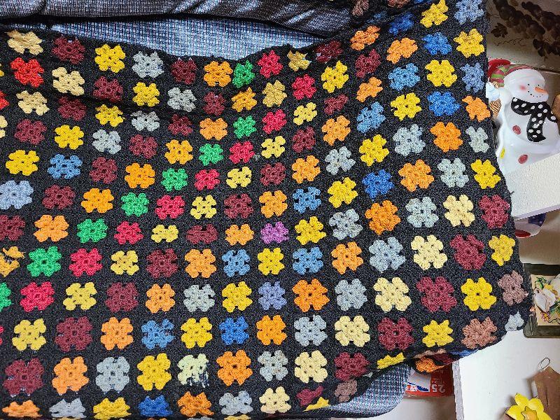 This is an antique handmade crochet blanket that has been cut in half, to use as runner on end of beds for antique look! . It is beautiful, but does show wear. The colors pop! Please see all the pics