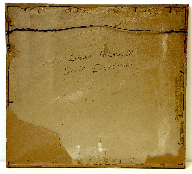 Antique sepia etching engraving by Richard Earlom and John Boydell featuring Claude Le Lorrain, Plate No. 16, circa 1774, in very good condition, frame with glass front. Image - 10.25" x 8.25", frame - 16" x 14" - Rare collector's item!