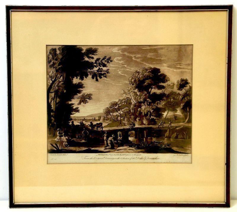 Antique sepia etching engraving by Richard Earlom and John Boydell featuring Claude Le Lorrain, Plate No. 16, circa 1774, in very good condition, frame with glass front. Image - 10.25" x 8.25", frame - 16" x 14" - Rare collector's item!