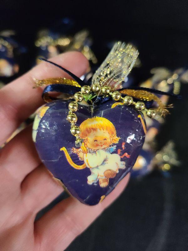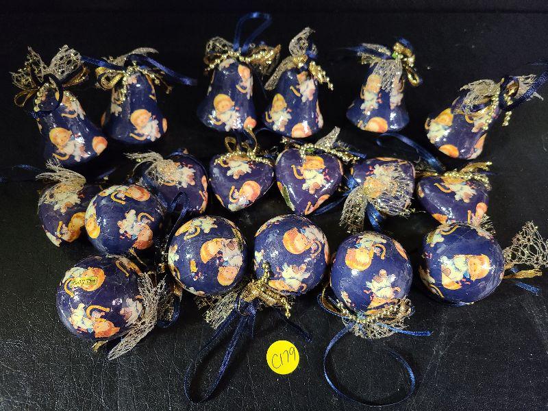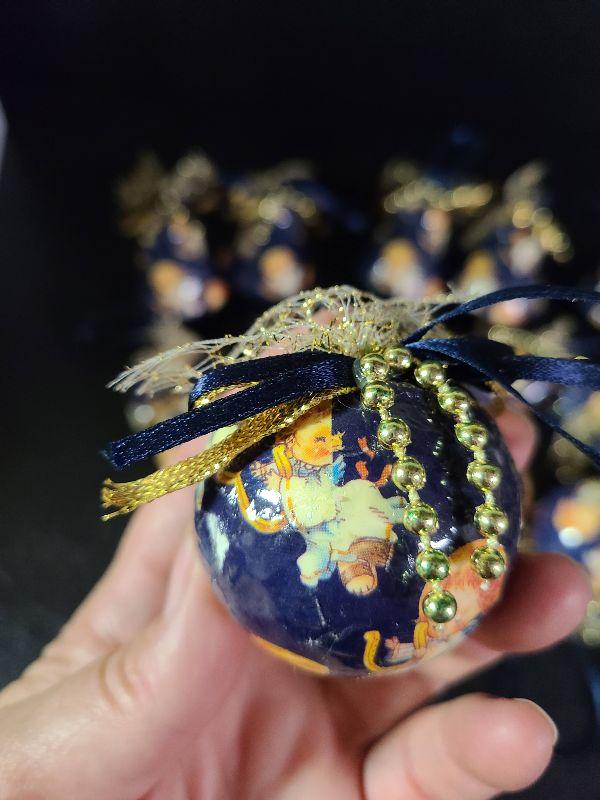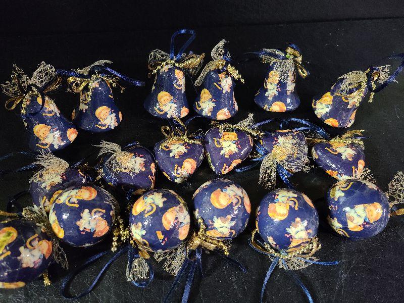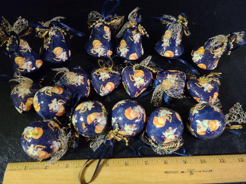 Paper Mache ornament lot, blue with vintage angels. We found more of these after picturing so you will get more than what is pictured. Please see pics for sizing and condition
