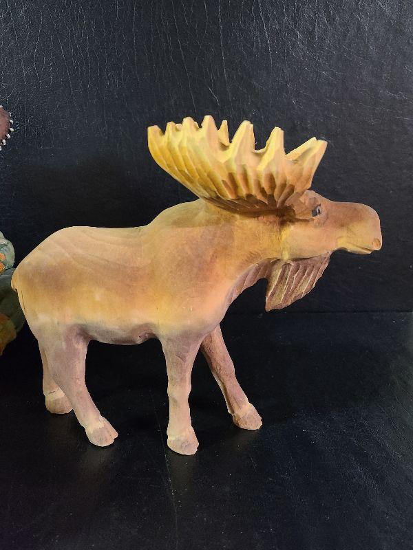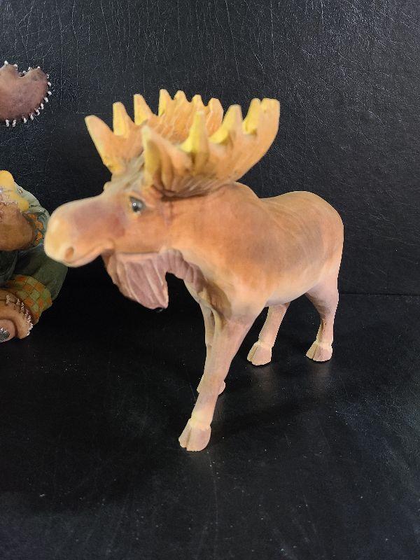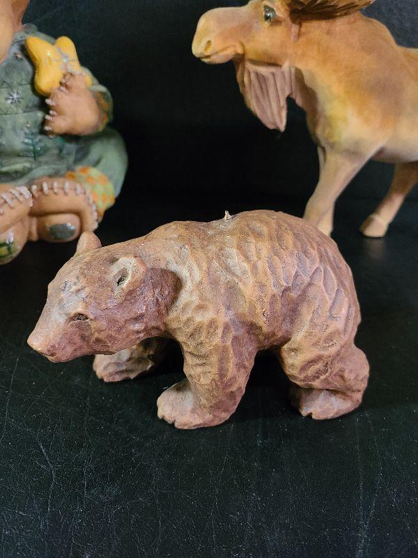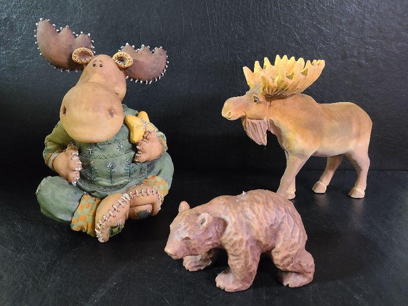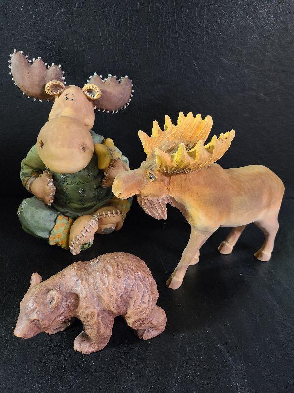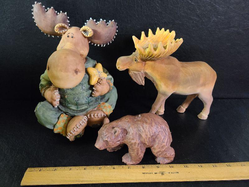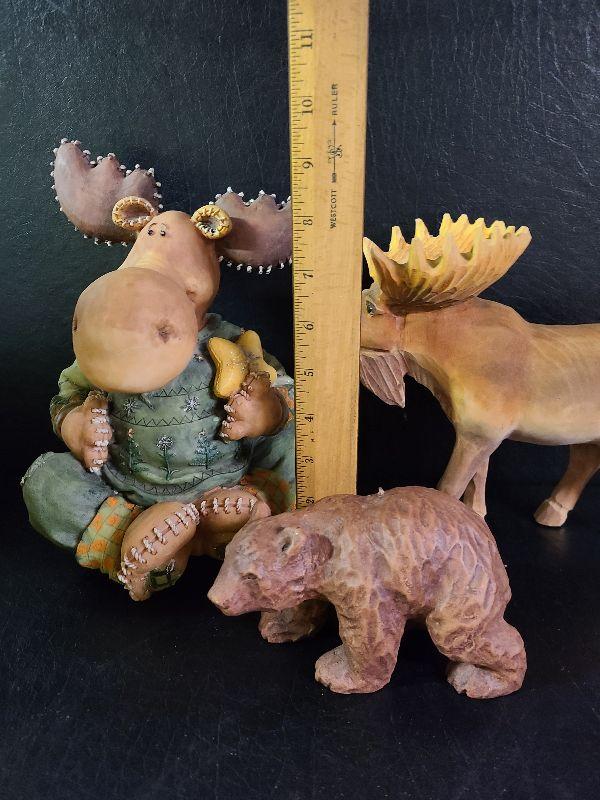 Nice lot of decor for the moose or bear collector. Two are resin but the standing moose is carved wood! Please see pics for sizing and condition