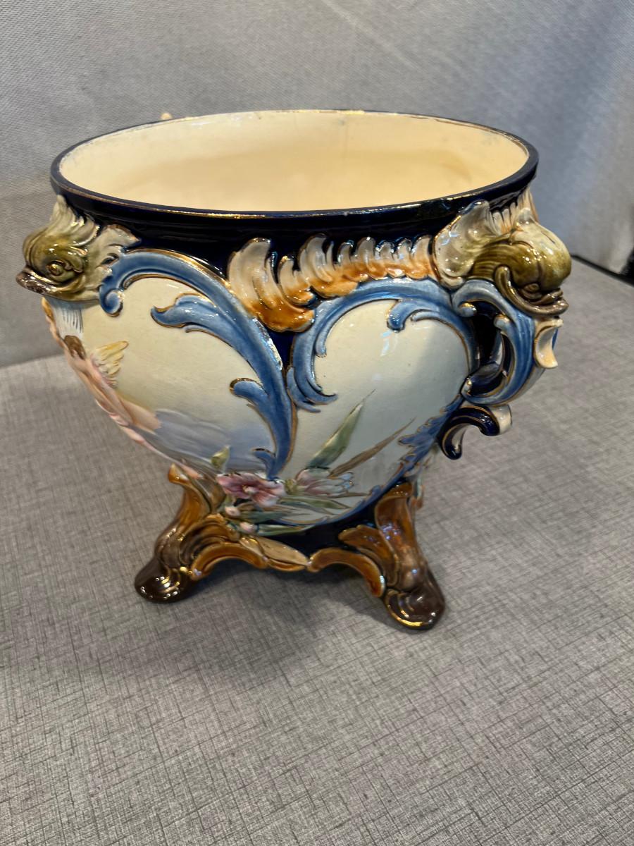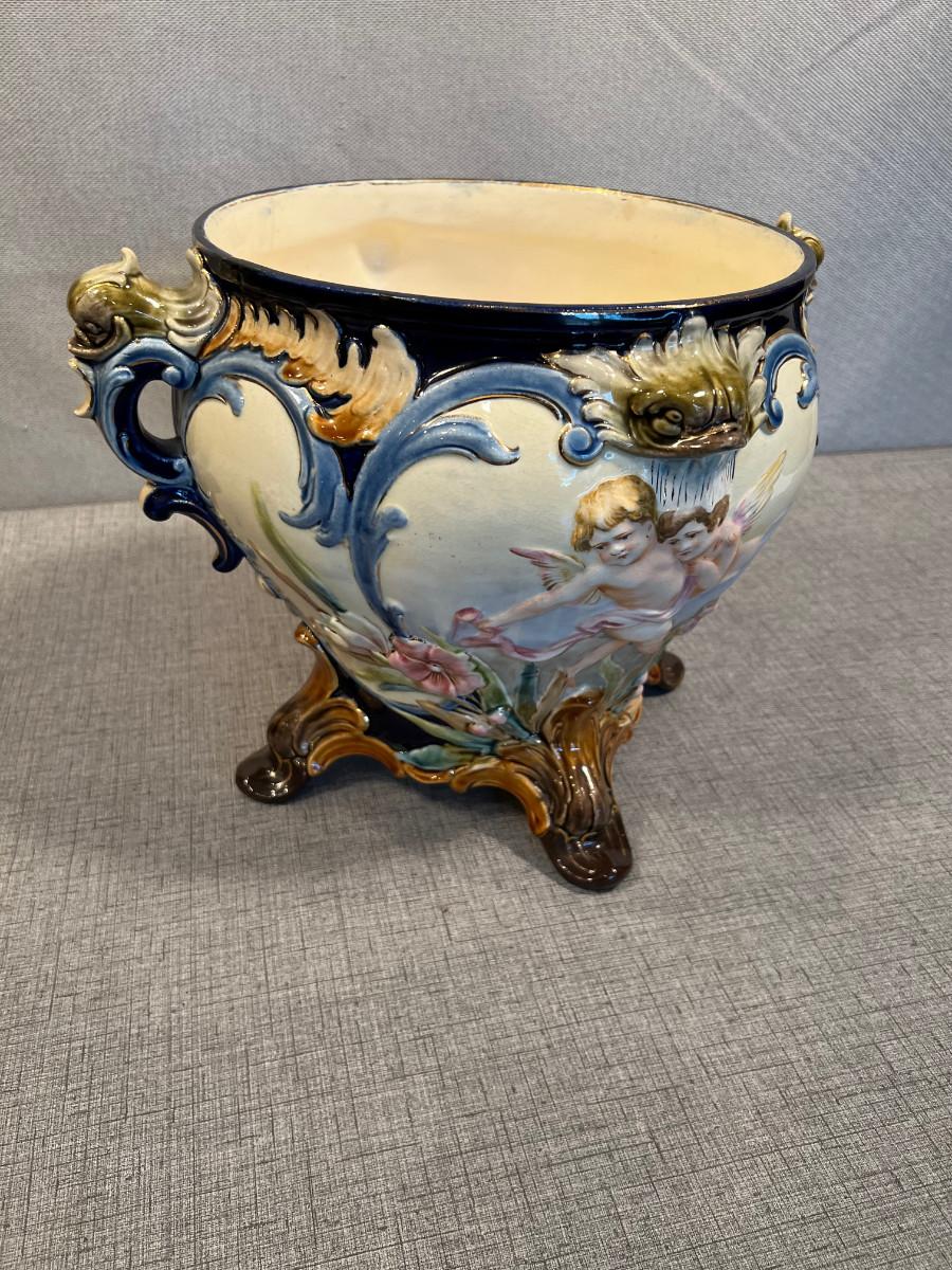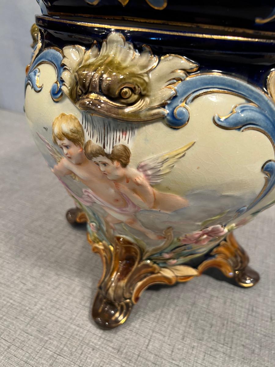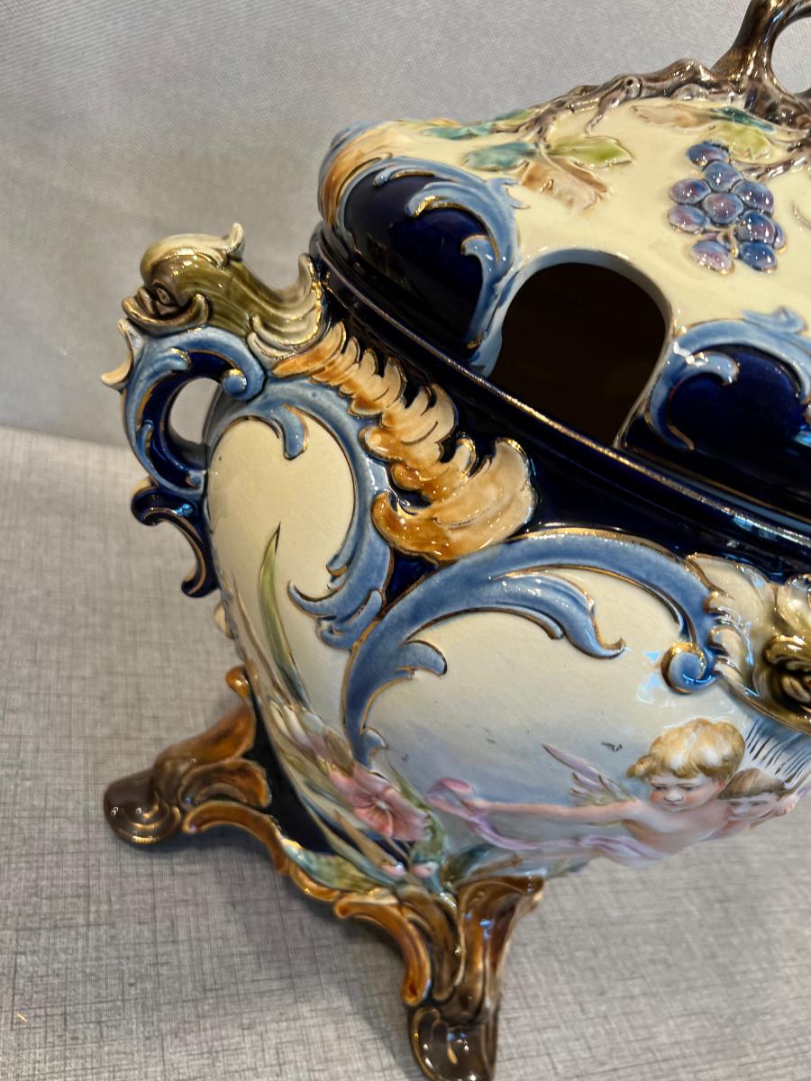 C.1890 Majolica Soup Tureen Cherubs, Fish, Grape Leaves. 18" tall over all 15" diameter. No ladle. Most likely English.