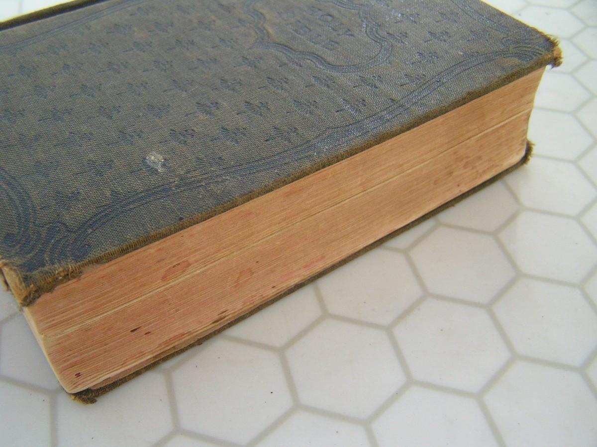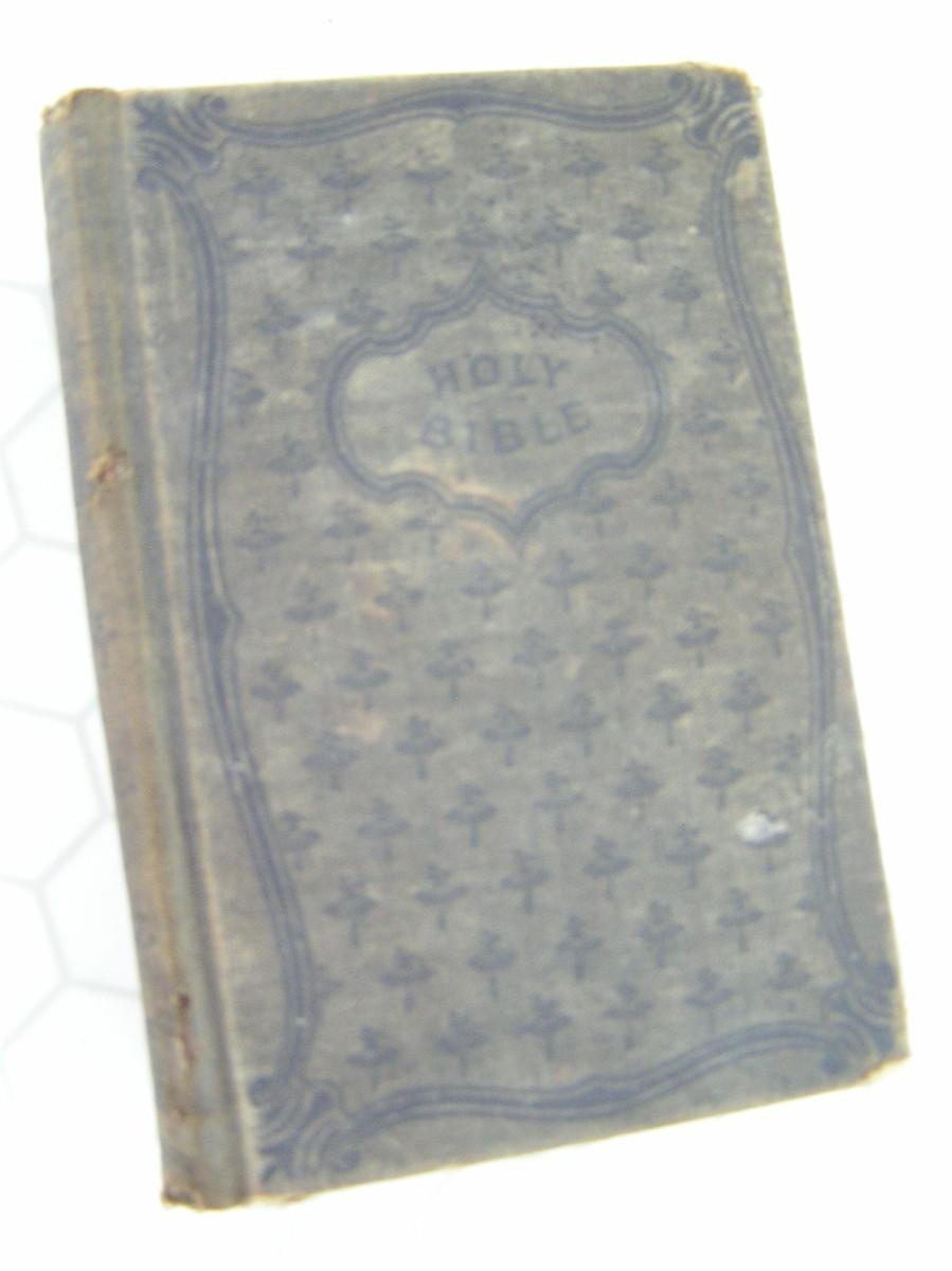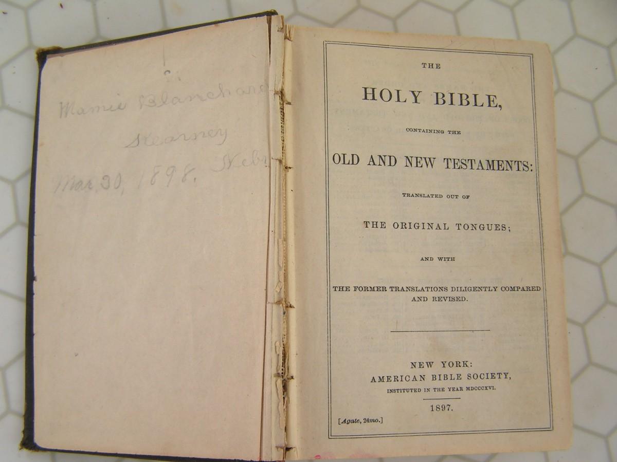 C.1897-98 Holy Bible. Hand written inside flyleaf: Mamie Blanchard Kearney Nebr. Mar. 30, 1898. Printed by: American Bible Society, New York, Instituted in the year MDCCCXVI and below that is printed 1897. Personal size edition, fabric covered hard cover. About 4"x5-3/4"x1-1/2" thick. It’s had a lot of use but the pages are still in good legible condition with tiny, tiny print. Overall fair to good condition.