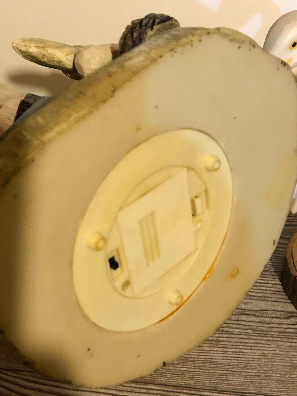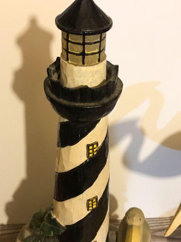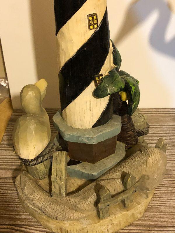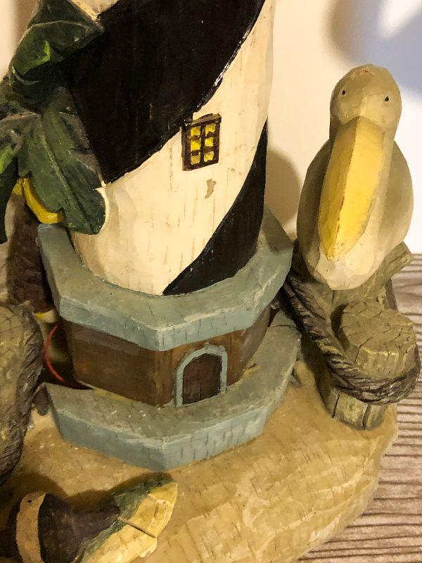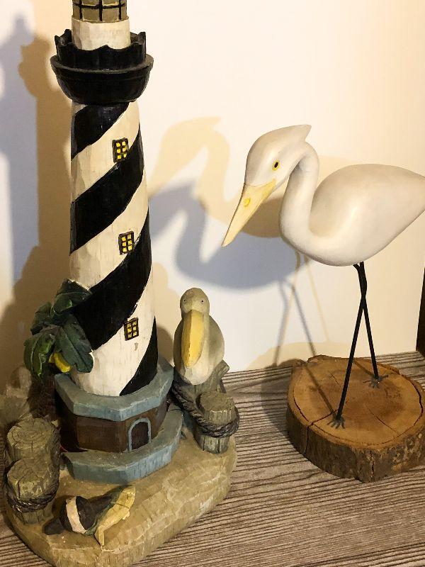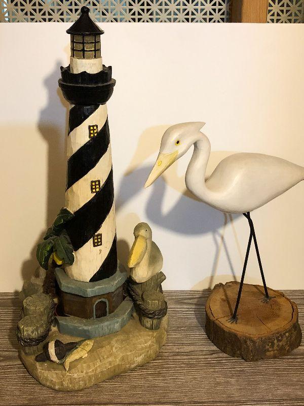 Lighthouse that when turned on makes beach sound and artist made crane art. Please see all pics for size and condition. Thank you for looking and have fun bidding.